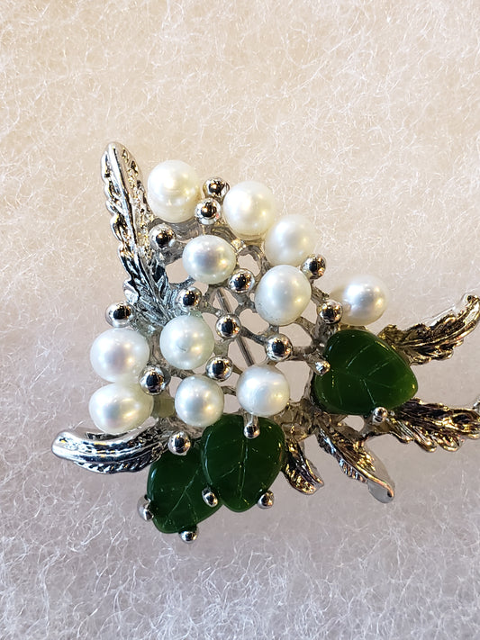Vintage brooch jade cluster with white beads