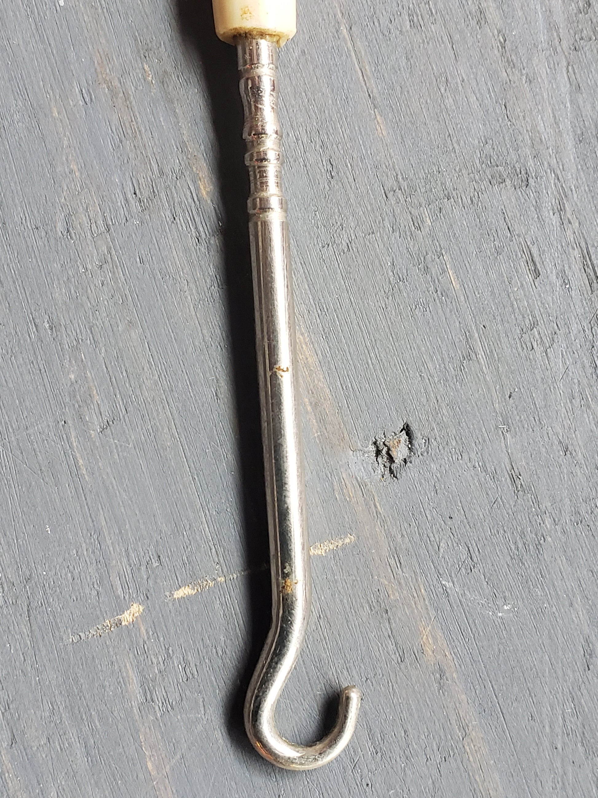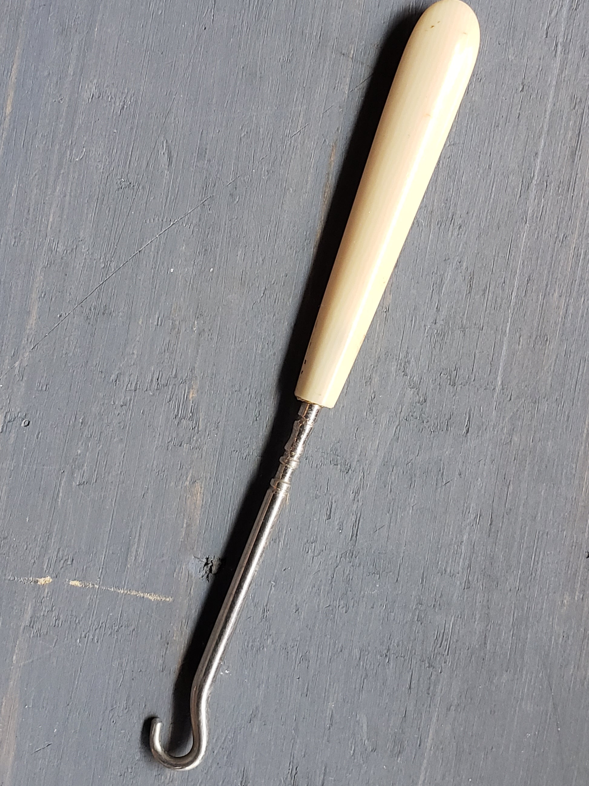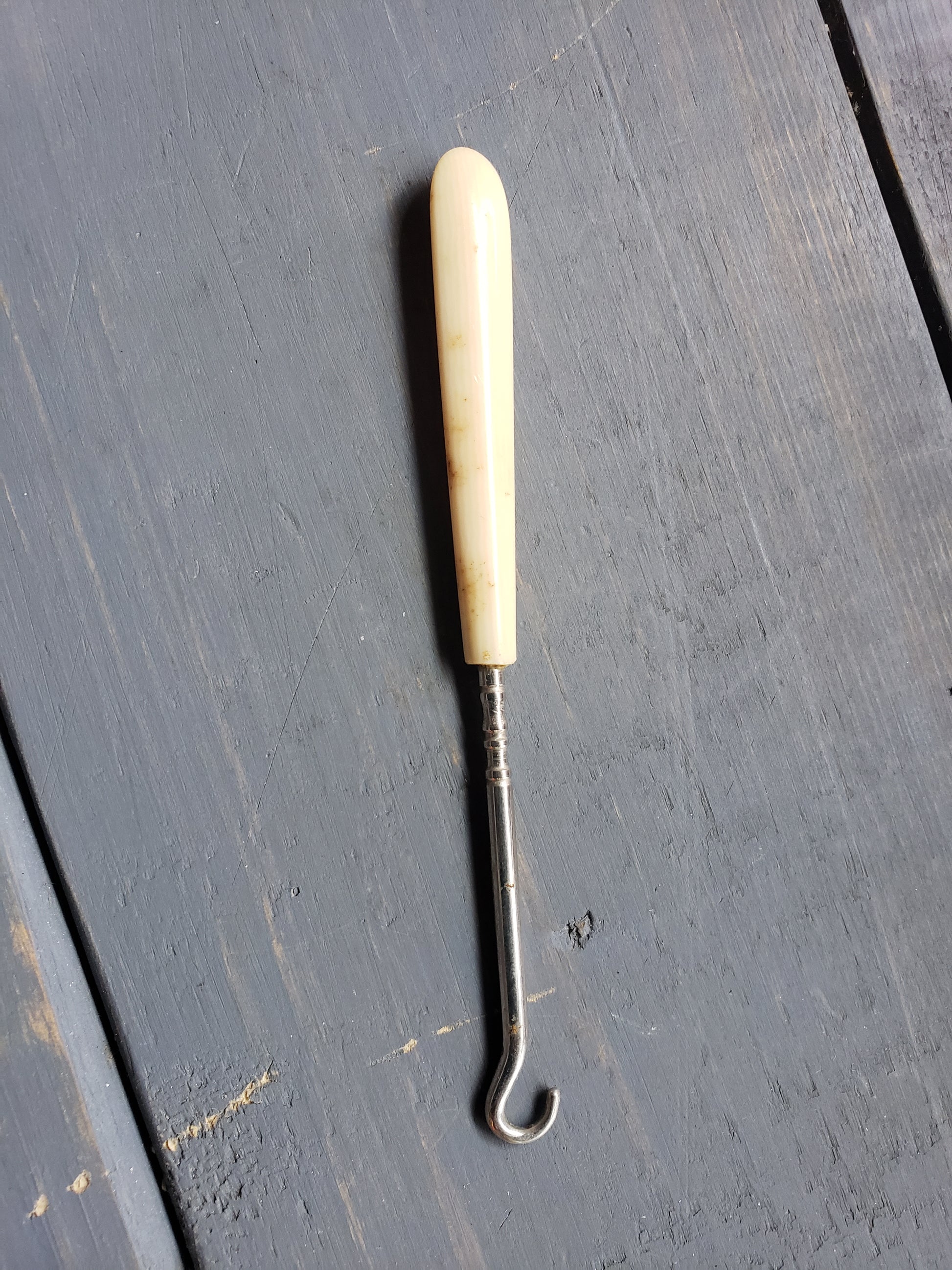 The 1920s Celluloid Button Hook is a handy tool designed to simplify the process of fastening buttons. Perfect for vintage clothing enthusiasts, this classic accessory combines practicality with timeless design to enhance your wardrobe routine. They were also used to lace up granny style boots. Pre owned, in fair vintage condition.