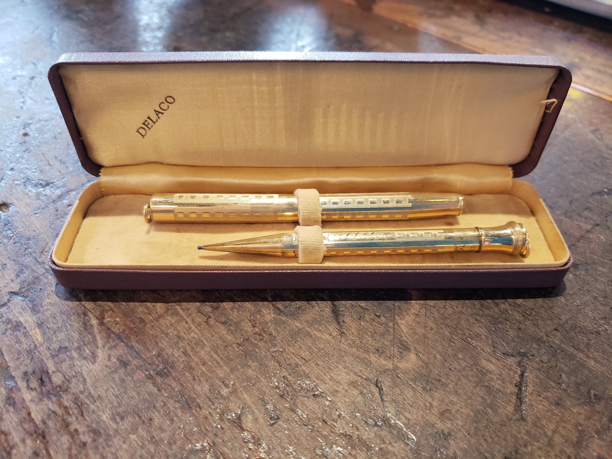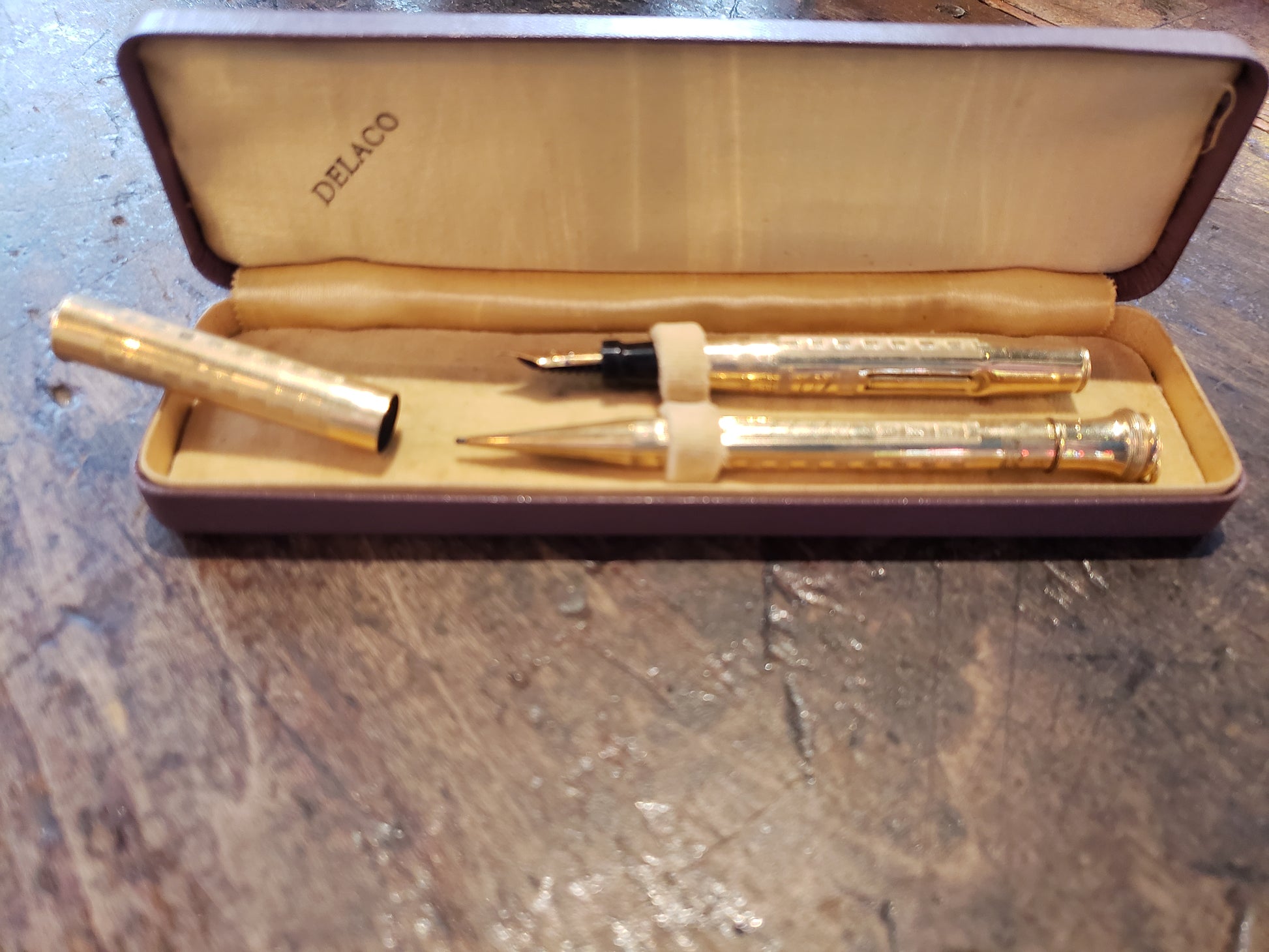 Step back in time with this elegant 1920's DELACO pencil and pen set, crafted with gold-filled detailing and patent pending design. This vintage writing set offers the classic charm of an ink-dip pen, perfect for those who appreciate traditional craftsmanship. Despite being previously owned and used, it remains a timeless piece, complete with its original hinged box—ideal for collectors or anyone seeking a distinctive writing experience with historic flair.