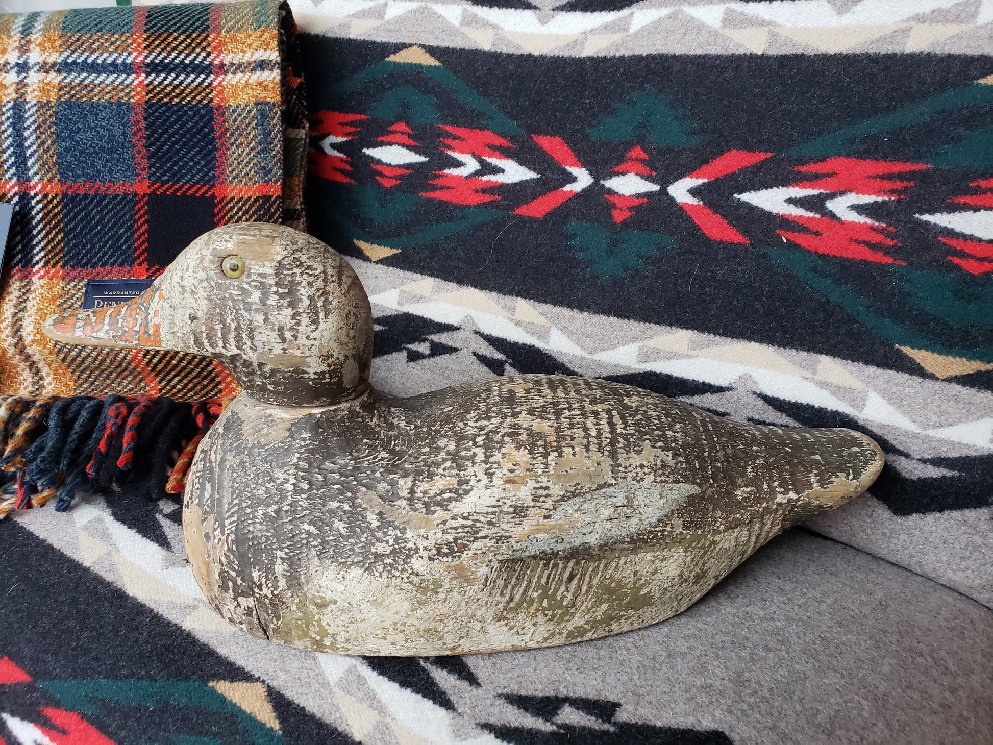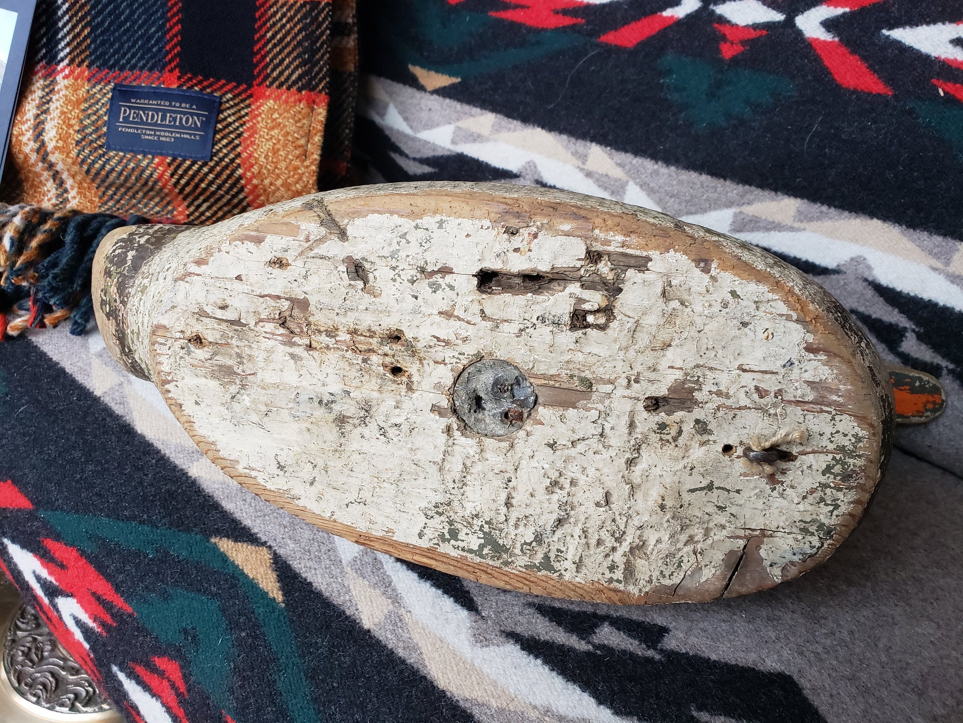This authentic vintage duck decoy showcases masterful hand-carved craftsmanship, featuring realistic glass eyes that capture the character of a waterfowl in its natural habitat. Weighted with lead in the underbelly, it maintains perfect stability in water, making it ideal for collectors and hunters alike. A timeless piece that blends functional design with artistic appeal, this decoy represents a cherished tradition of American folk art and outdoor heritage.