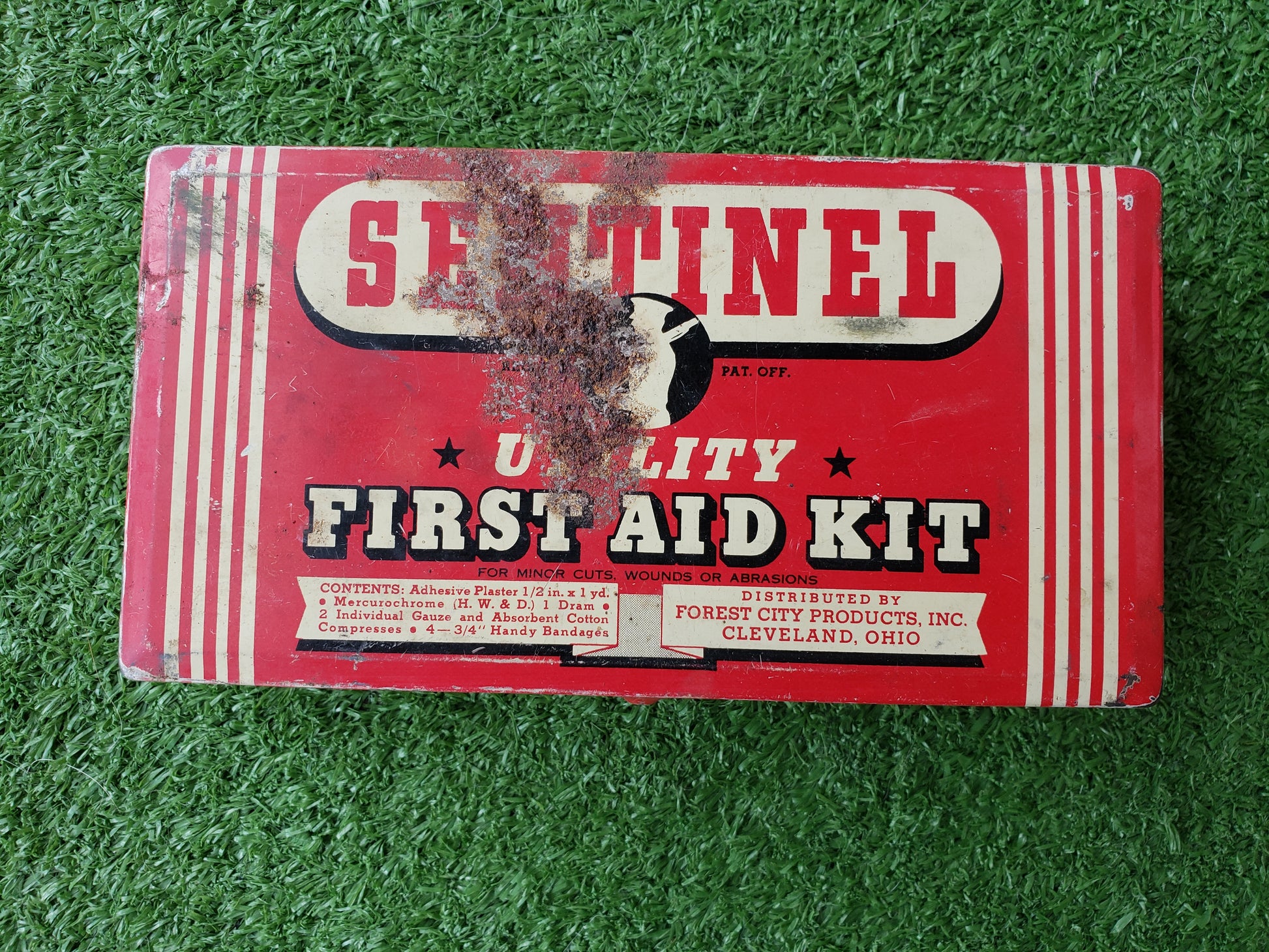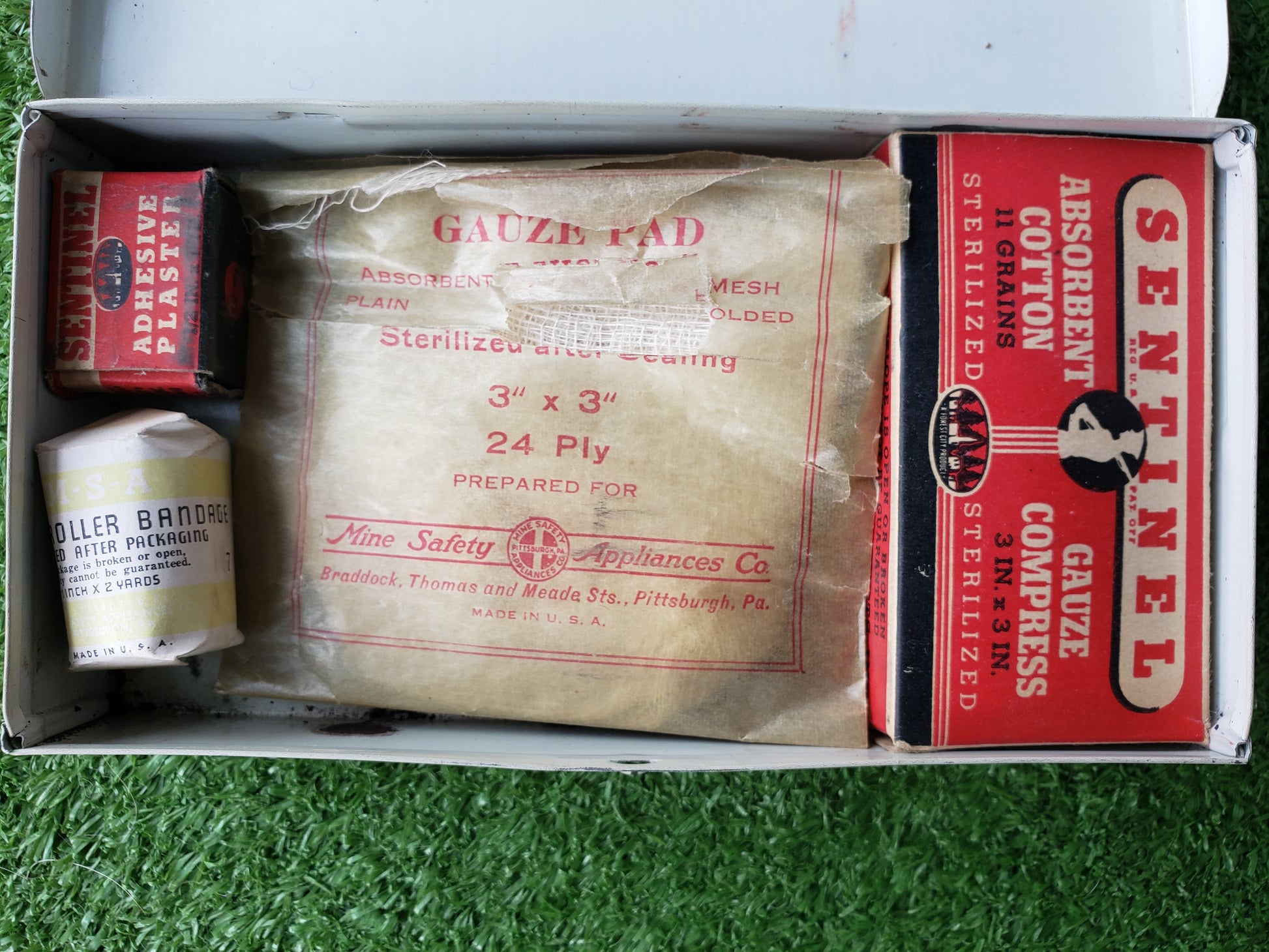 Step back in time with this 1940s Sentinel Utility First Aid Kit, featuring select original supplies like an absorbent cotton compress, gauze pad, roller bandage, and adhesive plaster. Despite some rusty spots, it remains a fascinating piece of vintage medical history. Its fair condition and classic contents make it a unique collectible, perfect for enthusiasts of authentic wartime memorabilia or vintage medical gear. Add a tangible piece of the past to your collection with this well-preserved first aid kit.