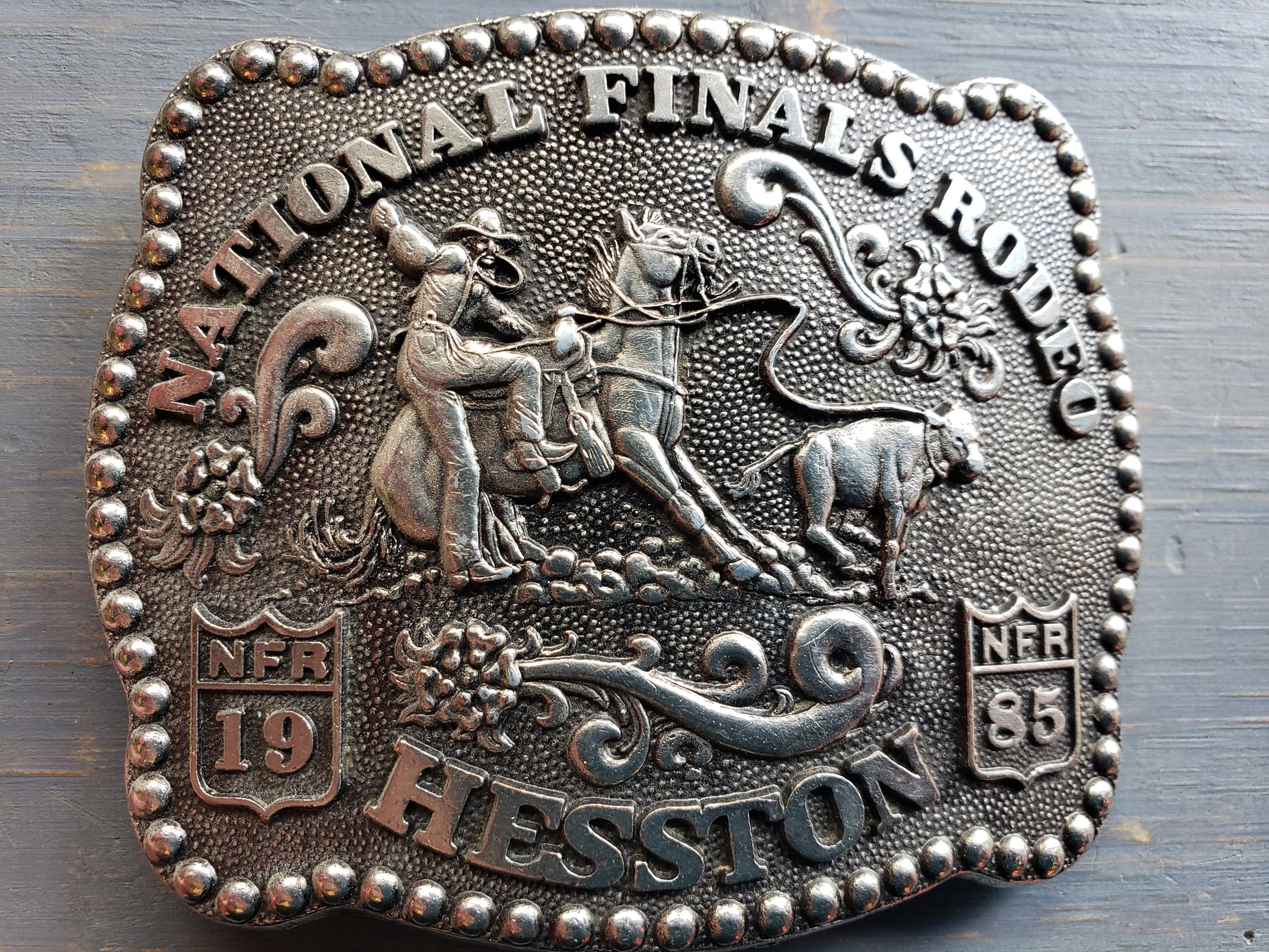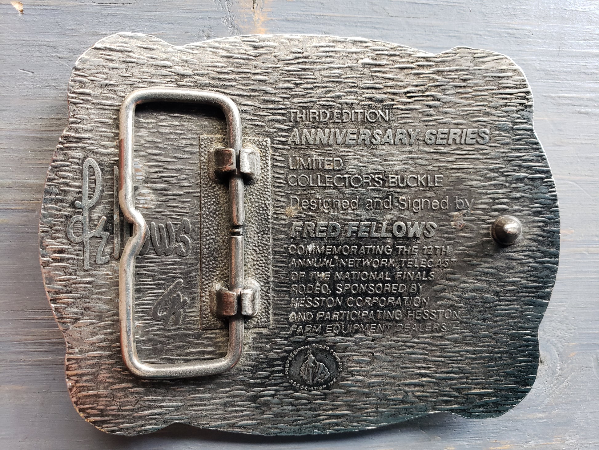 1985 National Finals Rodeo belt buckle, Third Edition Anniversary Series by Fred Fellows. Limited collector's buckle sponsored by HESSTON. Fair vintage condition. Bring home a piece of rodeo history today.
