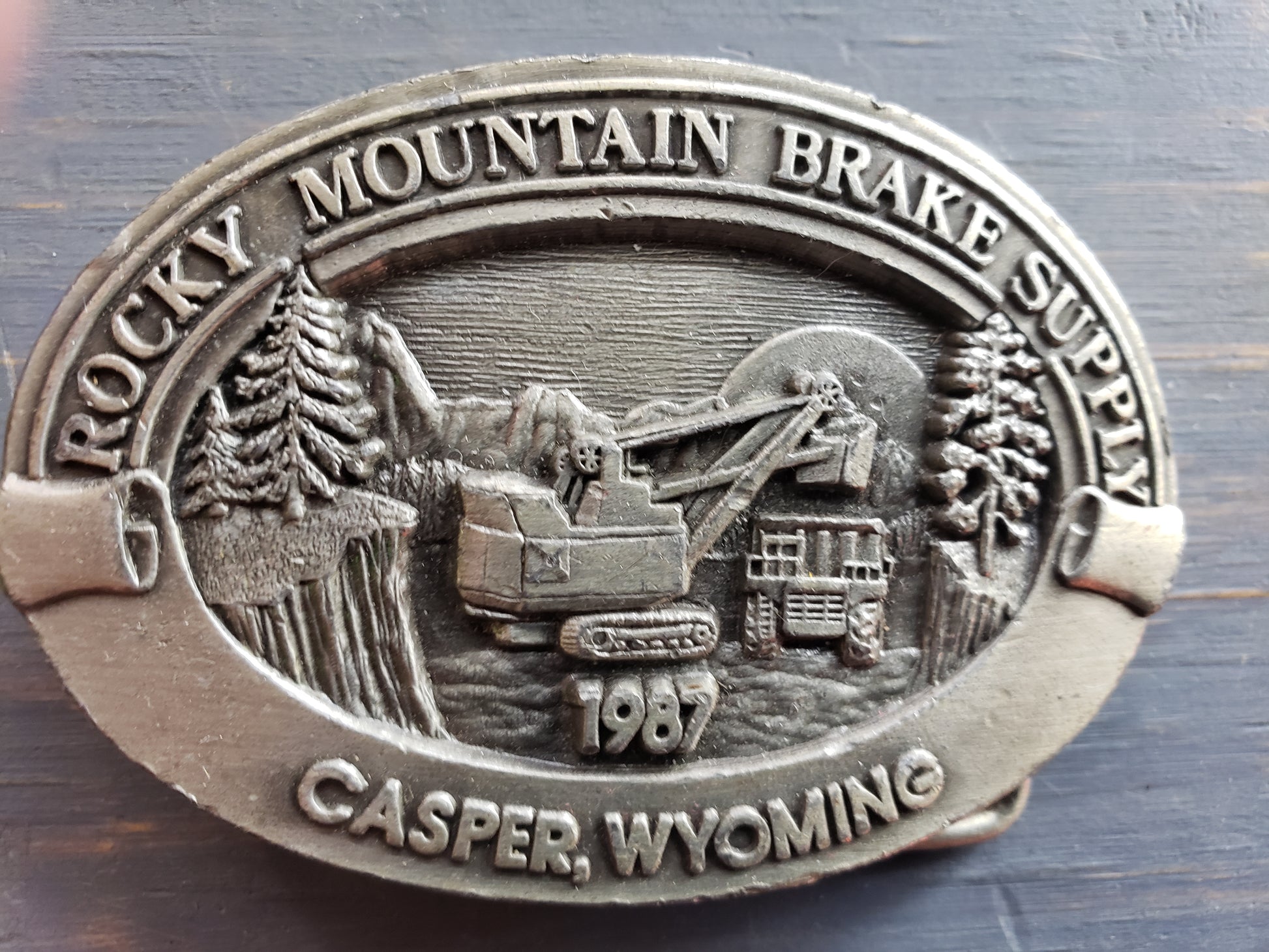 This limited edition 1987 Rocky Mountain Brake Supply belt buckle features detailed raised images of a forest, canyon, and mining equipment, capturing the rugged spirit of the Rockies. One of only 500 made, this vintage piece is a rare collectible that adds character and history to your wardrobe. Previously owned and in fair condition, it offers authentic charm for enthusiasts and collectors alike. Don’t miss the chance to own a unique symbol of mountain heritage.