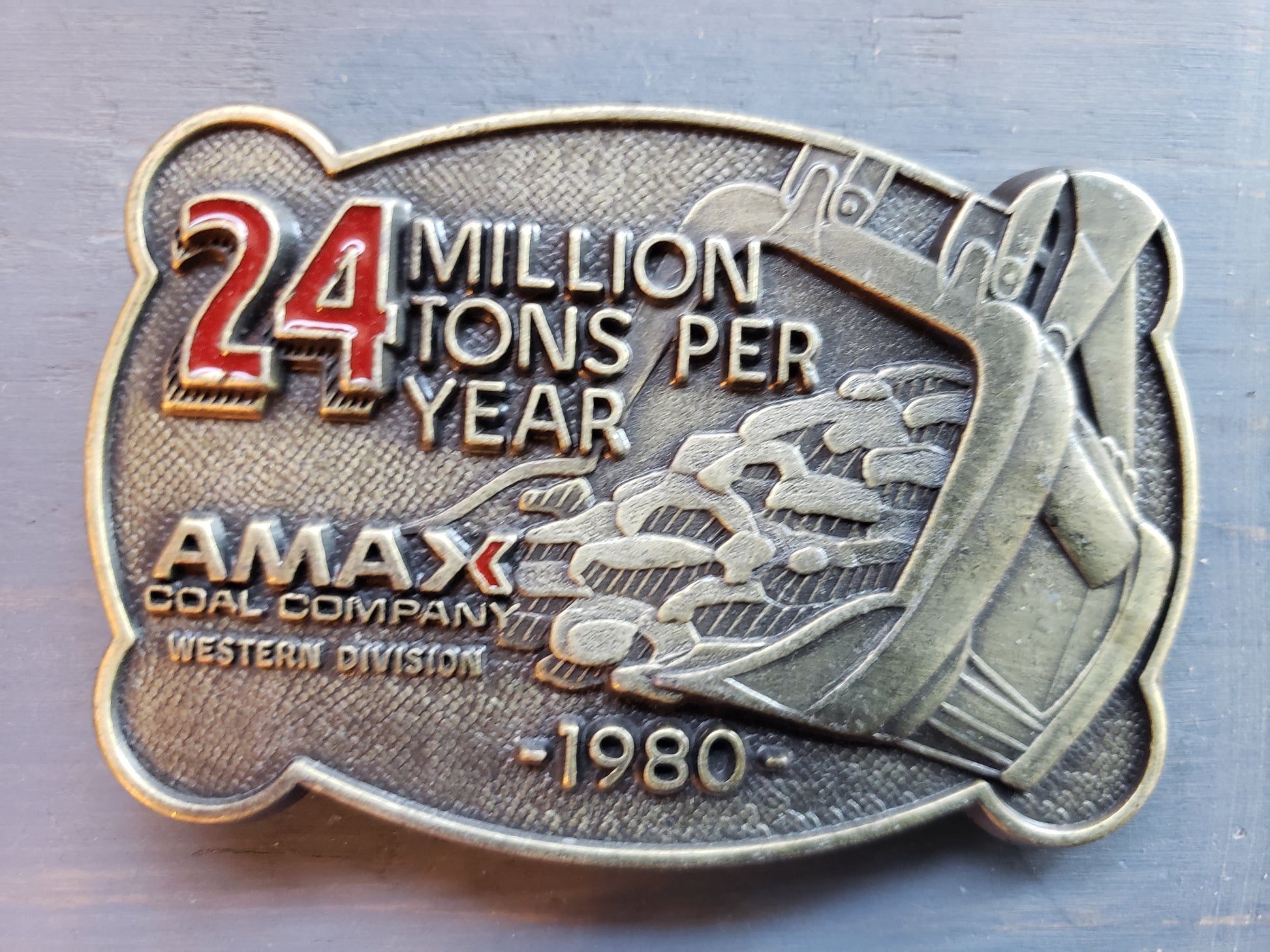 This solid brass belt buckle proudly showcases the AMAX Coal Company, highlighting its impressive production of 24 million tons per year in 1980. Crafted for durability and style, it’s a unique collectible that celebrates industrial strength and heritage. Perfect for enthusiasts and collectors alike, this buckle combines historical significance with everyday wearability. Pre owned, in fair vintage condition.