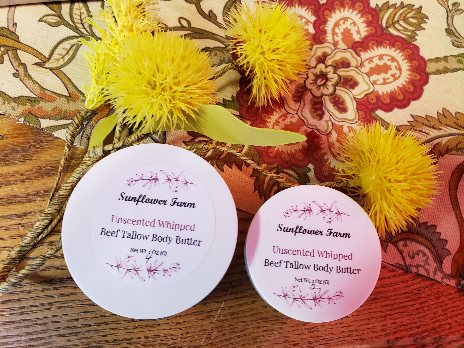 Experience the luxurious indulgence of Sunflower Farms' handcrafted Beef Tallow Body Butter from Rozet, Wyoming.
