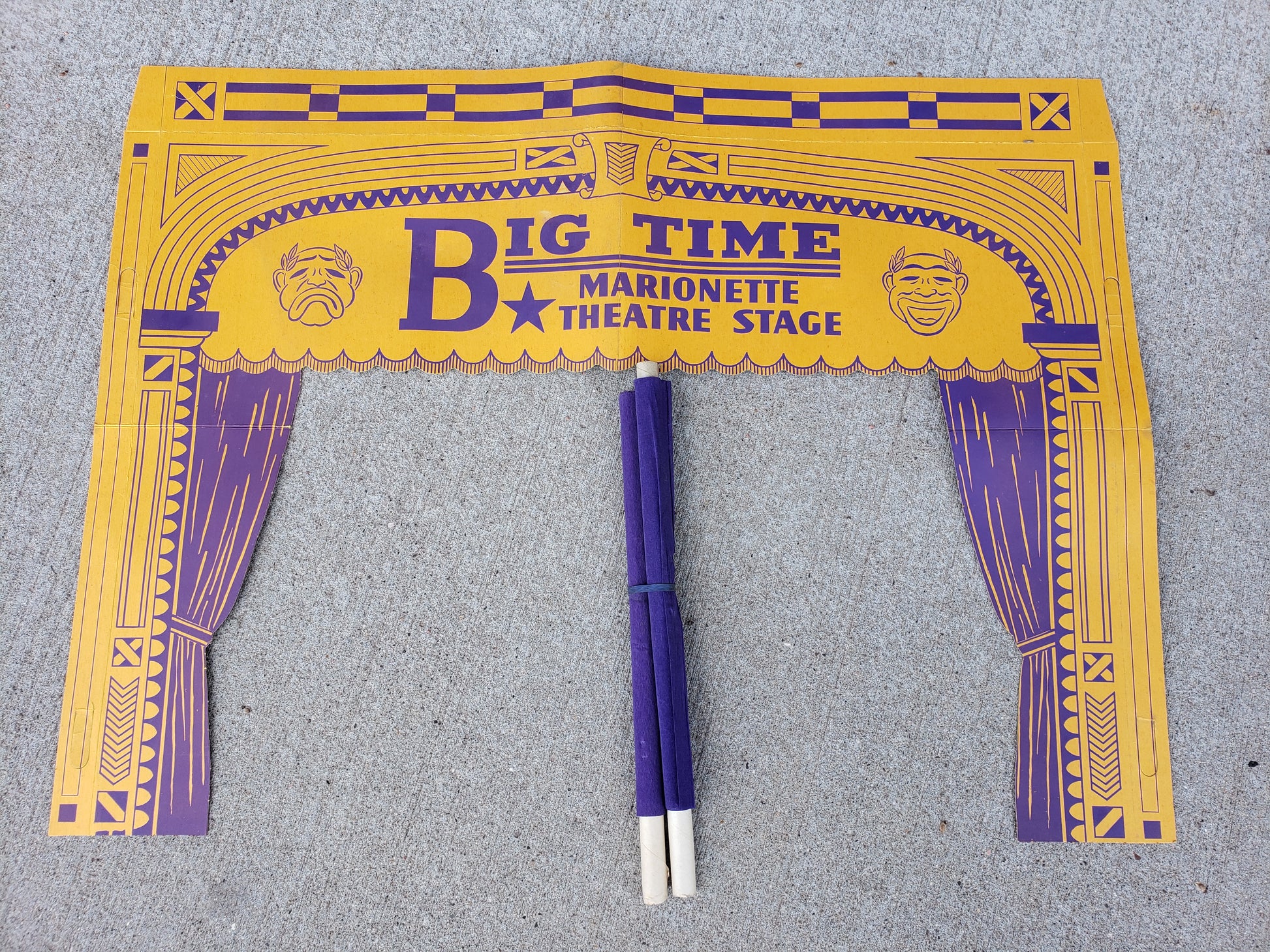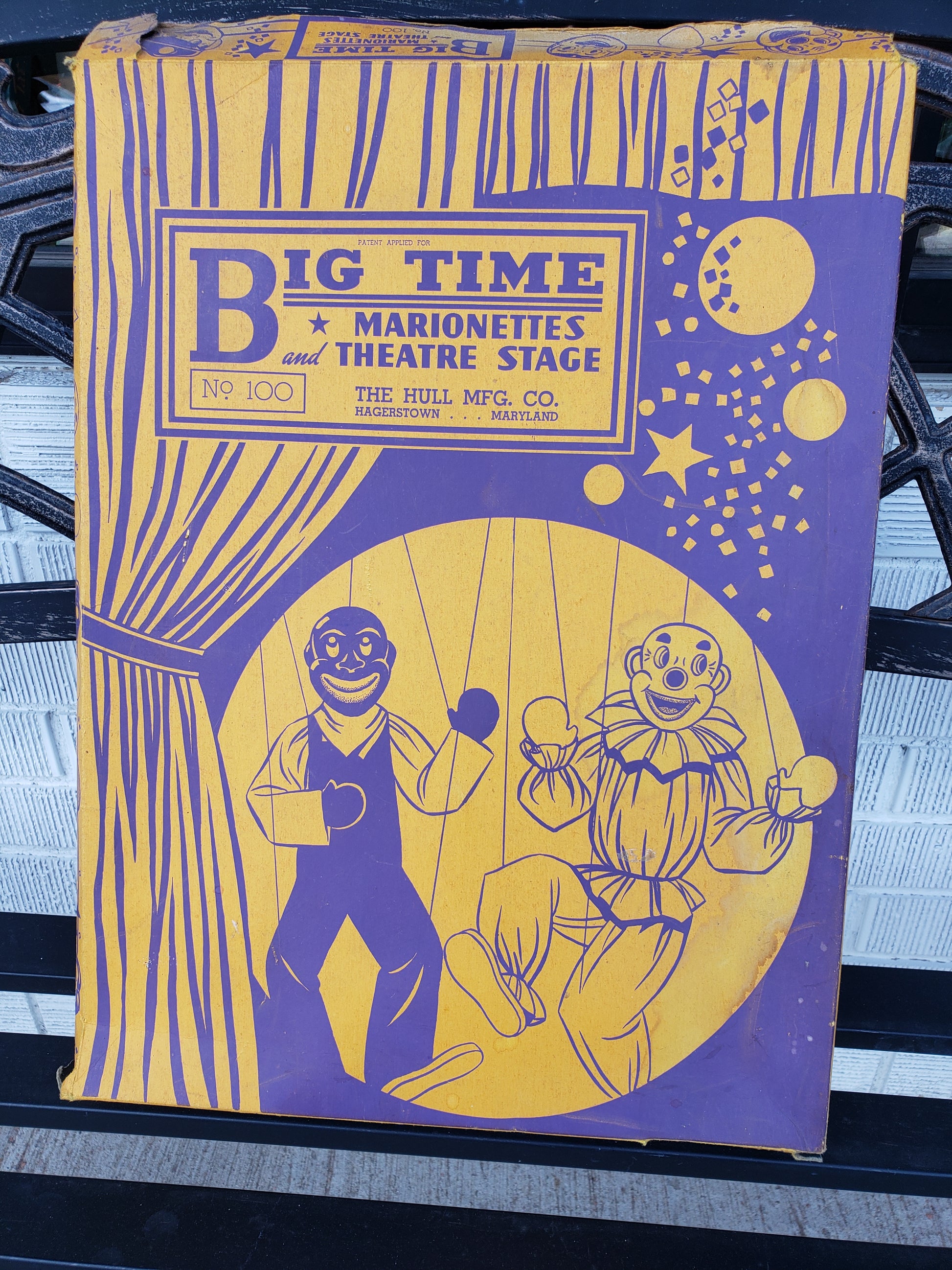 Step back into the charm of the late 1930s with this authentic Big Time Marionettes and Theatre Stage set, complete in its original box. Crafted by Hull Mfg. Co of Hagerstown, Maryland, this vintage collectible features a cardboard purple and yellow pop-up stage with a purple curtain, perfect for nostalgic puppet performances. Despite minor water damage on the box, the set remains a rare treasure for collectors and enthusiasts alike, offering a unique glimpse into classic entertainment history. Add this timeless piece to your collection and bring vintage magic to life.