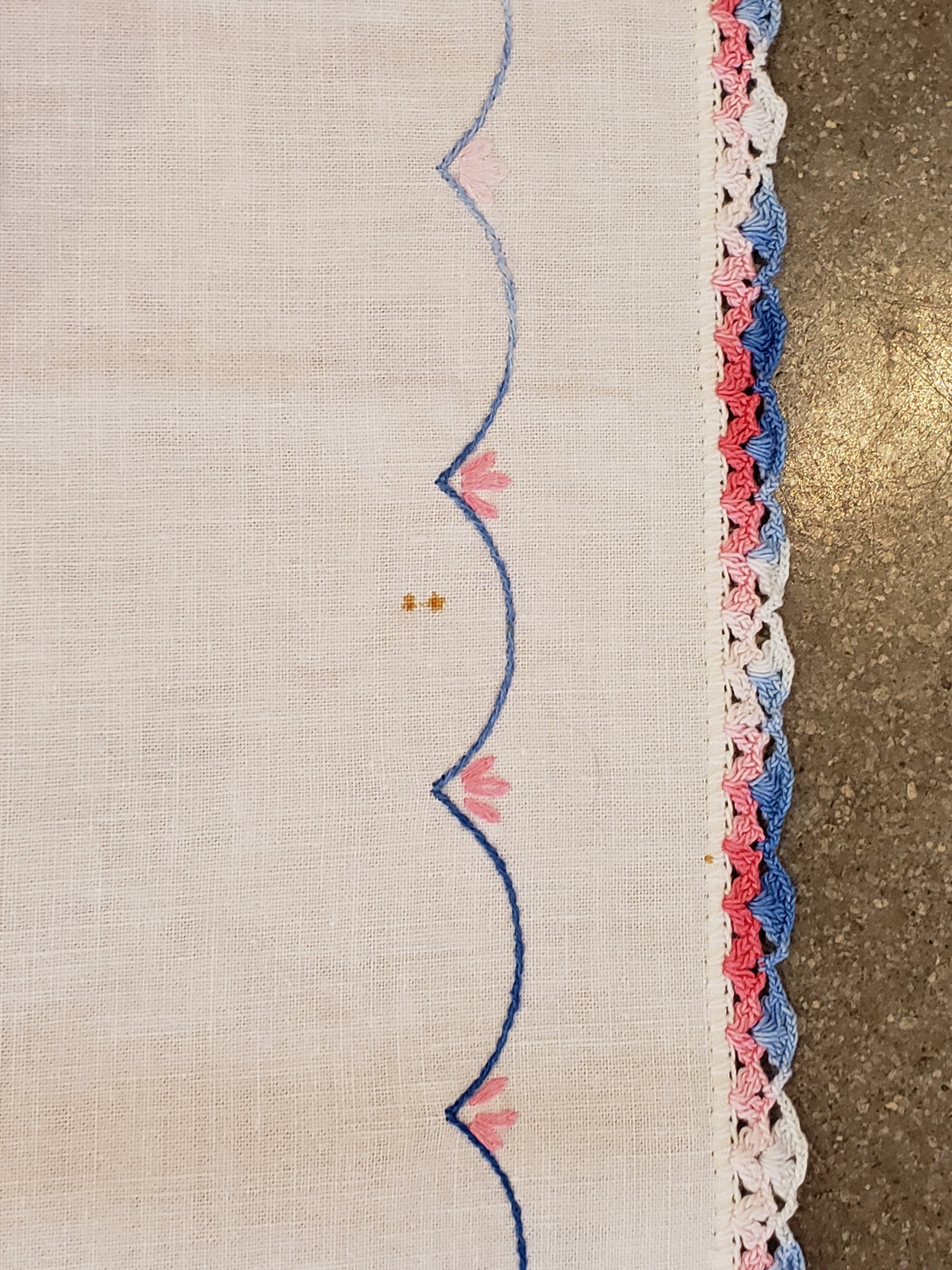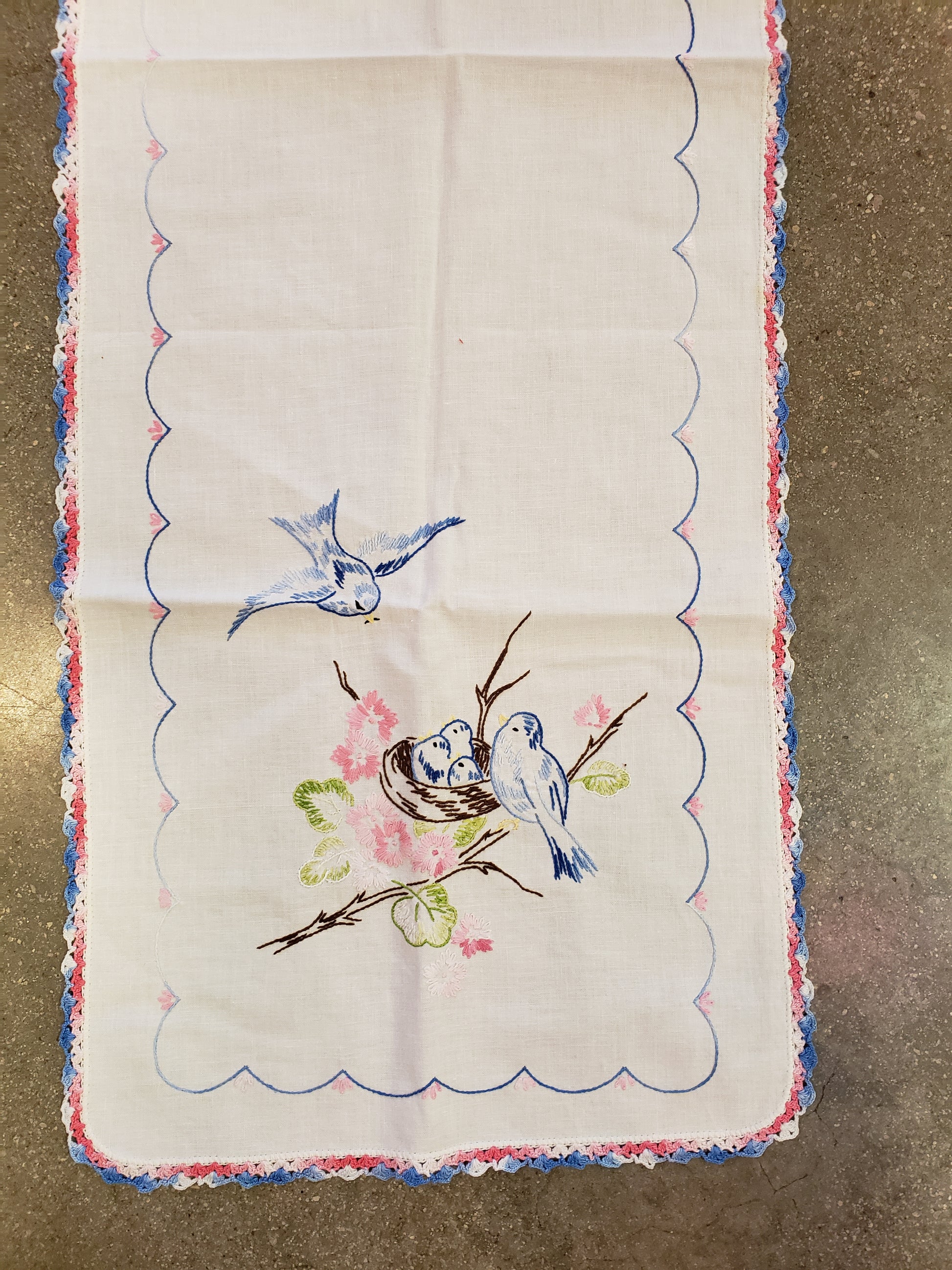 Add a charming touch to your table with this vintage Bluebirds embroidered runner, framed by a sweet pink and blue crochet border. Measuring 14.25 by 42 inches, it’s perfect for brightening up your space with a dash of retro love. A couple of tiny rust spots add character but don’t steal from its great condition. Let this cheerful piece bring a flutter of vintage whimsy to your home!