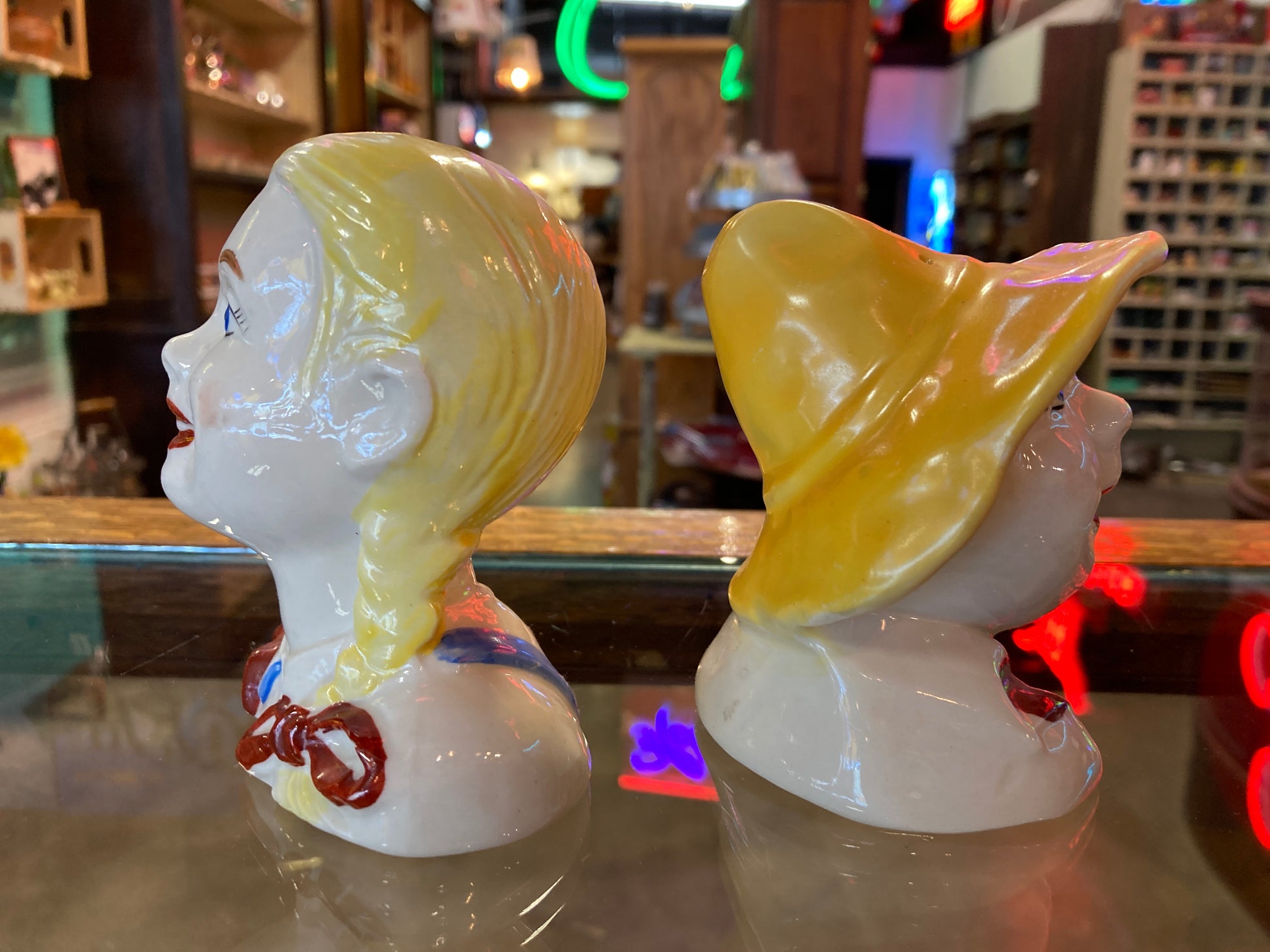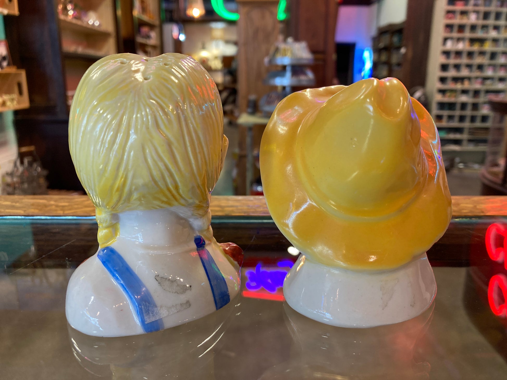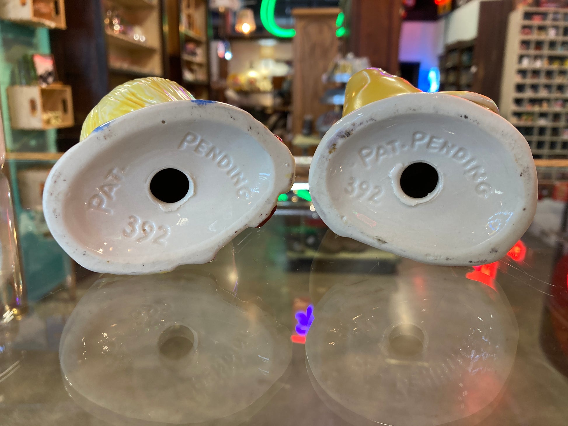 "Old MacDonald" boy and girl salt & pepper shaker set. In fair vintage condition. Both are 4 inches tall. Collectors items. Pat. Pending 392 is on the bottom of shakers.