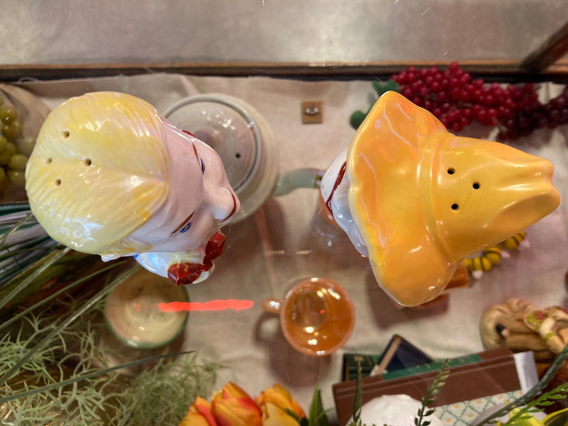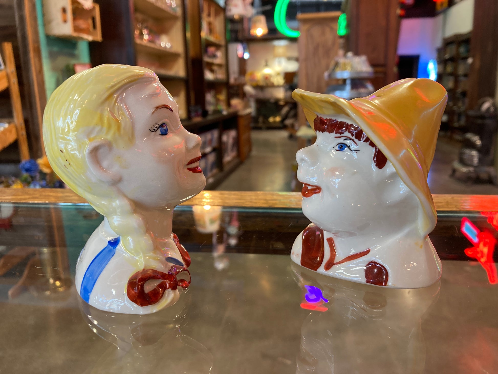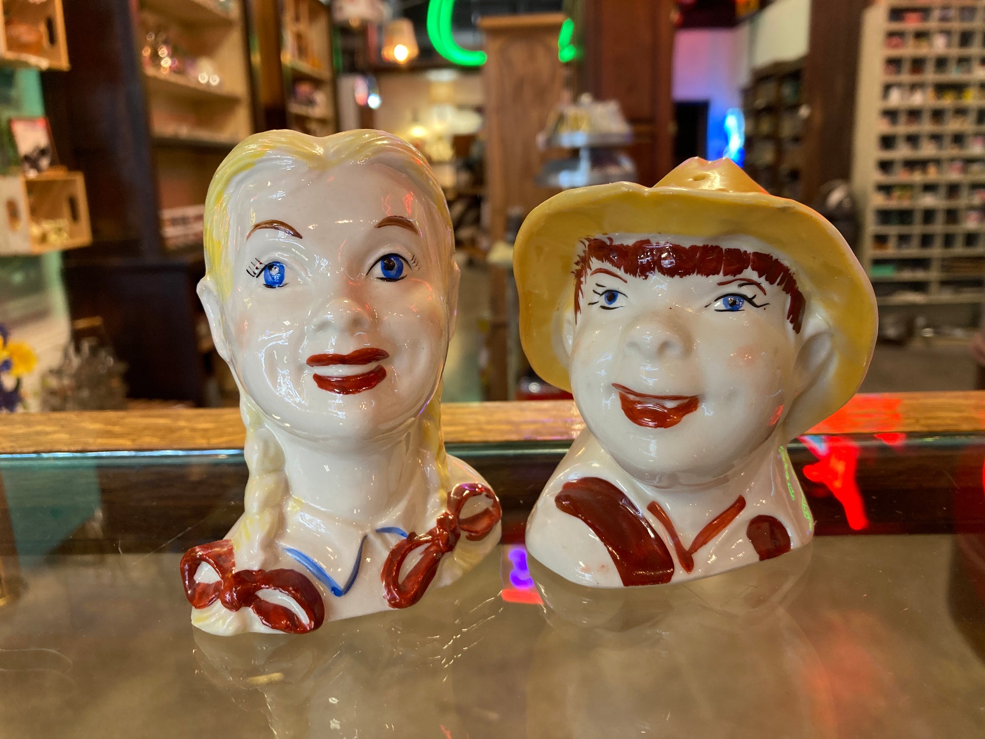"Old MacDonald" boy and girl salt & pepper shaker set. In fair vintage condition. Both are 4 inches tall. Collectors items. Pat. Pending 392 is on the bottom of shakers.