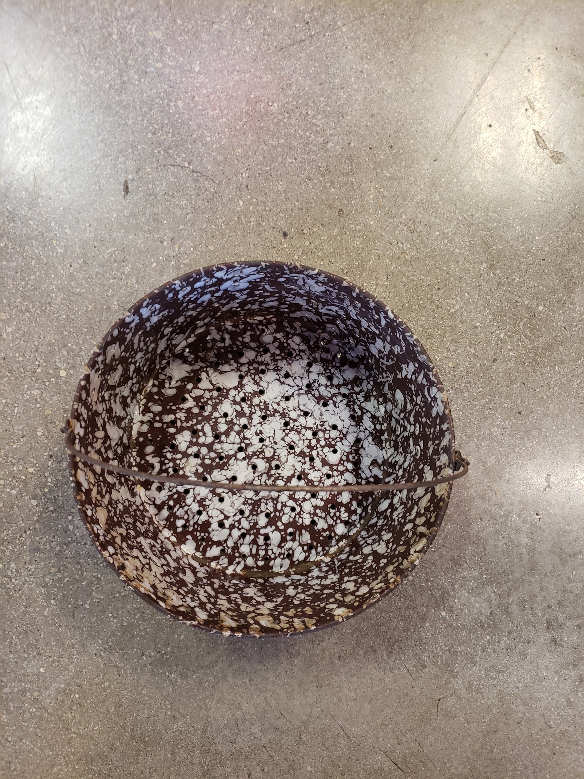 Brown White enamelware strainer with handle