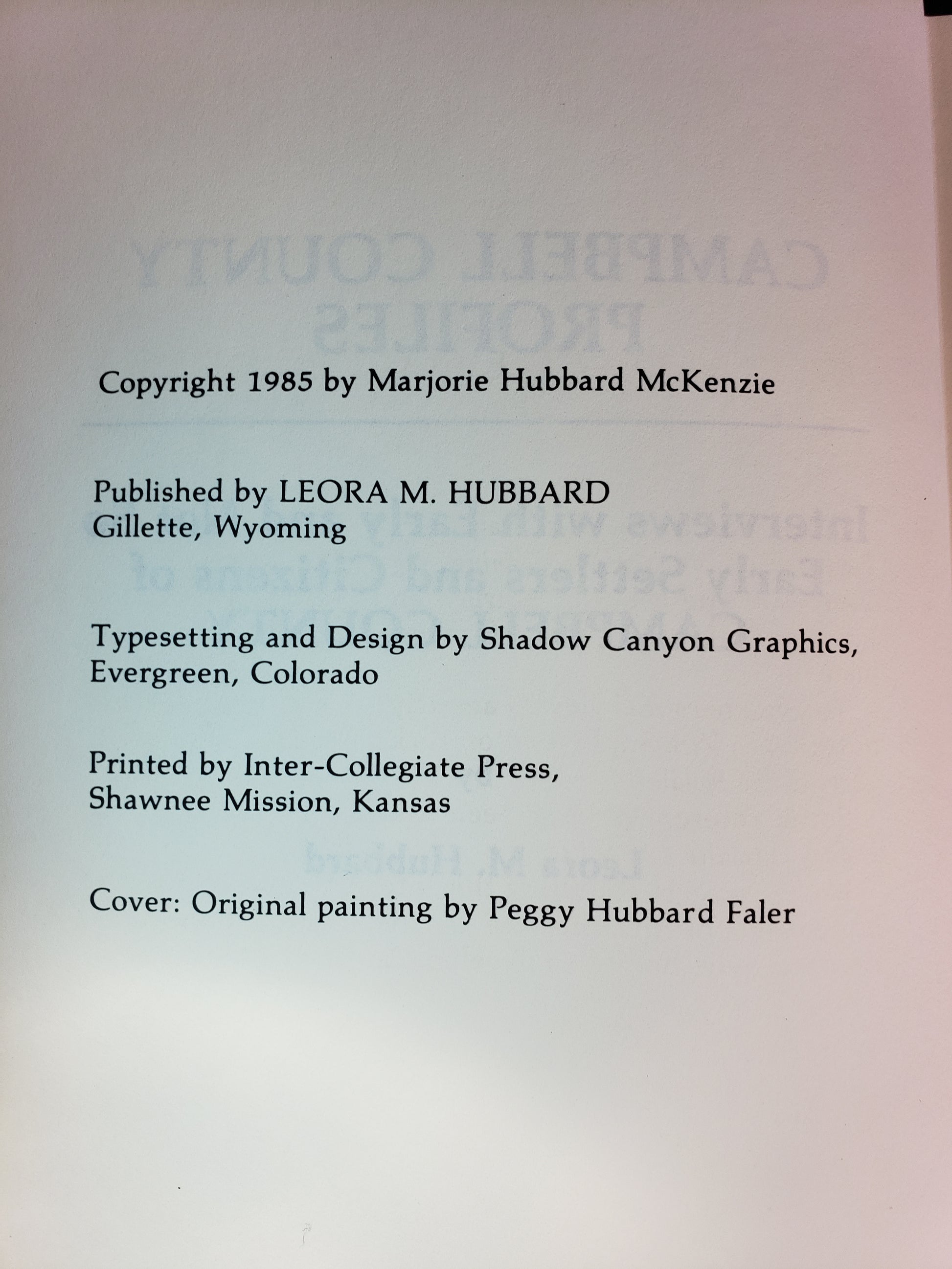 Campbell County Profiles by Leora M. Hubbard. Interviews with early and not so early settlers and citizens of Campbell County, Wyoming. This is a previously owned 144 page hardback book published in 1985. It is in very good condition. Great source of Wyoming history with lots of black and white photographs.