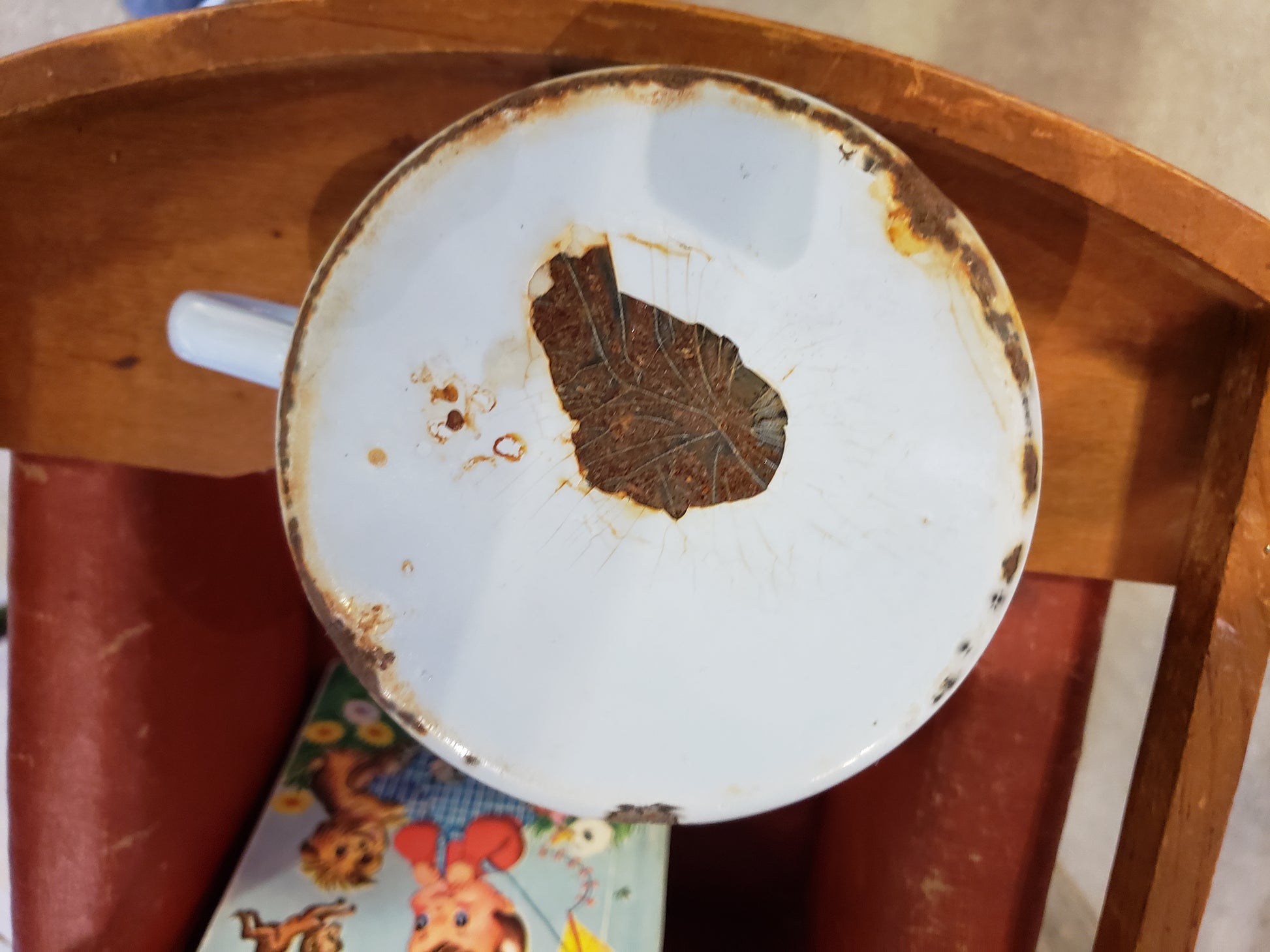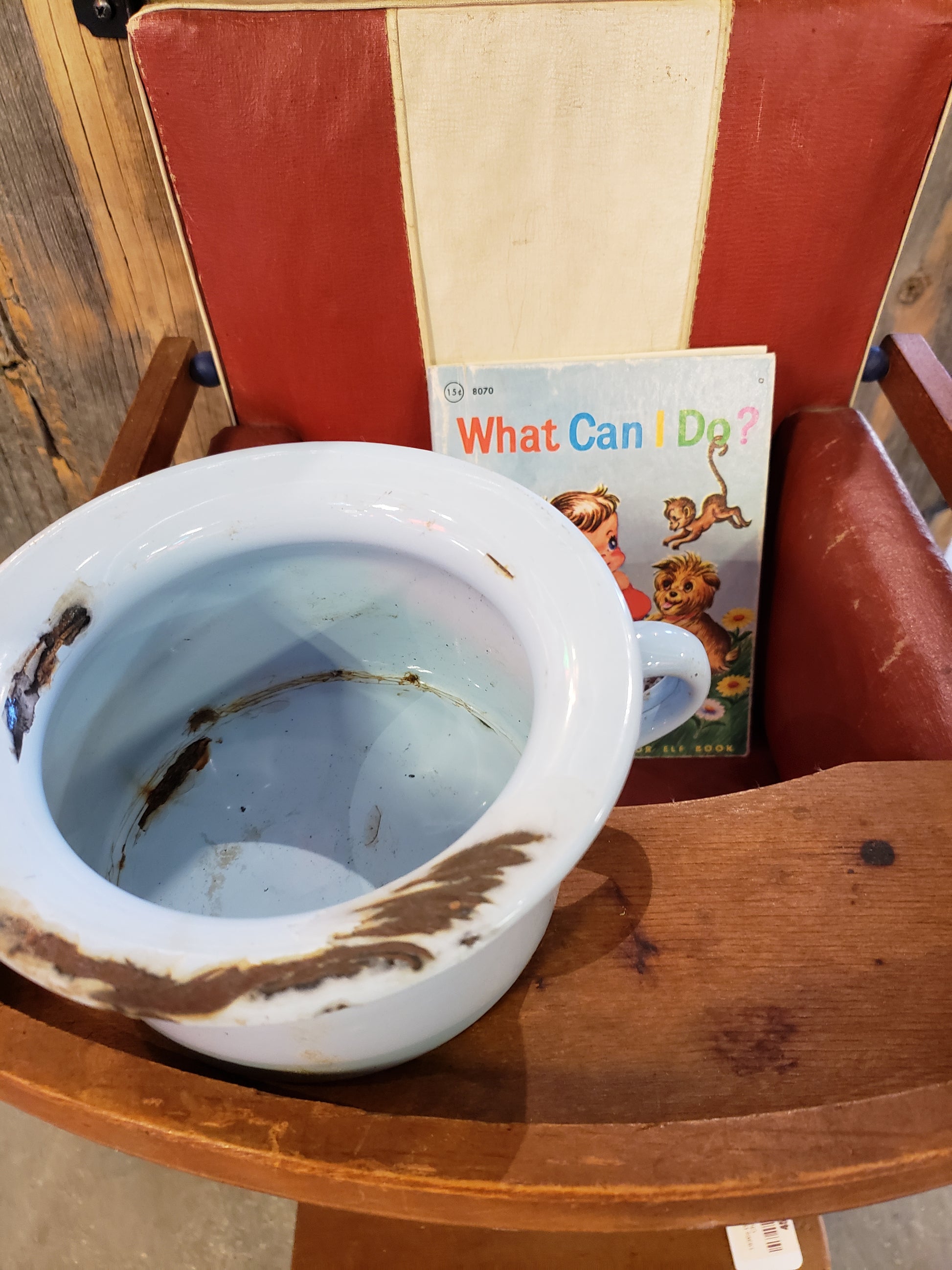 Potty like it's 1899! Seriously, this Child's Enamelware Chamber Pot in light blue is for decorative use only because the enamel is chipped and there are rusty spots. It would make a good planter or yard art. It measures 5 3/4 inches in diameter not counting the handle. 3 inches tall.