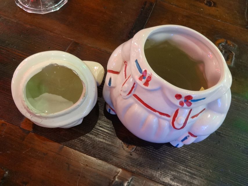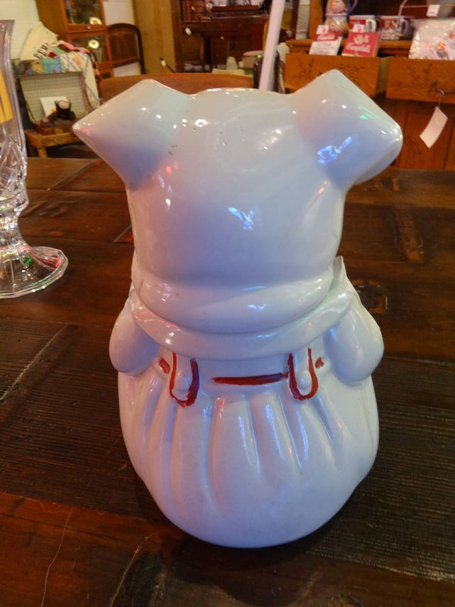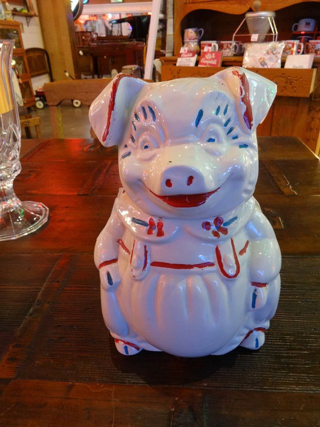 Pig Cookie Jar- Chips on rim of lid and base, this is a very old antique in fair used condition. 11 inches tall.