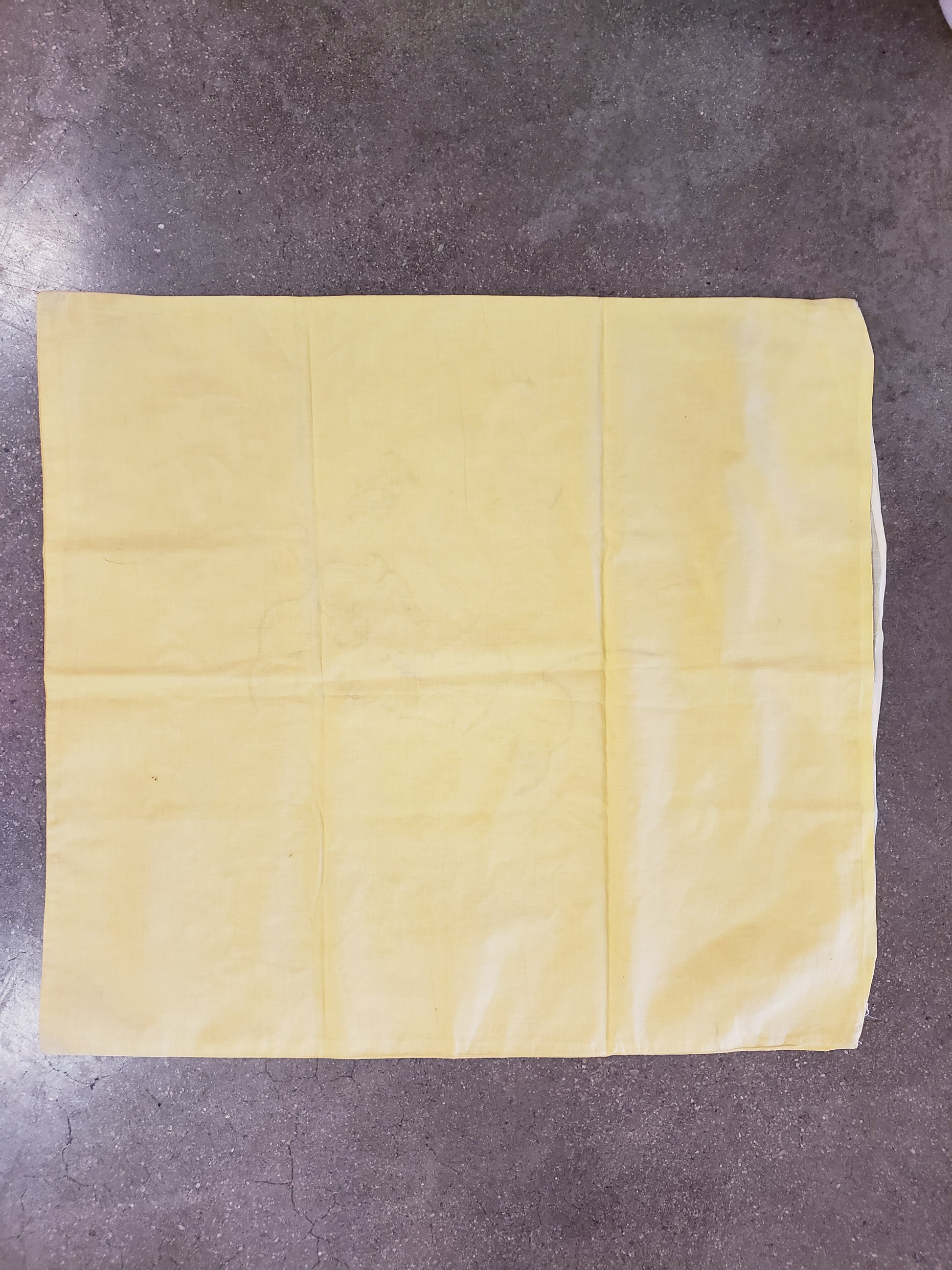 The Denver Carnival Souvenir 1901 pillow cover features elegant yellow fabric embroidered with a graceful lady holding a mask, capturing the spirit of the historic carnival. Designed with a discreet open end for easy insertion of a pillow, this cover adds a refined vintage charm to any living space. 22 x 23.5 inches. It does have a few small holes along the top and bottom edges, from age.