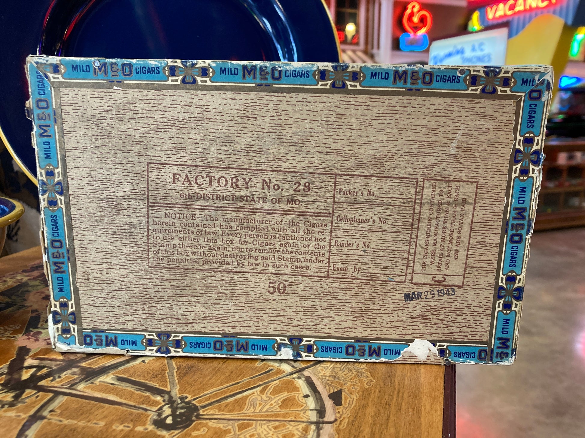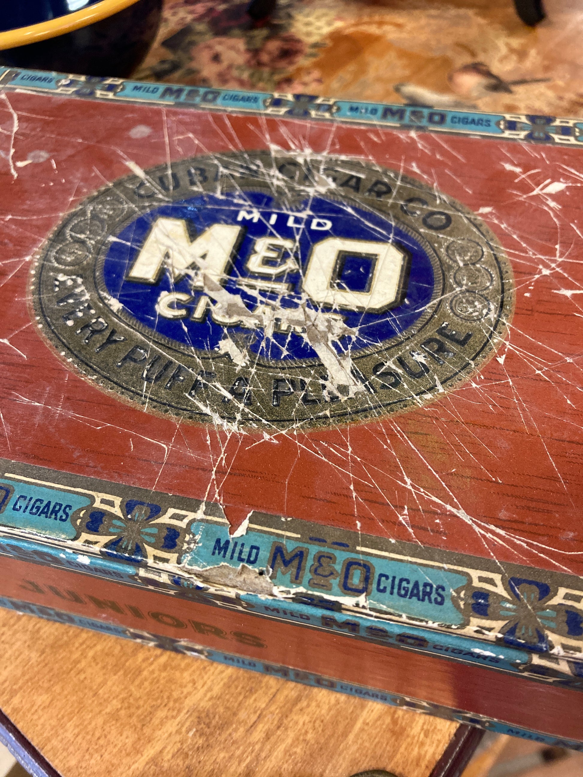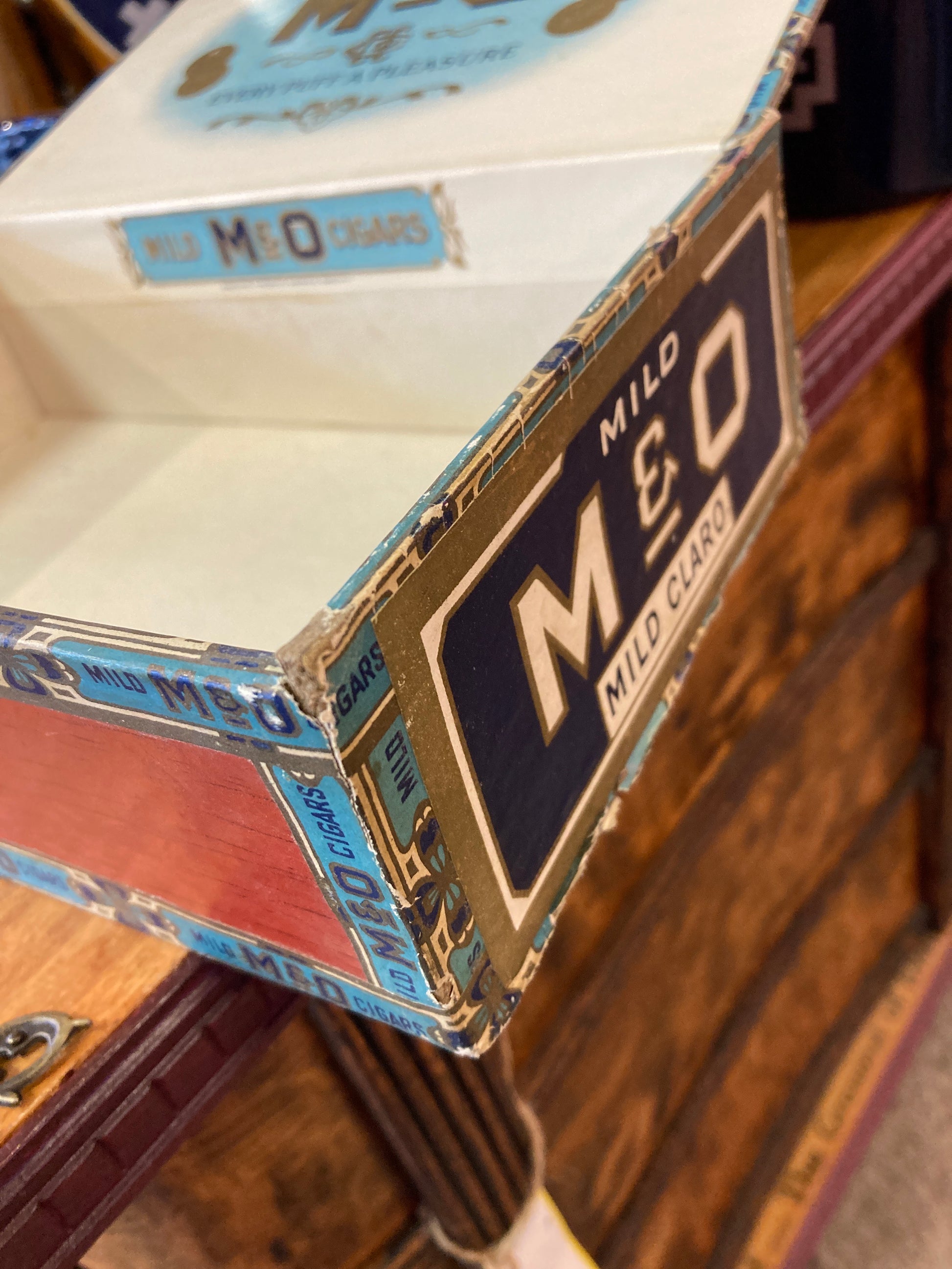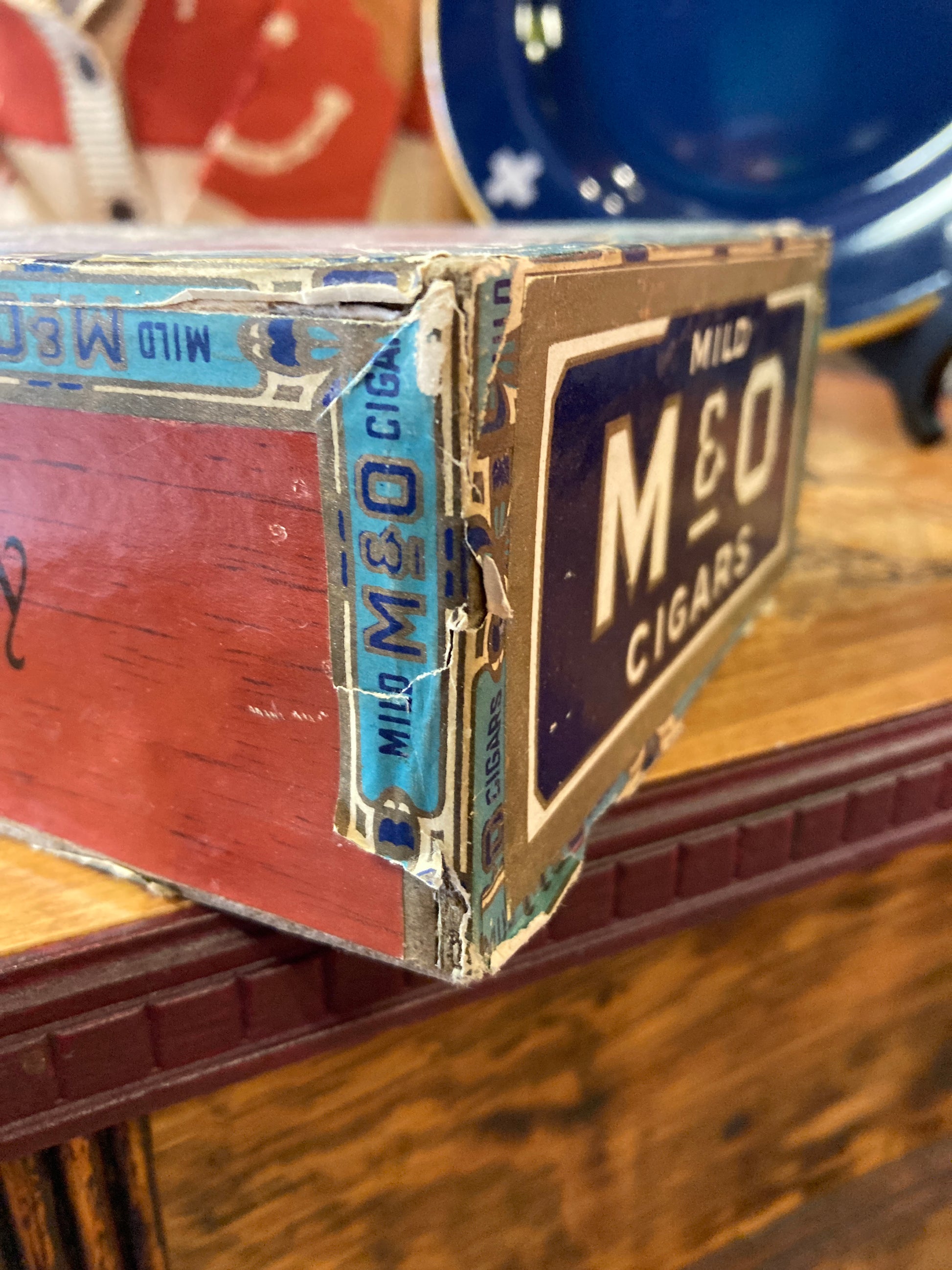 M & O Mild Cigars box from 1943 used to hold the Juniors size cigars. Measures 6 x 9 x 2 1/2 inches. In fair vintage condition ,has many scratches on top and is worn around the edges and corners. A fun collectors item or place to store sports cards or trinkets. . RED TAG SALE!