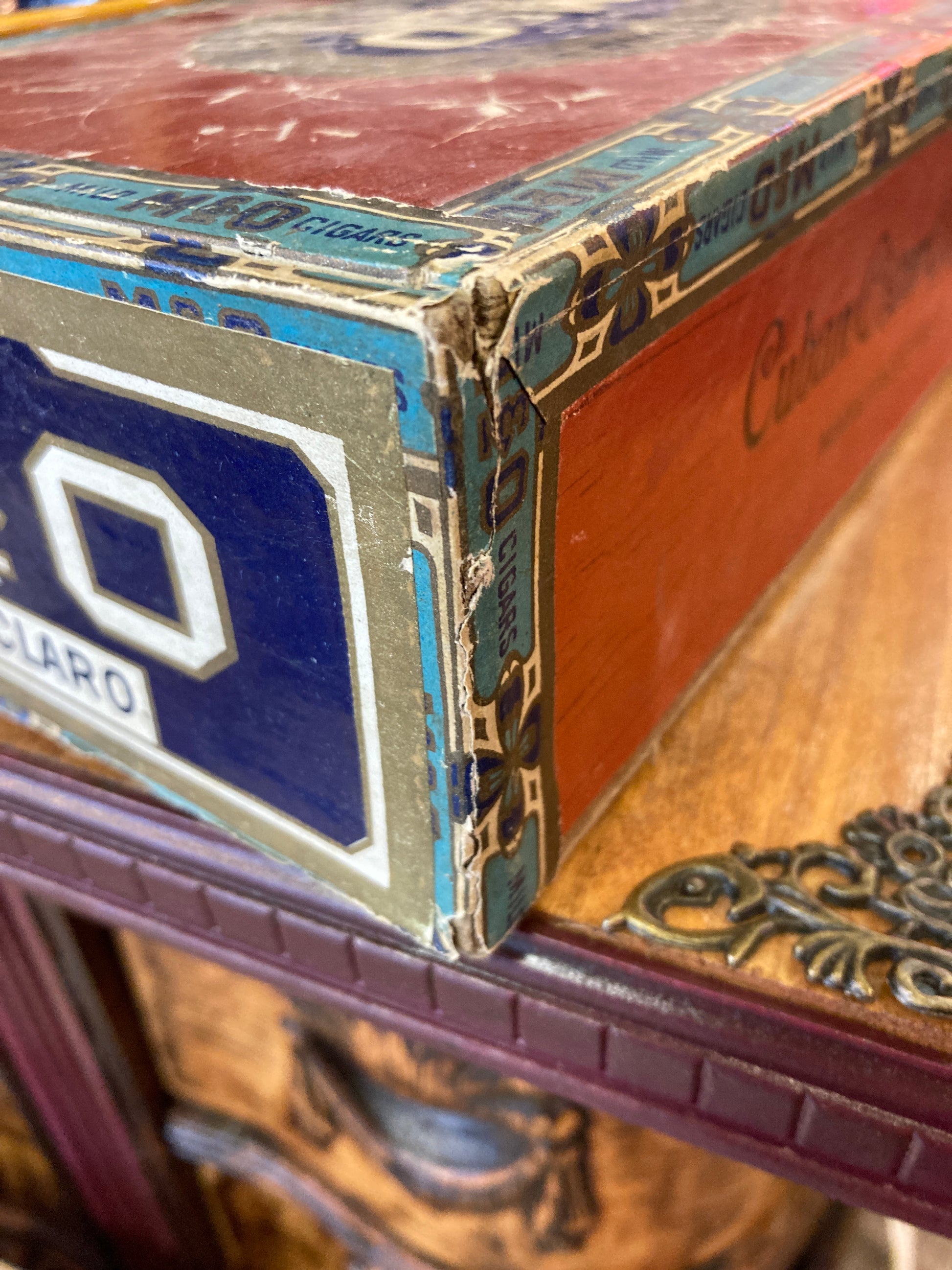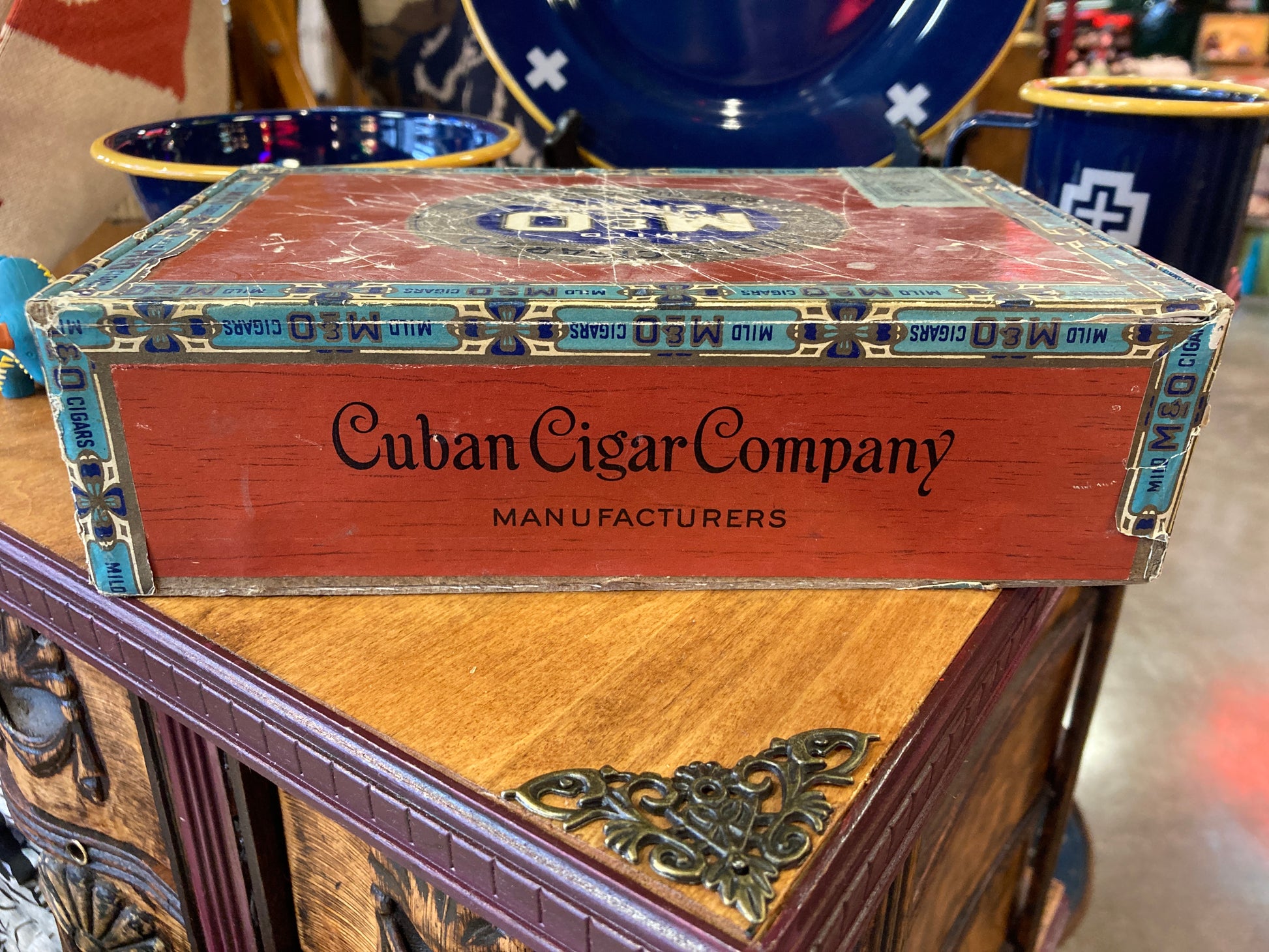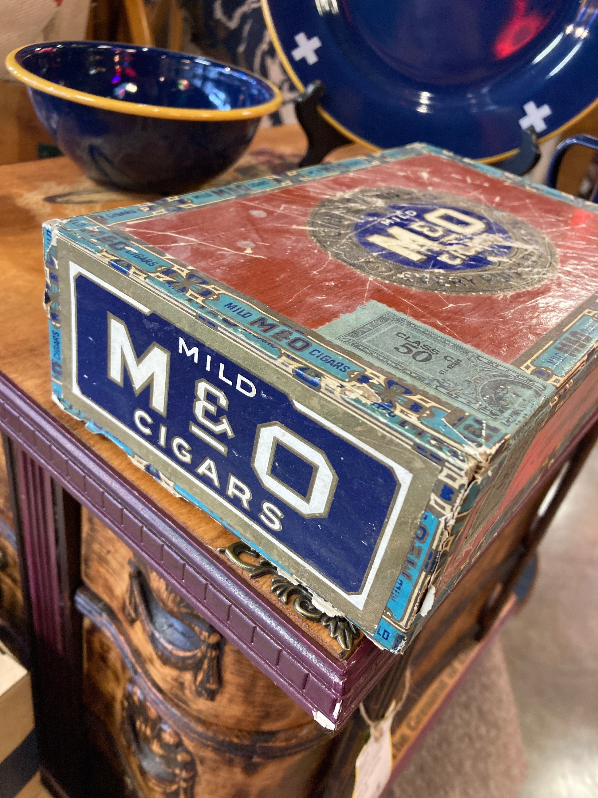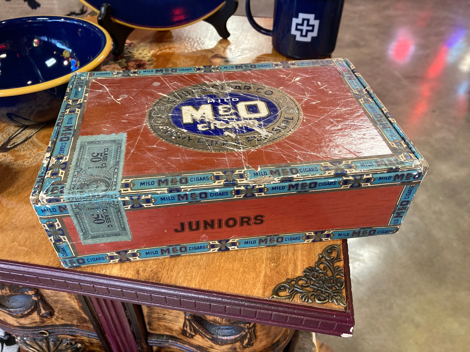 M & O Mild Cigars box from 1943 used to hold the Juniors size cigars. Measures 6 x 9 x 2 1/2 inches. In fair vintage condition ,has many scratches on top and is worn around the edges and corners. A fun collectors item or place to store sports cards or trinkets. . RED TAG SALE!