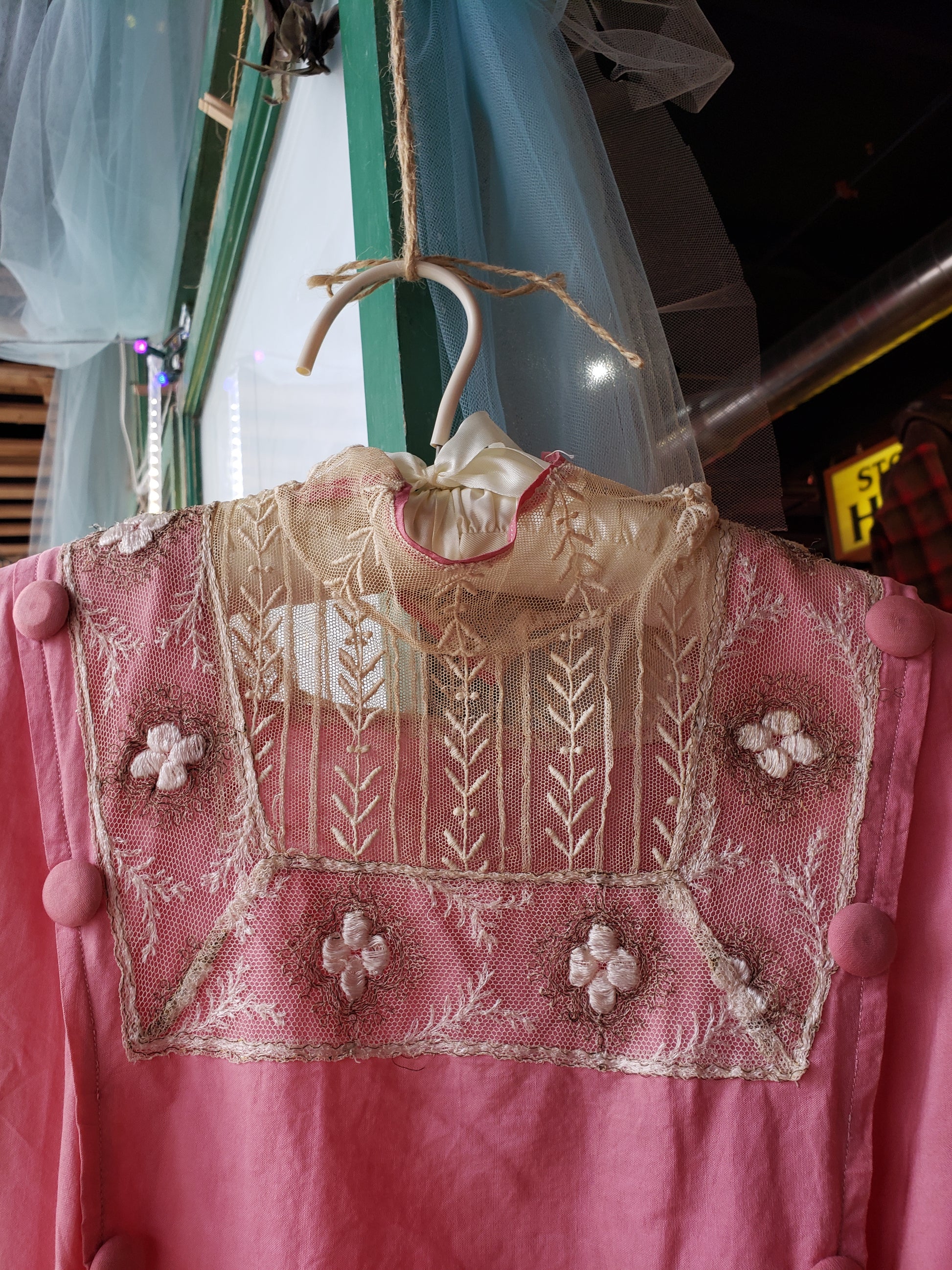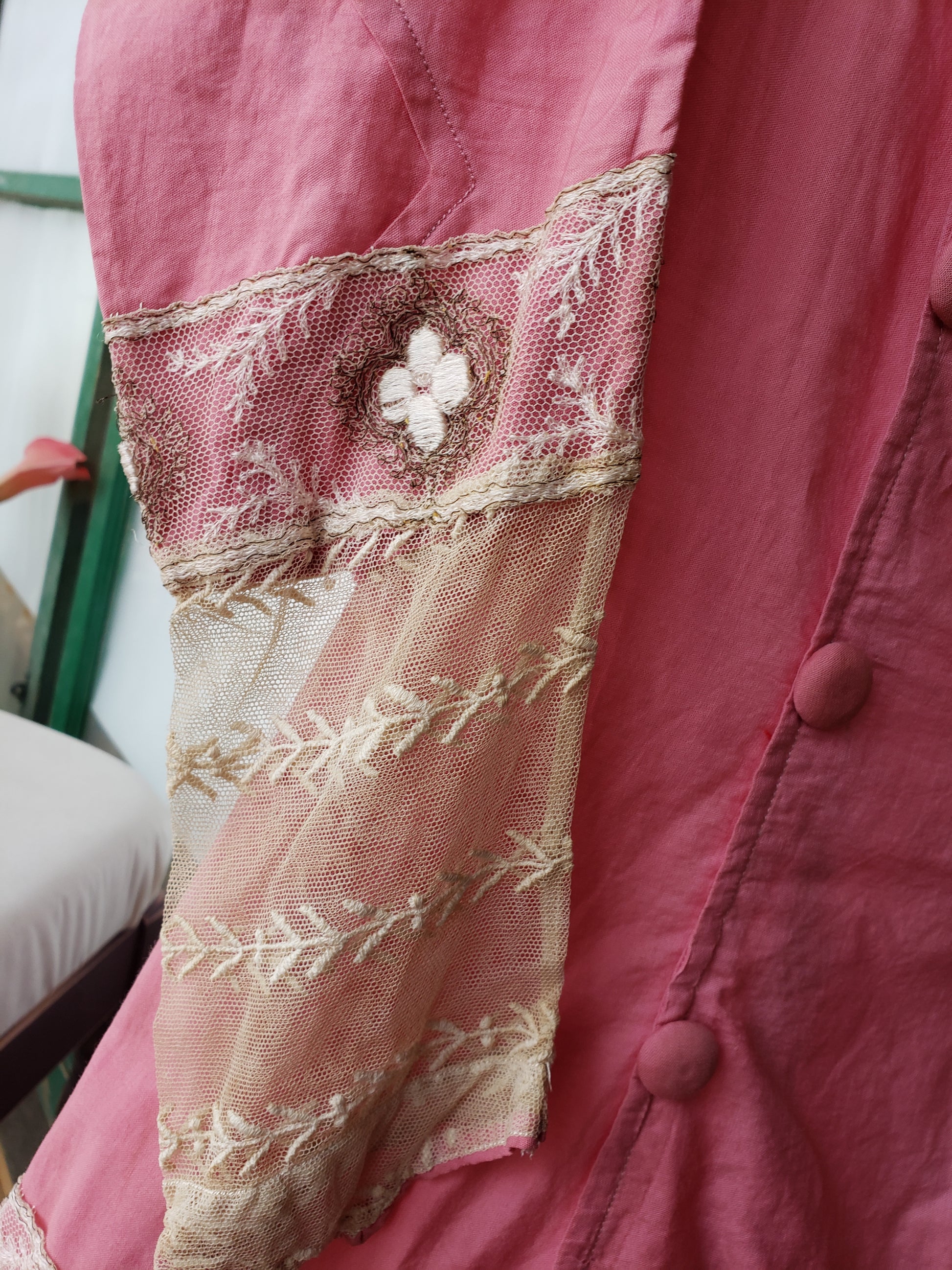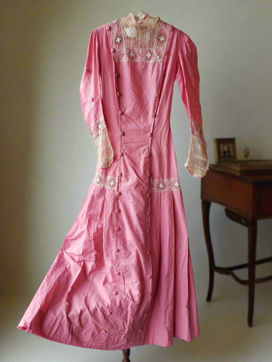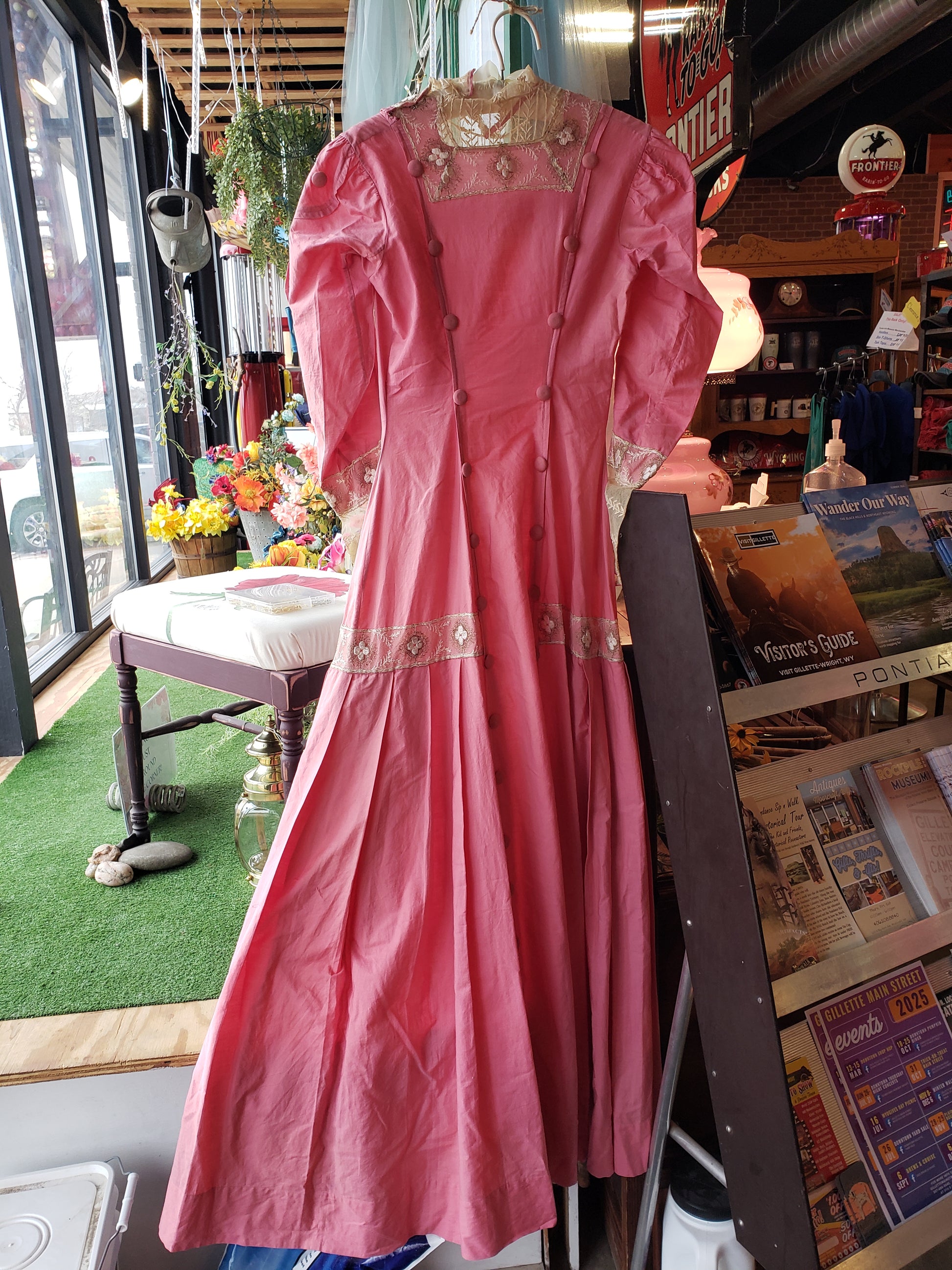 Vintage walking dress with a hook and eye closure hidden behind the decorative covered buttons. It has princess seams down the front and back accented with covered buttons, the lower sides have the style of a pleated drop waist. The pleated area is topped with lace, and the dress also has a lace yoke, collar and lower sleeves. There are scallops and buttons along the top of the lightly puffed sleeves. 24 inch actual waist. Beautifully tailored dress from days gone by, the lightweight rose pink fabric has held up to the tests of time. It may be older than early 1900s, not sure, it came from an estate in Wyoming. It does have a few stains from storage, and is in fair vintage condition.