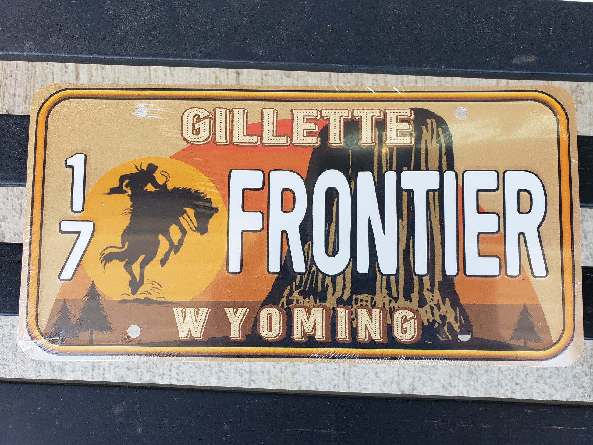 Collectors item, brand new embossed metal County 17 (Campbell County) Gillette, WY Frontier Auto Museum license plate. Featuring Devil's Tower, sunset, and bucking horse silhouette. 12 by 6 inches