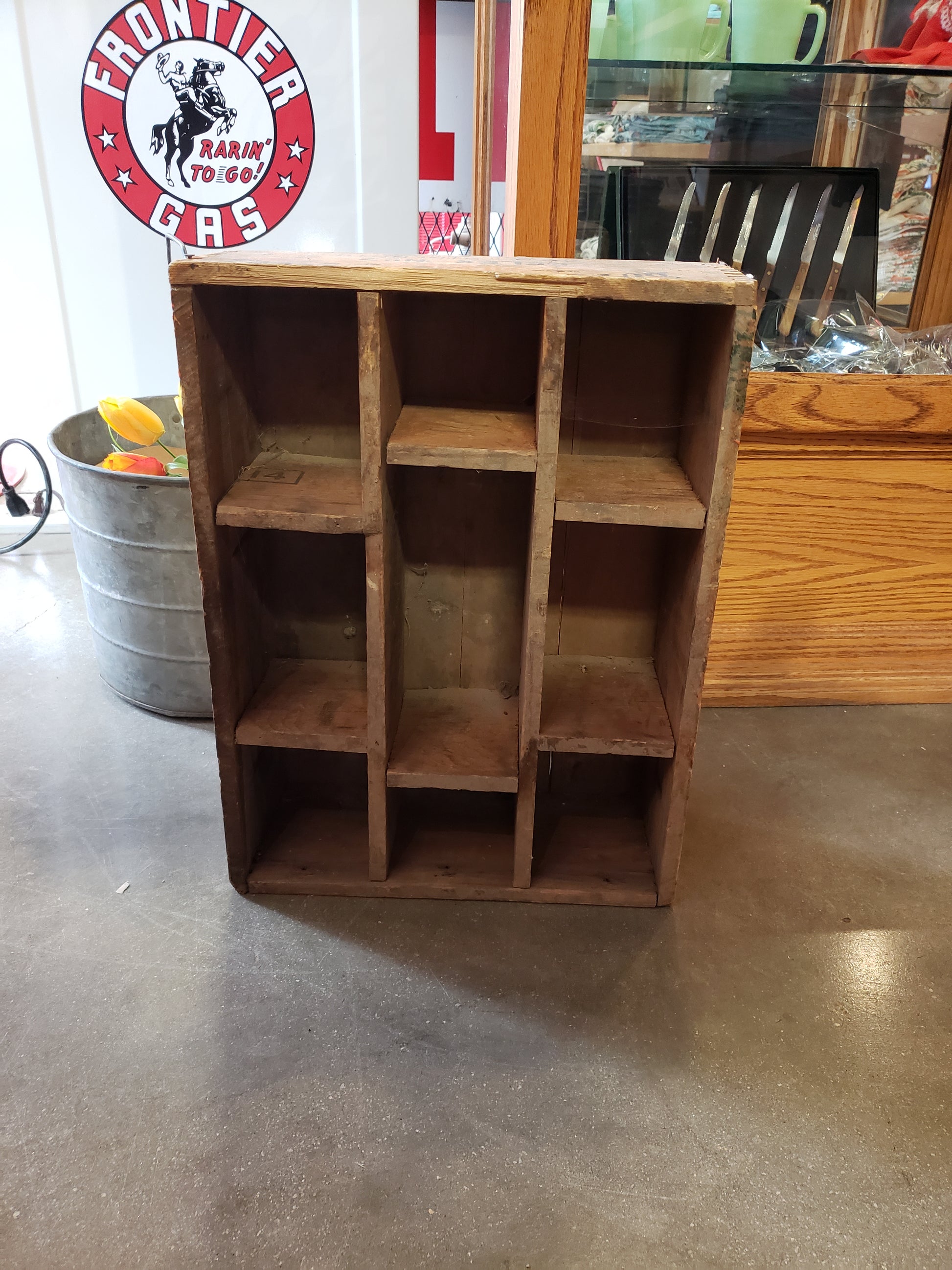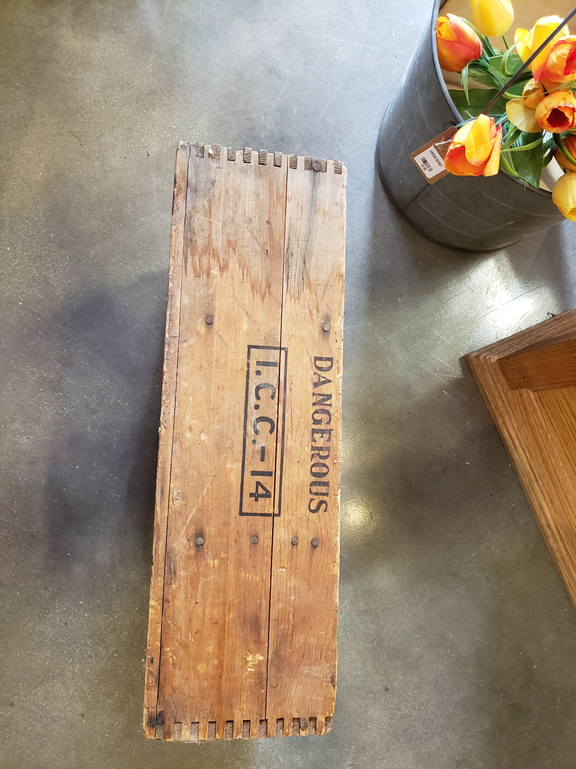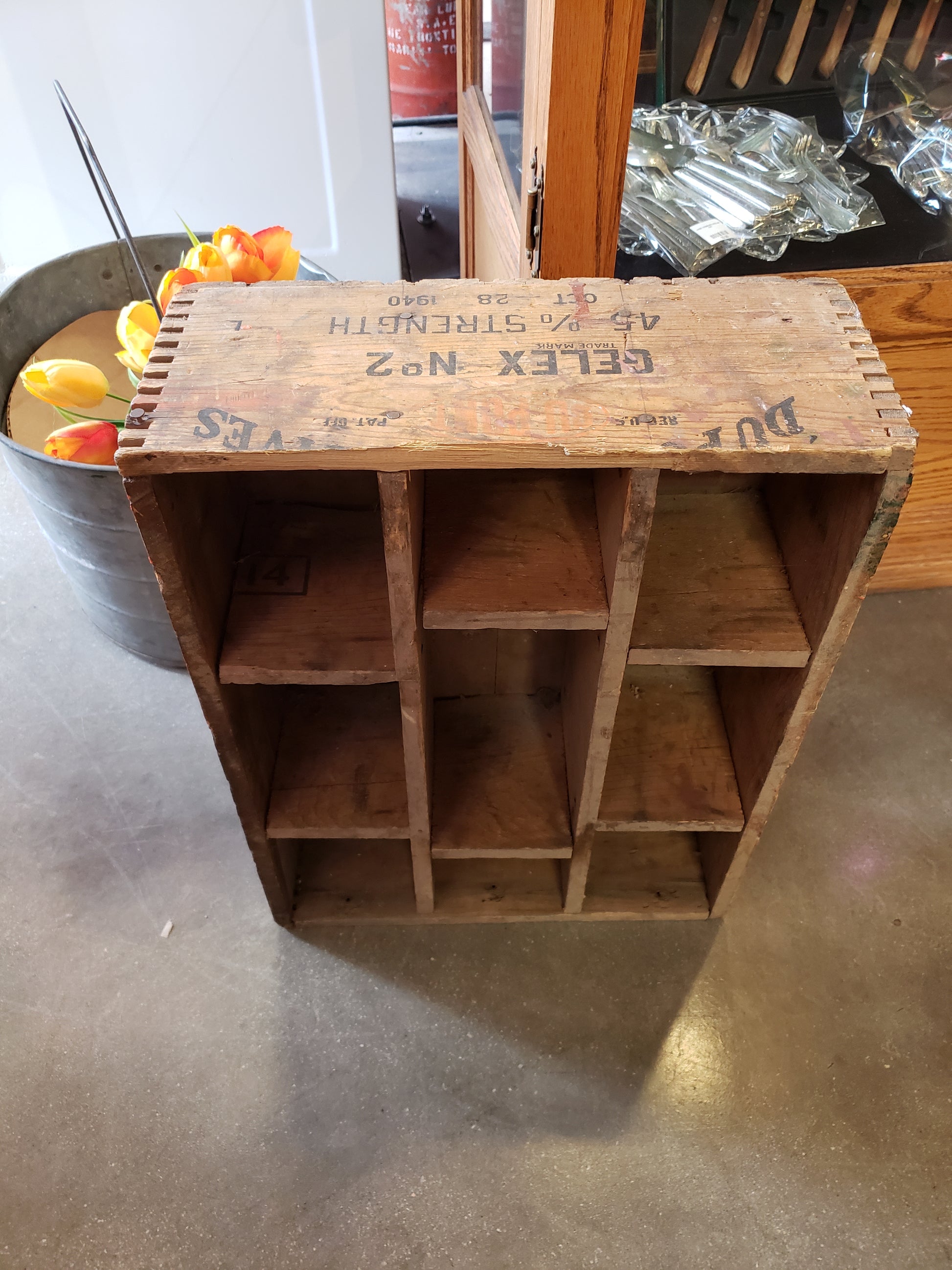 Vintage Blasting crate with compartments is made from wood. Versatile piece could be used on the wall for display, on the floor for storage, or in the entryway as a catch all. 18 x 13 x 6 inches, dated October 28 1940. This dovetailed wooden crate is in fair vintage condition.