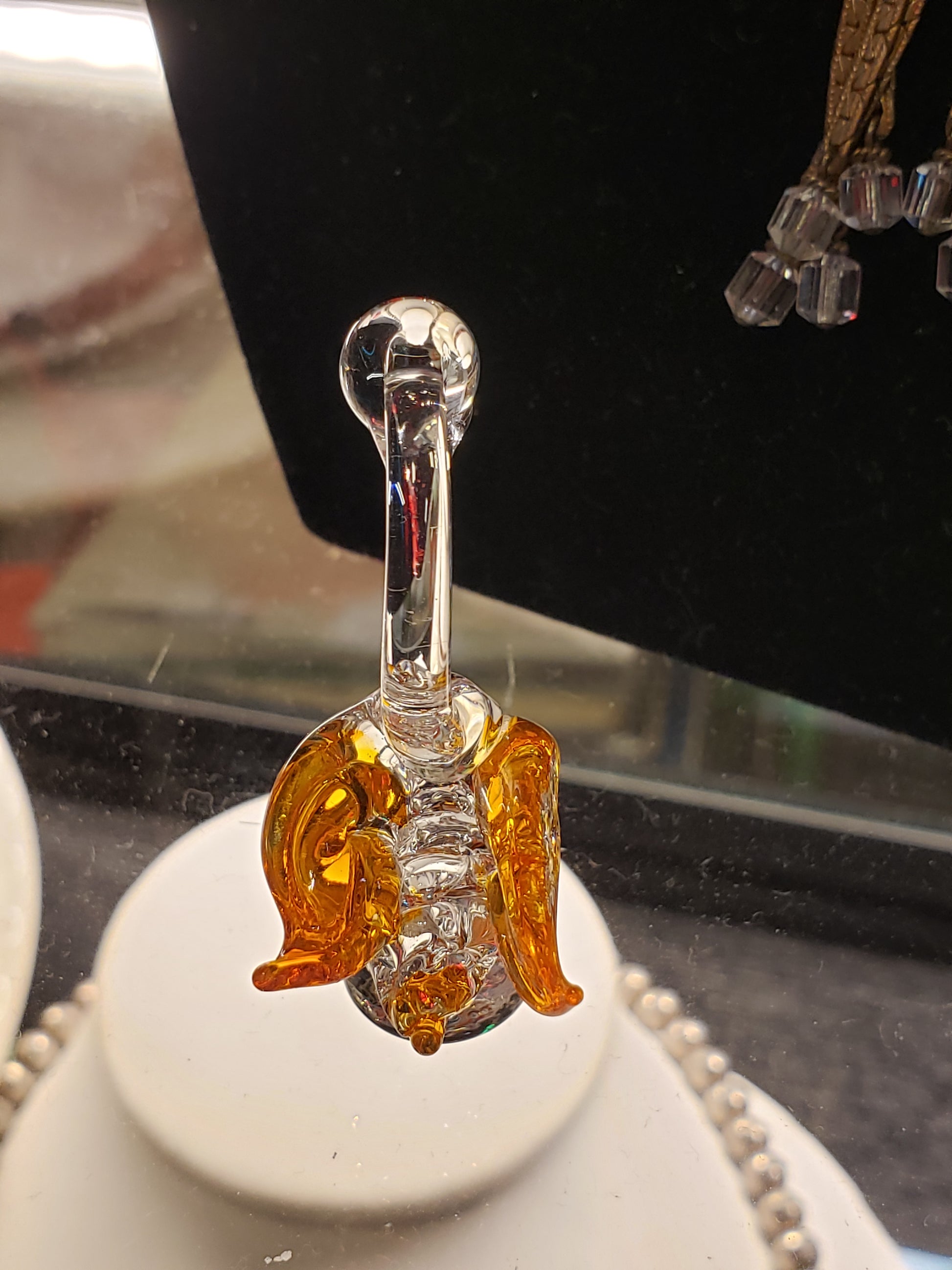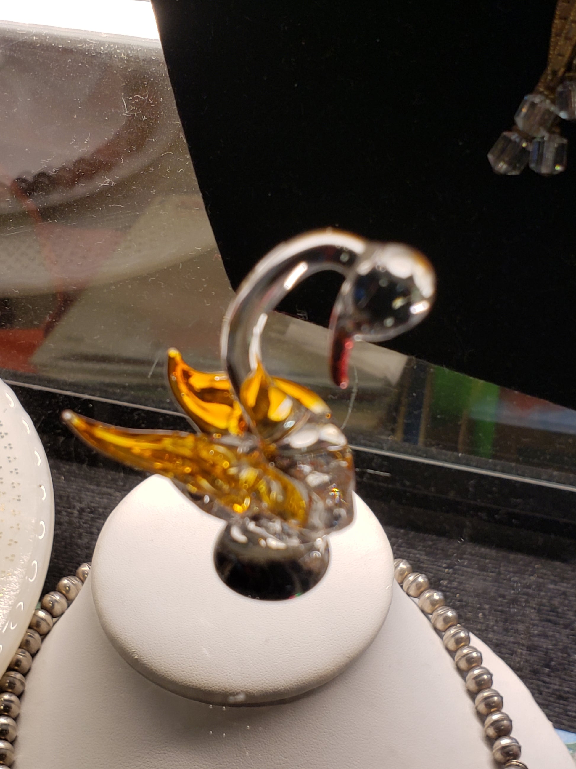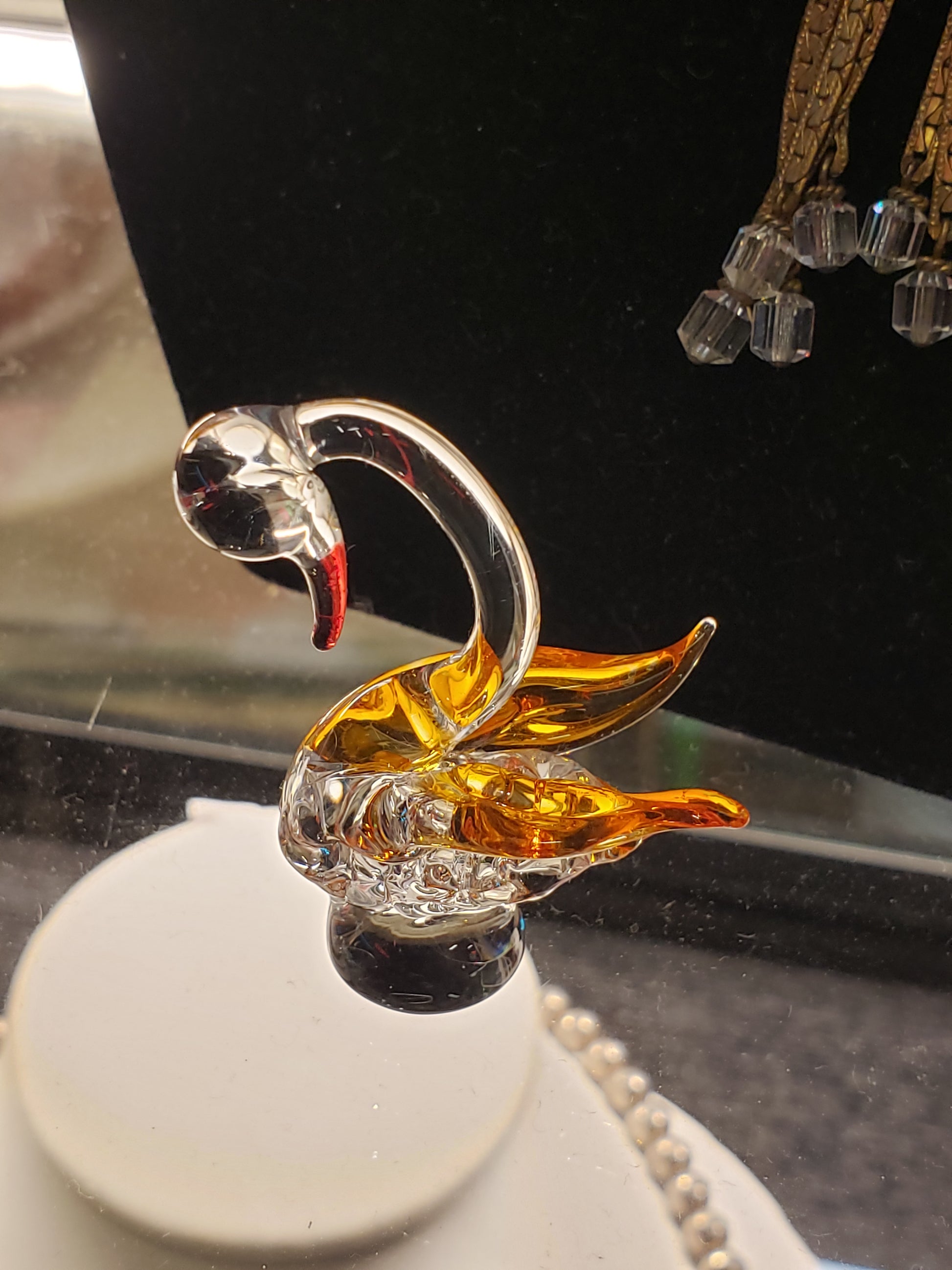 This exquisite miniature glass swan stands just 2 inches tall but makes a striking impression with its delicate clear body, vibrant red beak, and stunning orange wings. It was carefully blown by skilled artisans, making it a perfect collector's item or thoughtful gift. Add this charming accent to your display cabinet and watch how it catches the light, bringing elegance to any space.