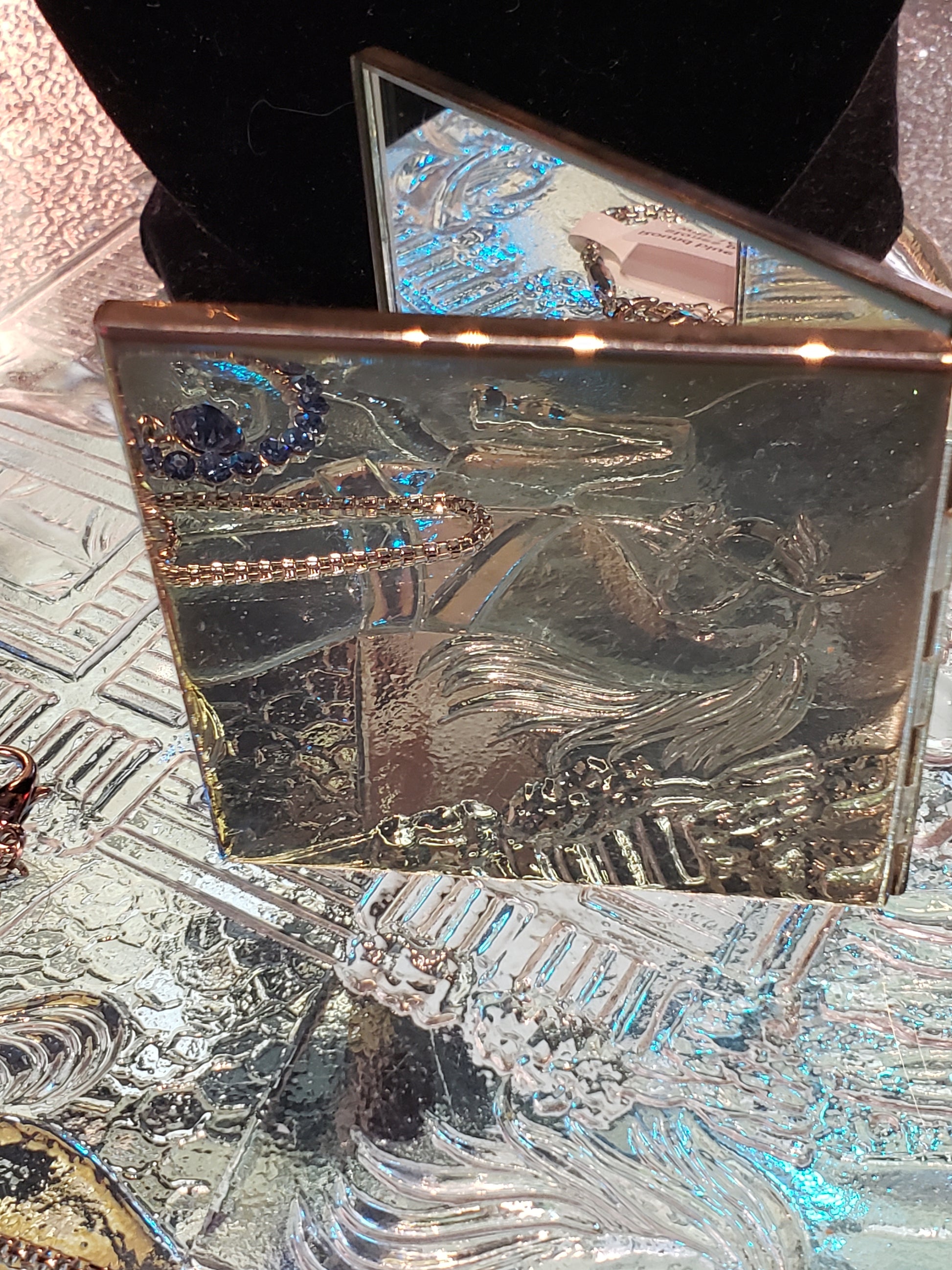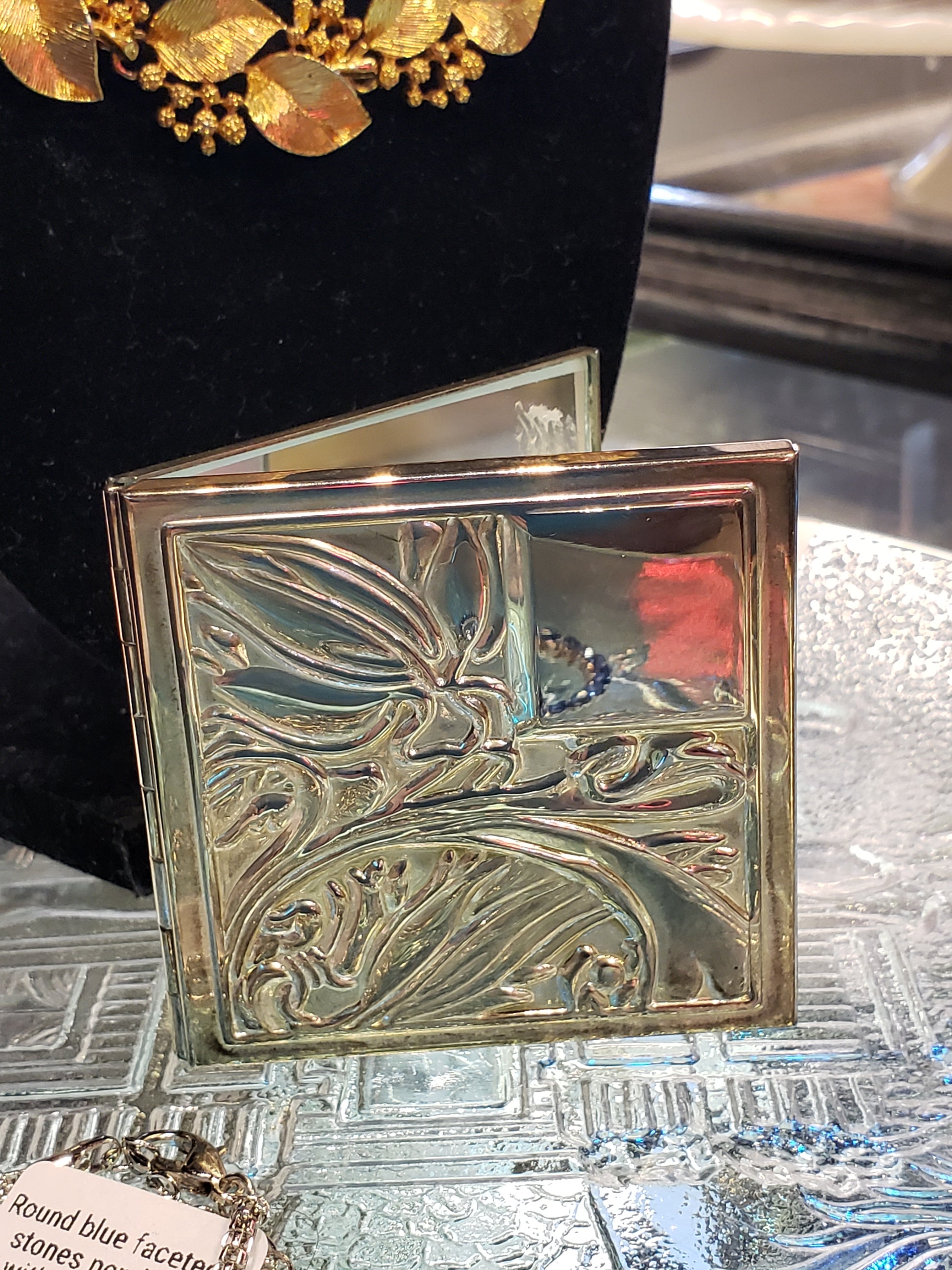 This Godinger Silver Company Art Deco compact mirror features a vintage design that adds a touch of elegance to your purse. The compact mirror is made with durable materials and is in fair vintage condition. Perfect for on-the-go touch-ups. Regular and magnifying mirrors!