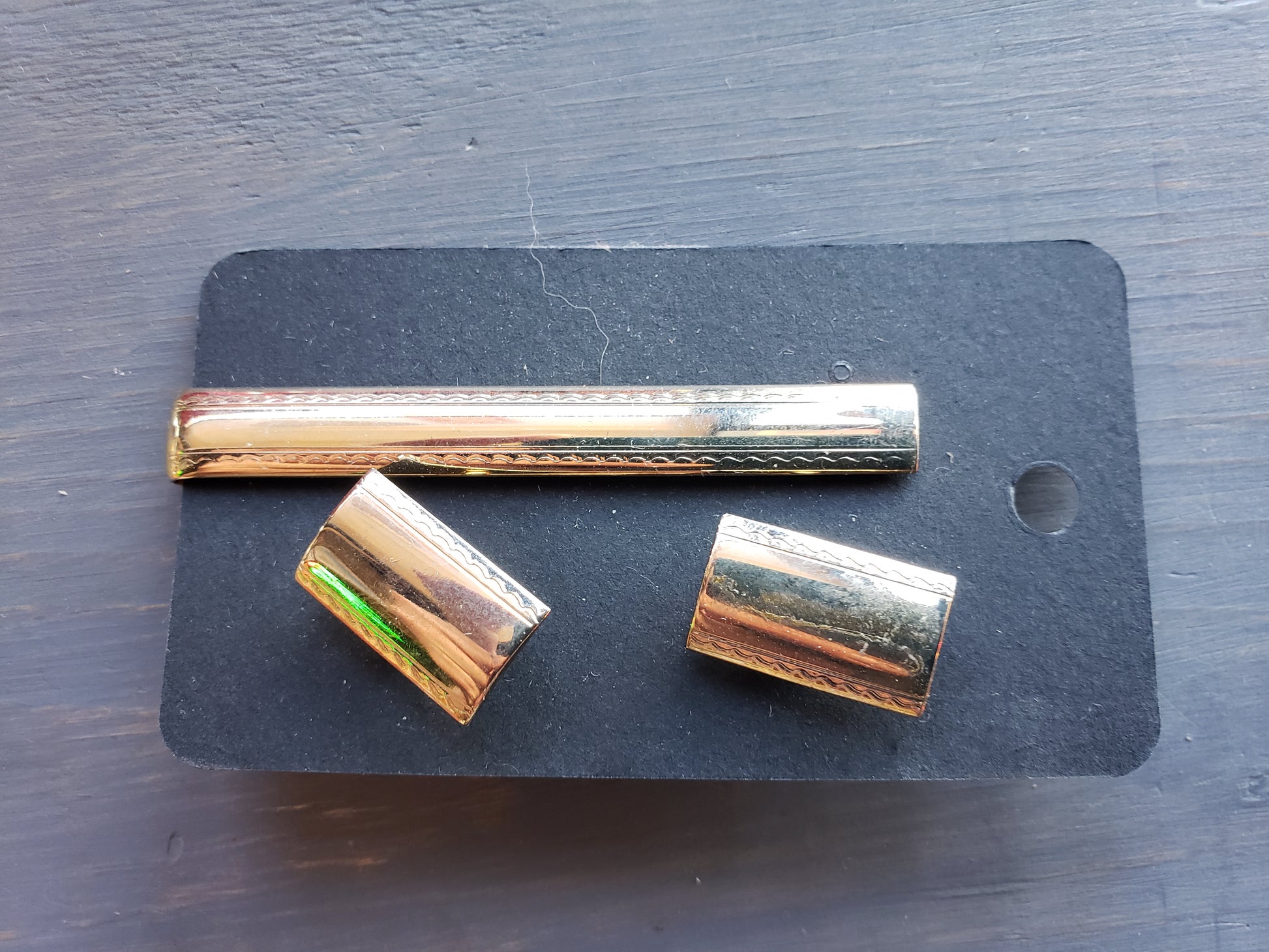 Elevate your formal attire with our Golden Tie Bar and Cufflink set. This vintage-inspired set adds a touch of class to any suit, perfect for any occasion. Upgrade your style game and make a statement with this sophisticated and timeless accessory.
