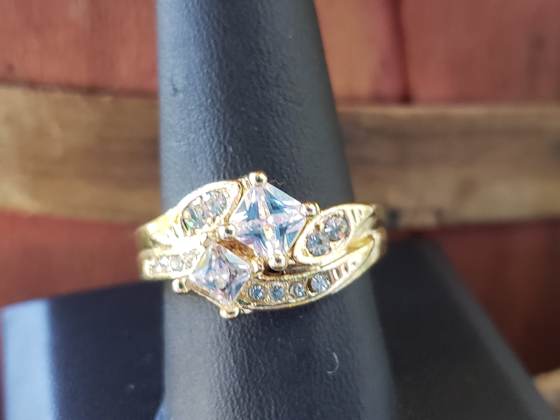 Sparkly beautiful coctail ring is size 9.5, it really shimmers in the light. It is in fair vintage condition. It features 2 square and 12 round faceted stones.