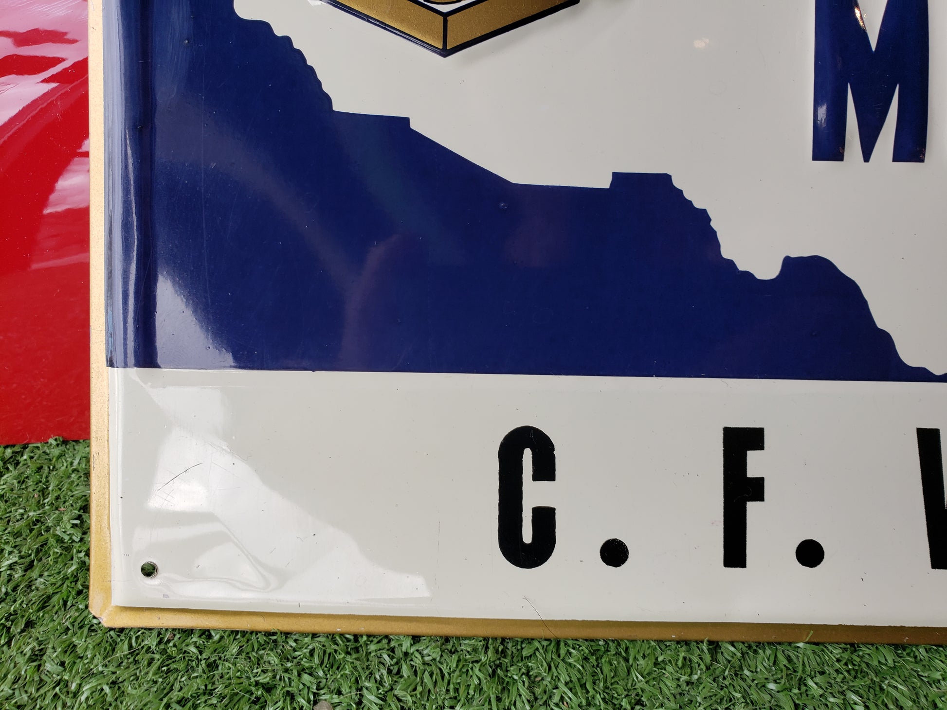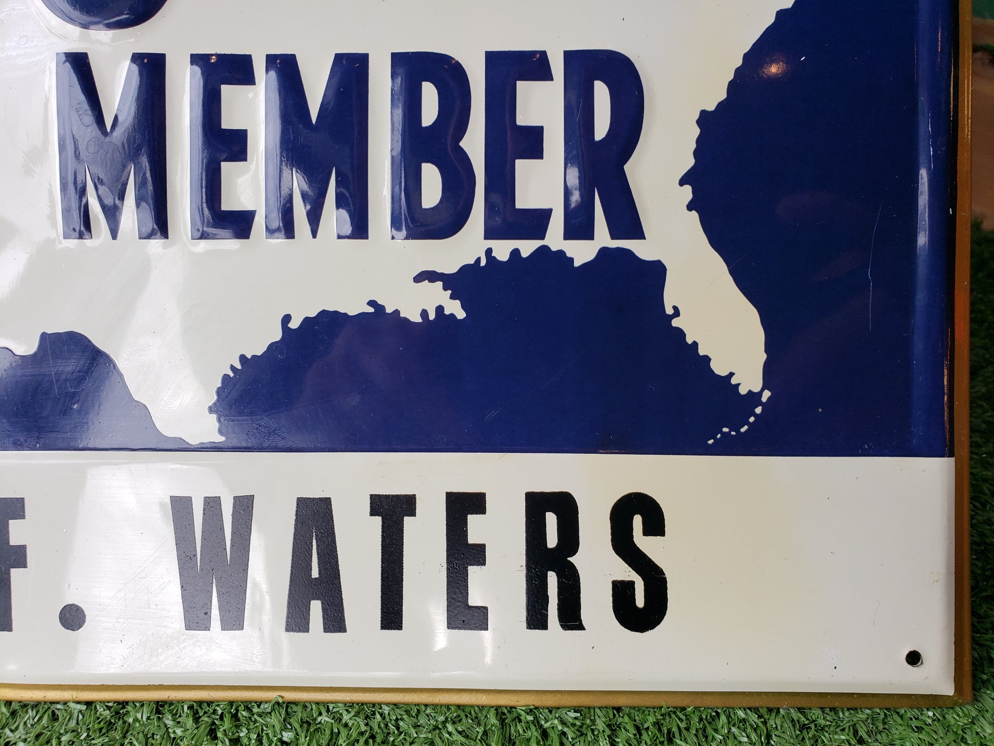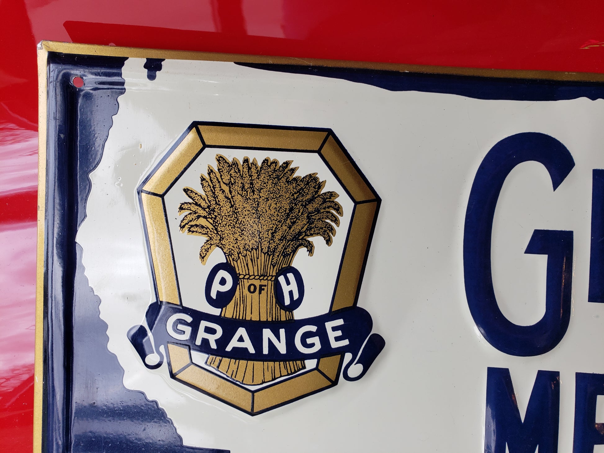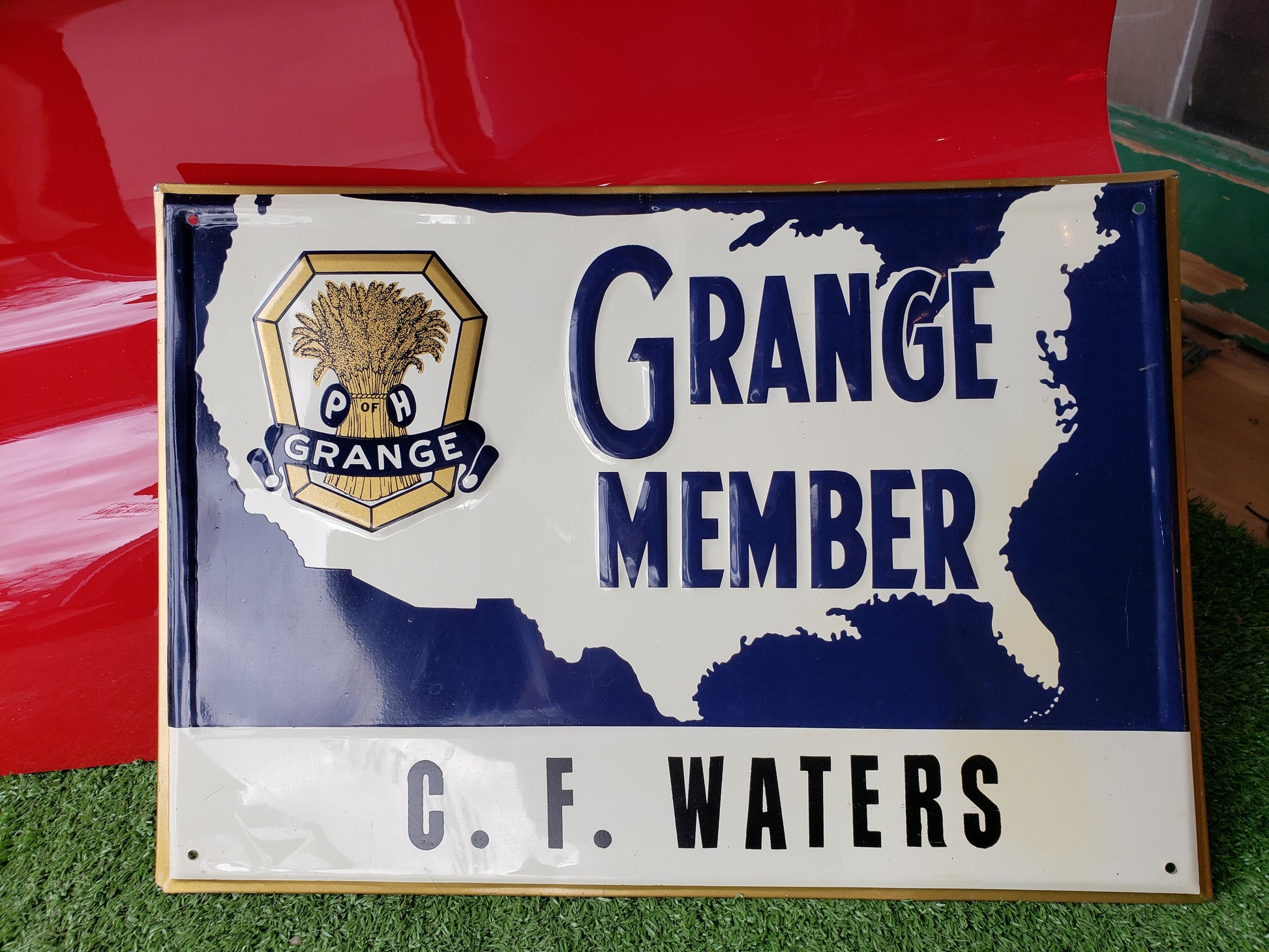 Embossed metal sign with flanged edges advertising the P & H Grange. P & H stands for Patrons of Husbandry, and this sign belonged to Grange Member C. F. Waters. It is 13.5 x 9.5 inches and is in fair used condition. It has of course, been previously displayed and has a few dents and light scuffs. .