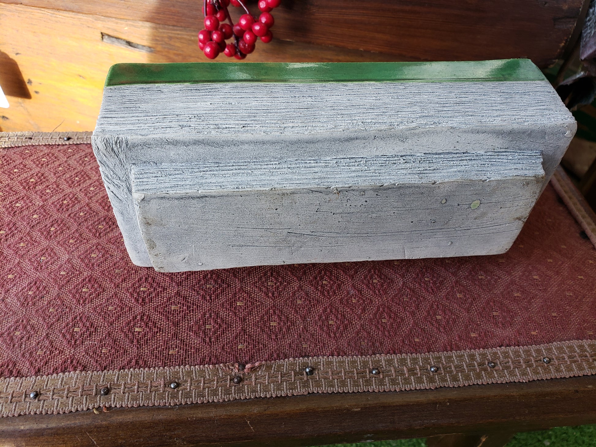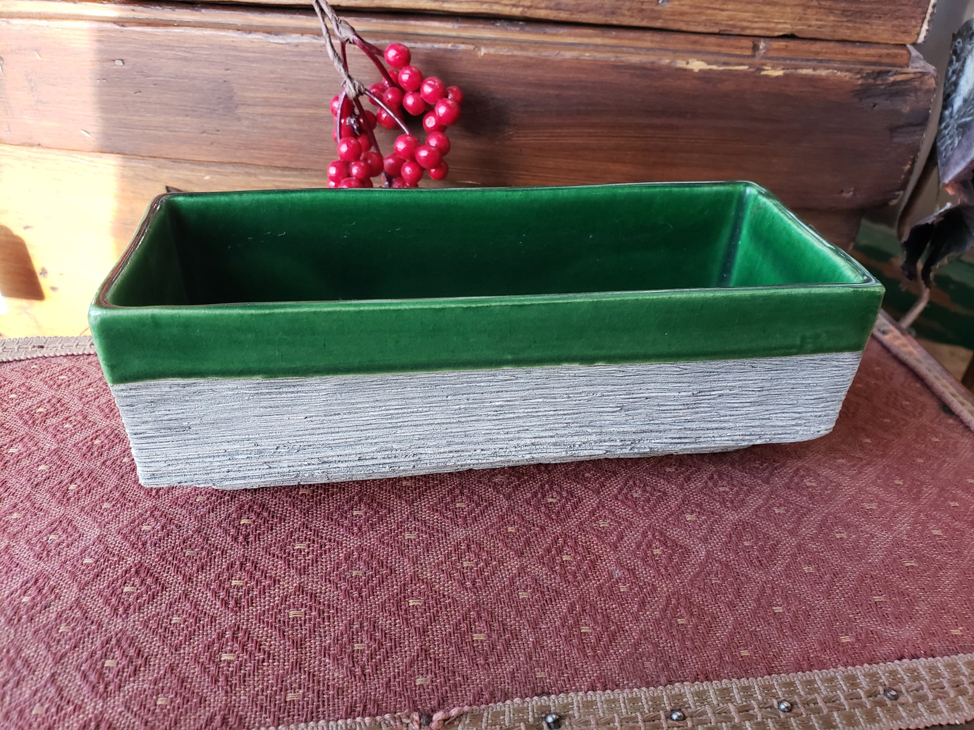 This rectangle shaped vintage planter is 6.5 inches long, 2.75 inches wide and 2.5 inches tall. The grey part is textured and has a wood like feel although the material is porcelain. The green part is glossy finished. It has a pedestal base and would work nicely to hold small faux plants, makeup or trinkets. It is in really good condition, no chips.