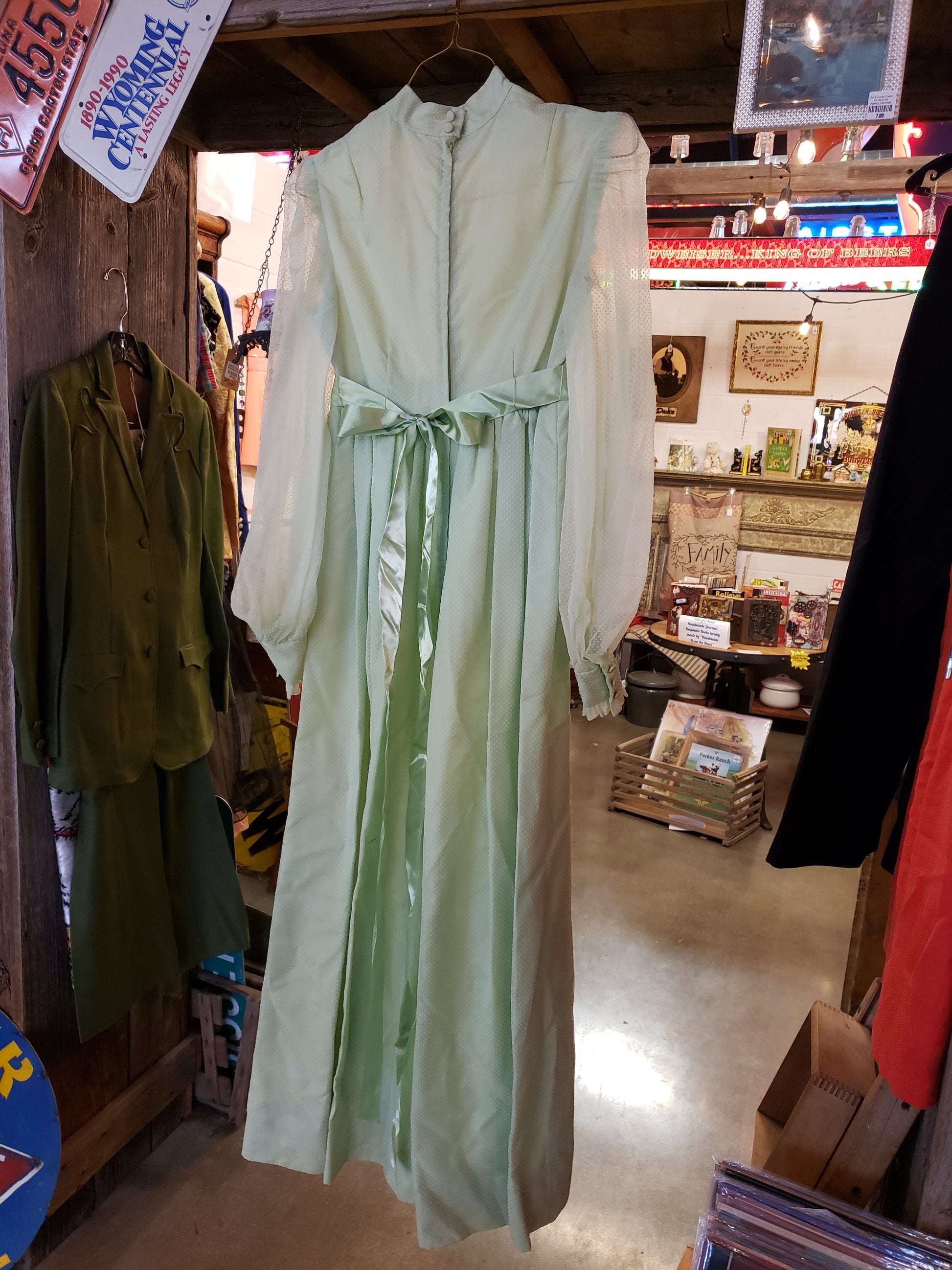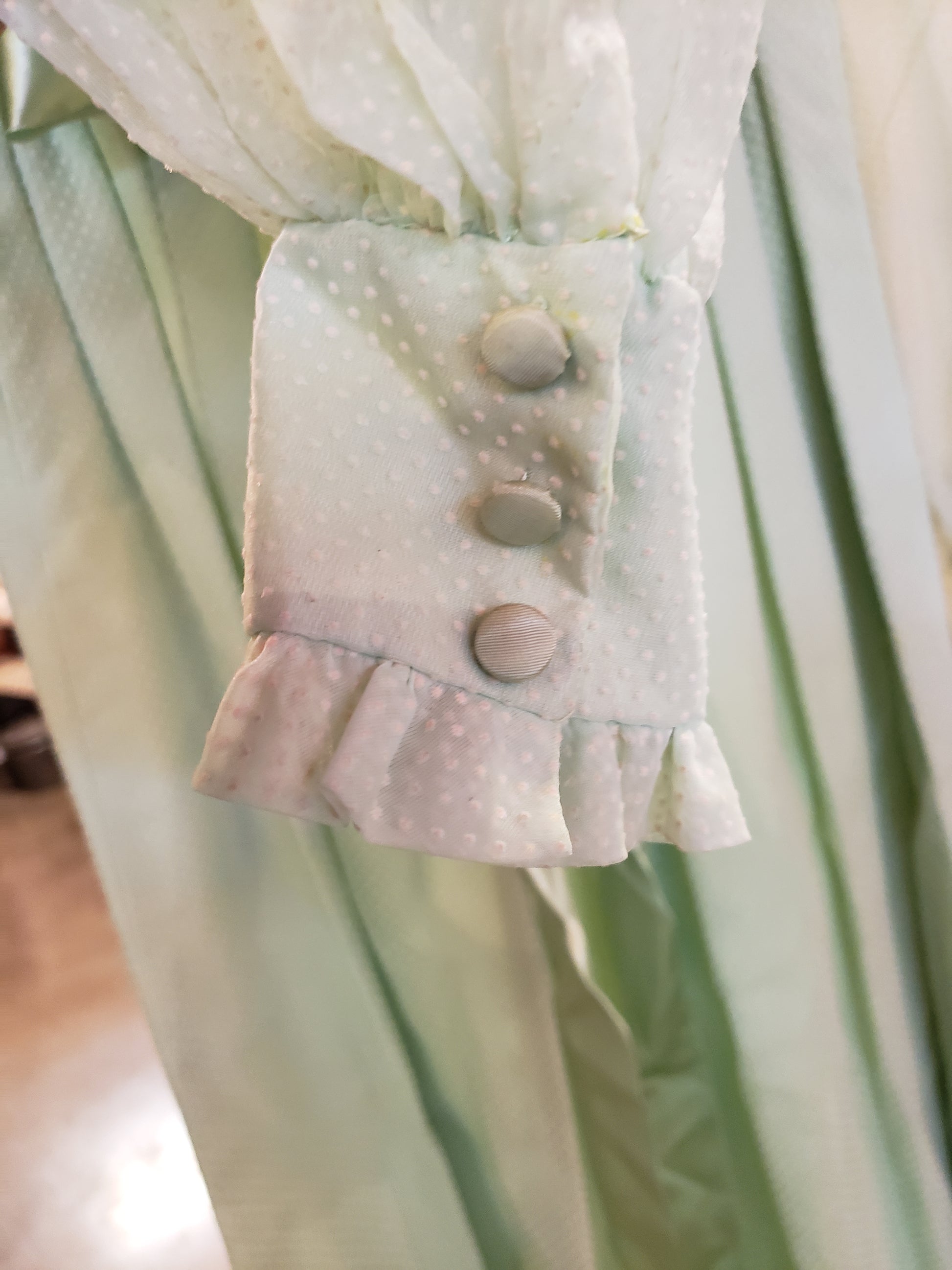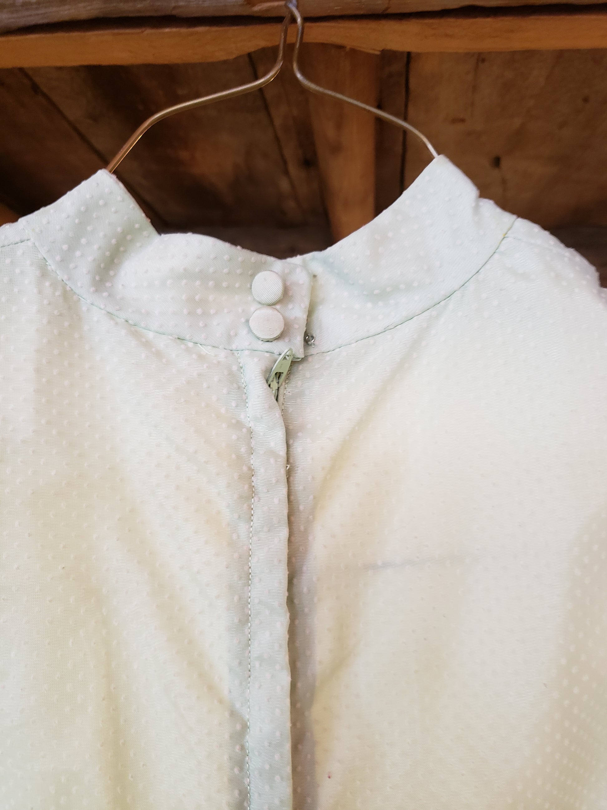 Embrace vintage elegance with this enchanting green dotted swiss long dress, a timeless piece that captures the free-spirited essence of 70s boho style. The empire waist, cinched with a delicate satin ribbon tie, creates a flattering silhouette while the sheer dotted overlay floats gracefully over a soft light green lining. Practical details include hidden snap closures at the cuffs and neckline, concealed beneath charming covered buttons, plus a convenient zip back for easy wear. Perfect for those who crave nostalgic charm with modern comfort, this size S dress is an instant wardrobe staple for anyone seeking effortless, romantic style.