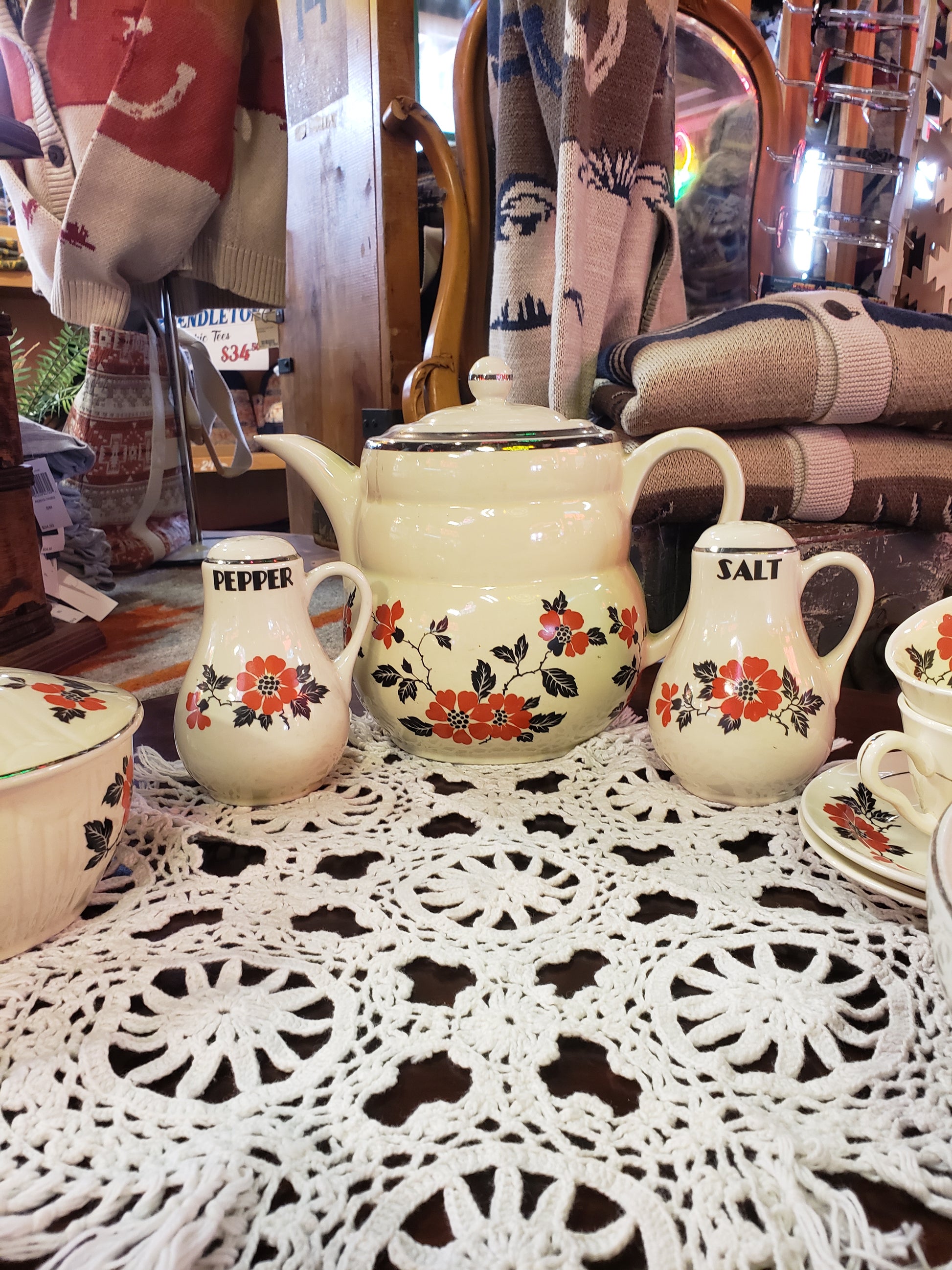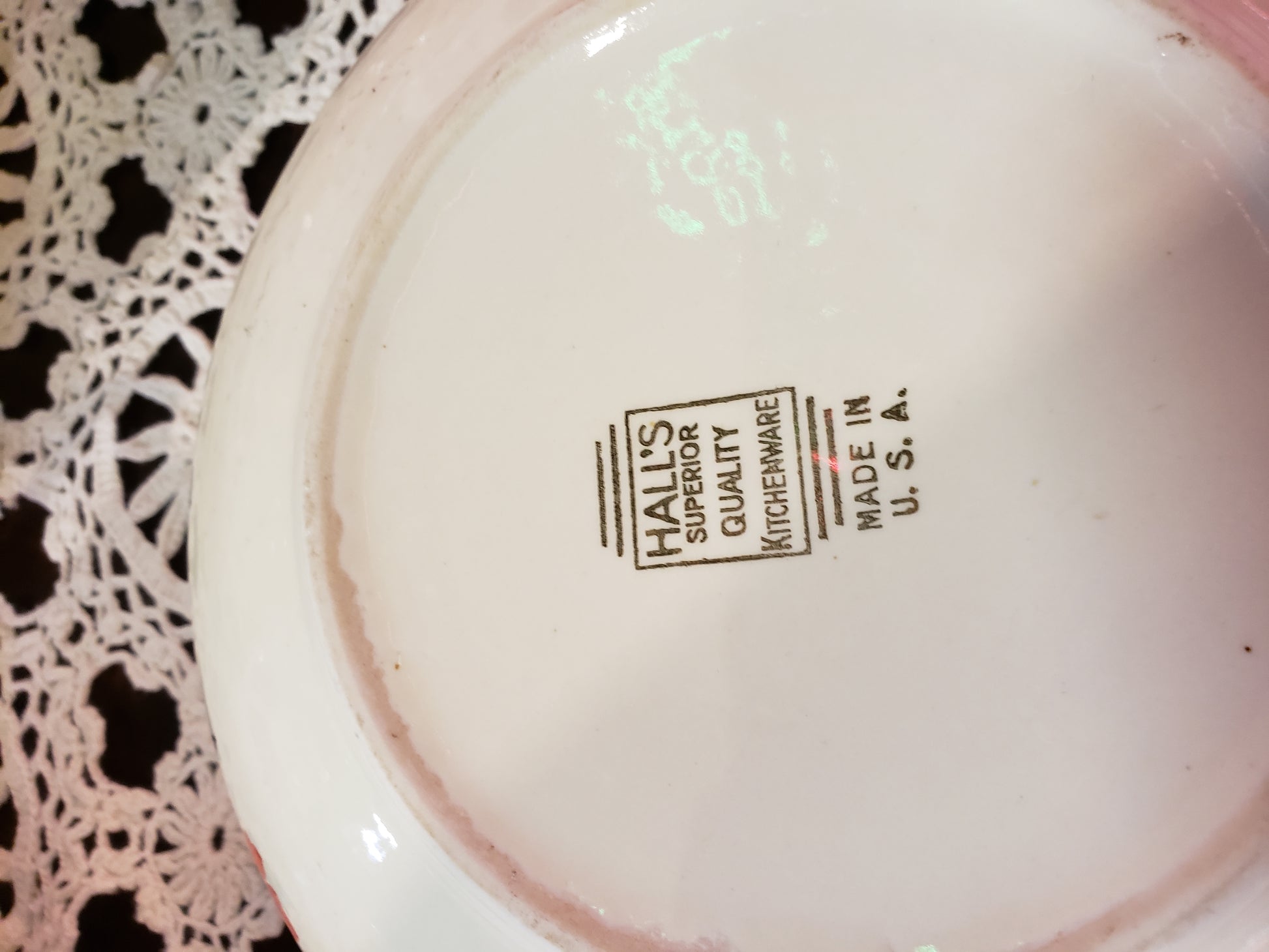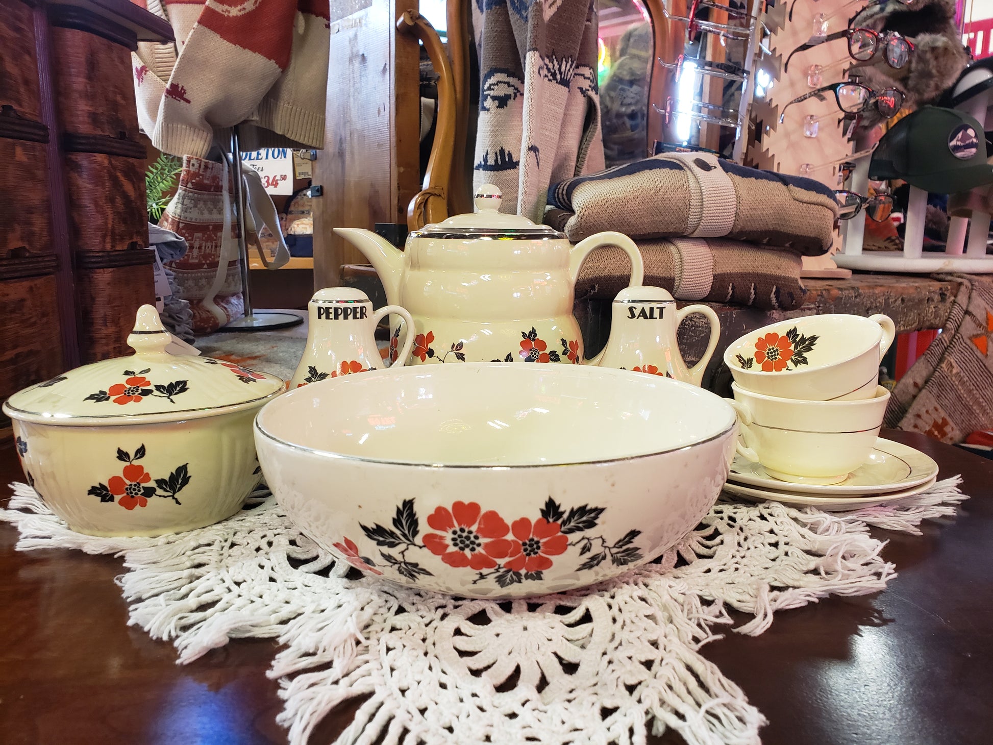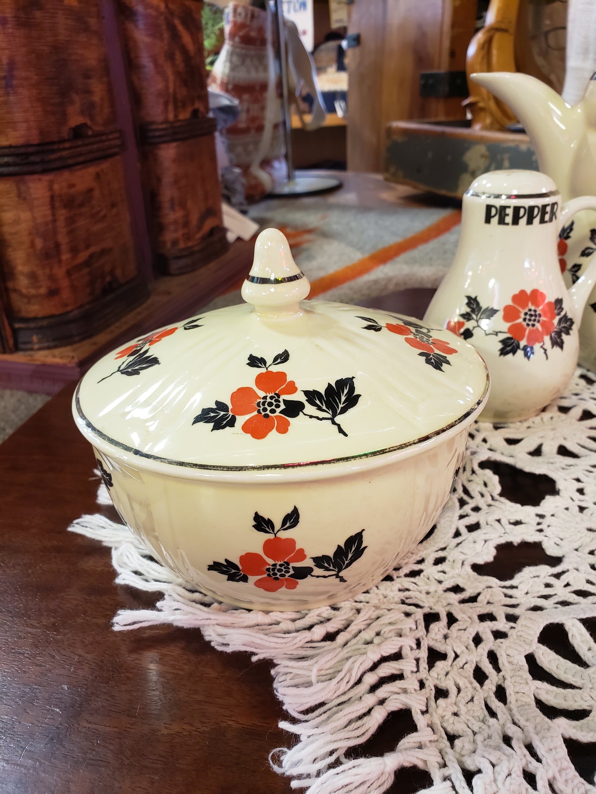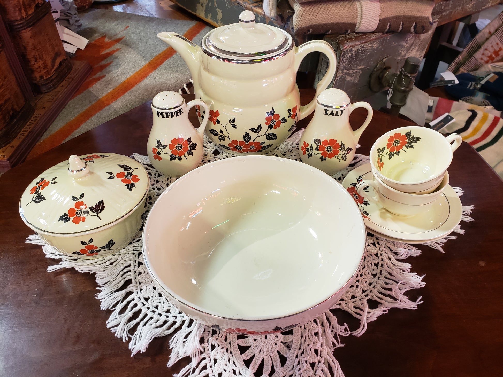 Vintage Hall China Red Poppy pattern Serving set has a lovely floral pitcher with lid, salt & pepper shakers, two teacups and saucers, a sugar bowl with lid and a 9 inch diameter bowl. Each item is rimmed in silver. Superior Hall Quality Dinnerware made in USA. 9 pieces with two lids. This would make a fabulous 1940's era table display or a nice addition to a farmhouse decor. This set is in fair vintage condition. Recently reduced in price.