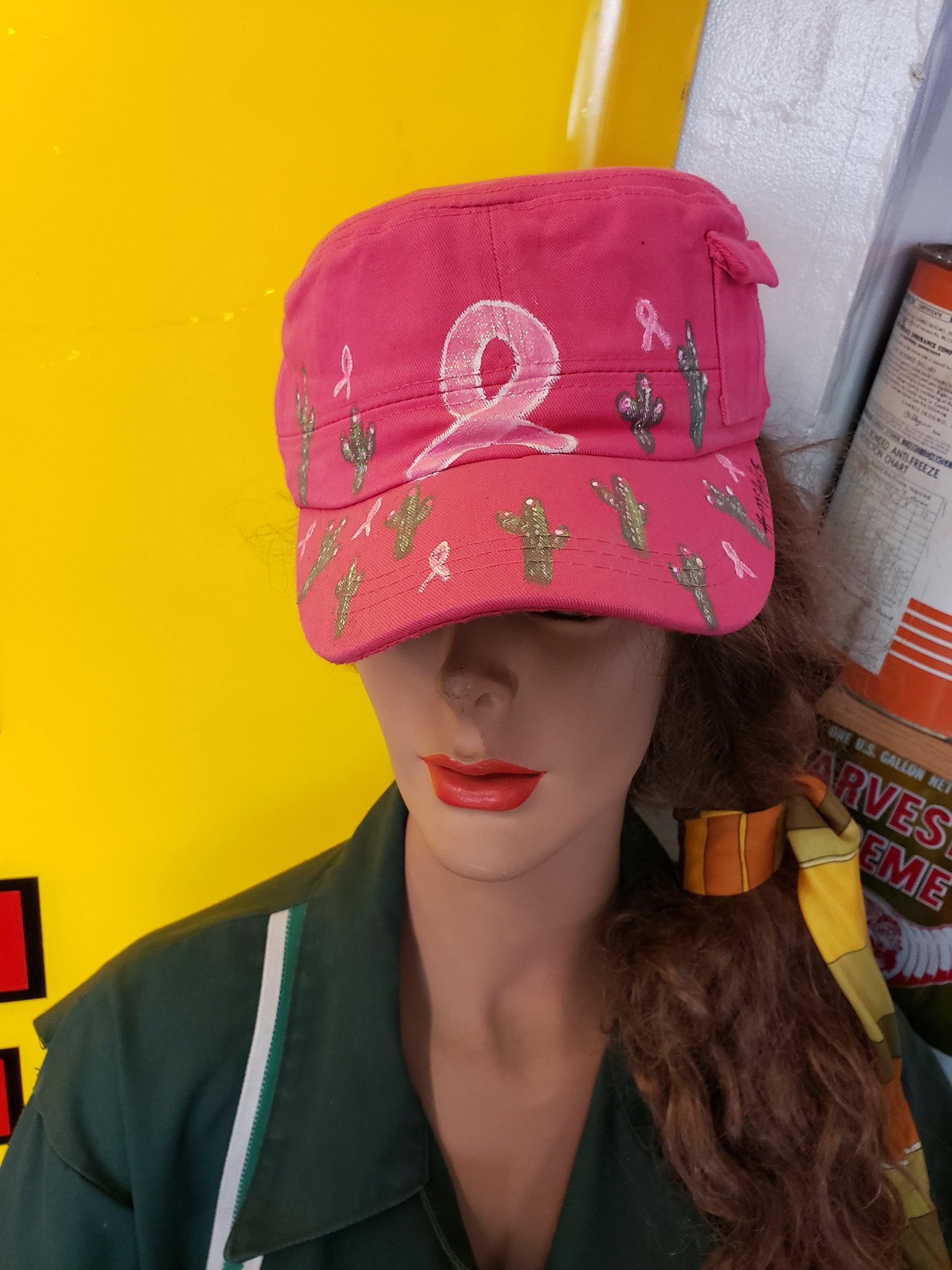 Cancer Awareness Hat was hand painted by Holly McAnlis of St. Onge, SD. Pink Twill hat with an adjustable band, plus it has a cute little pocket on the side. Painted with sparkly cactuses and pink ribbons. RED TAG SALE!
