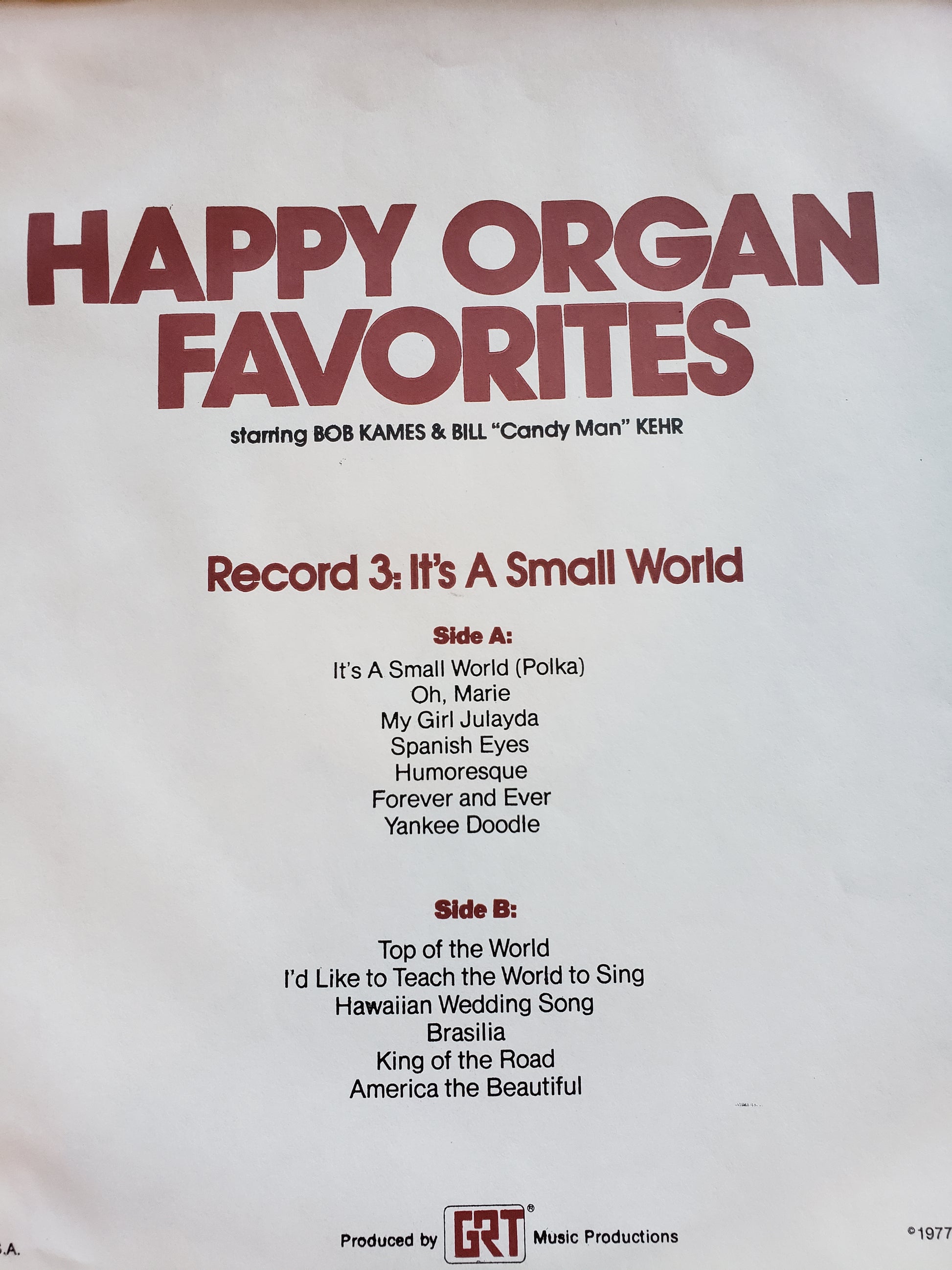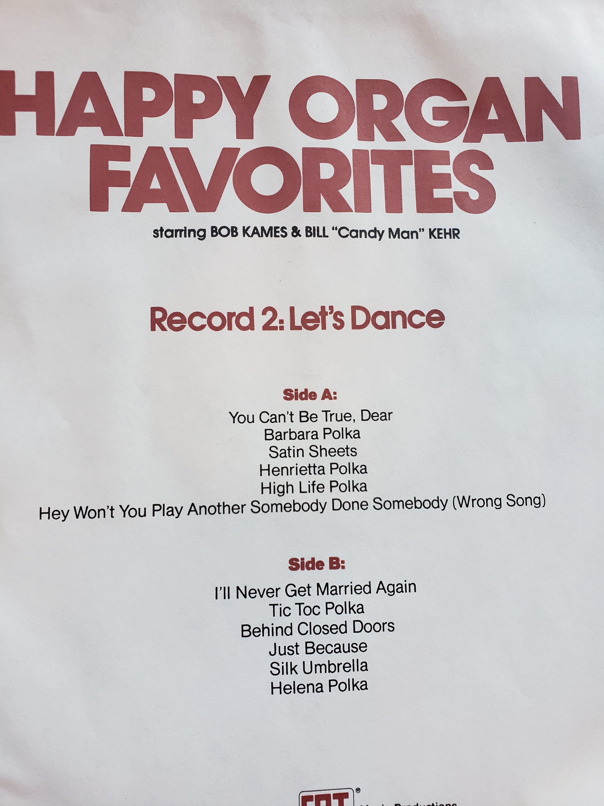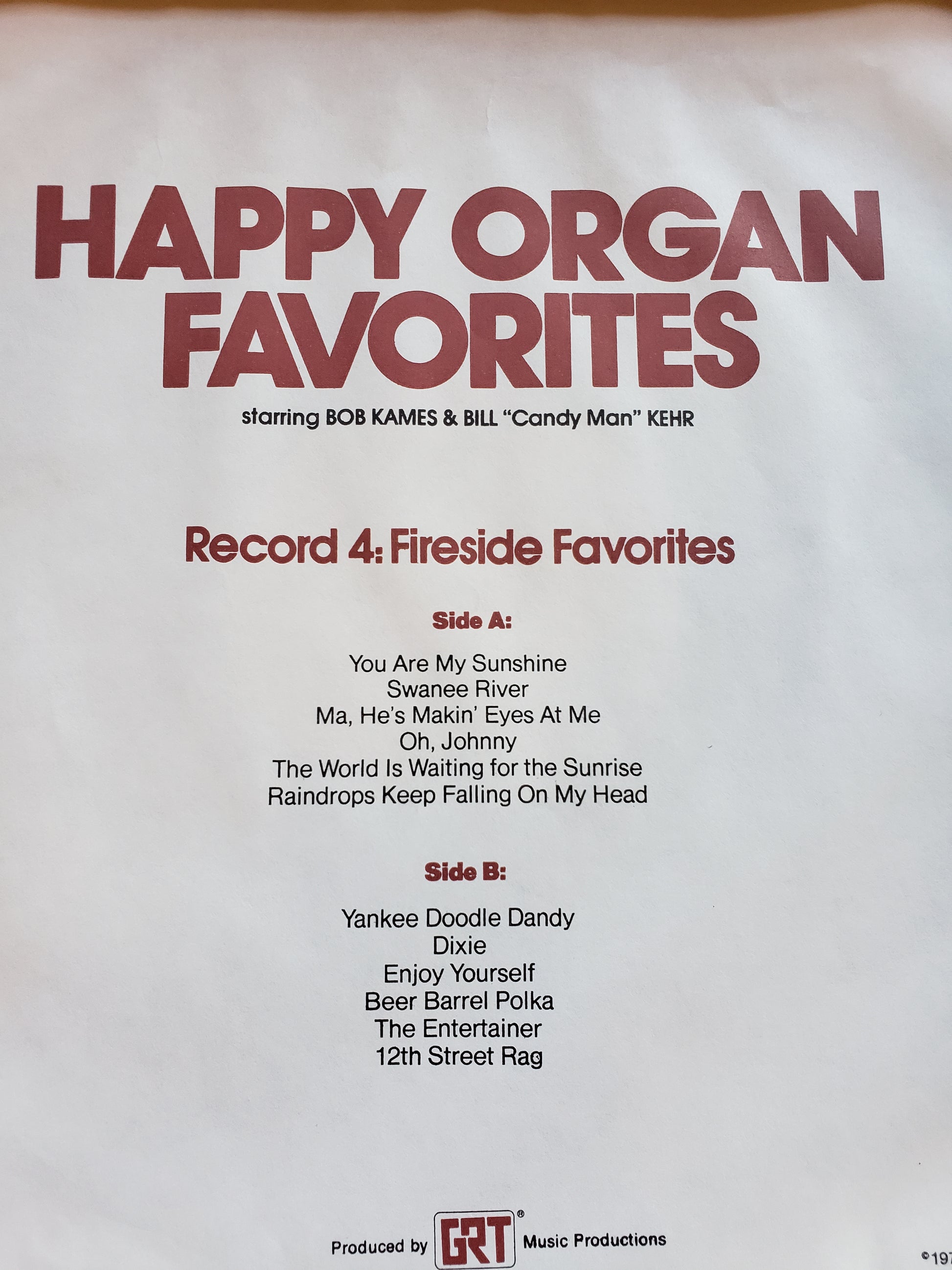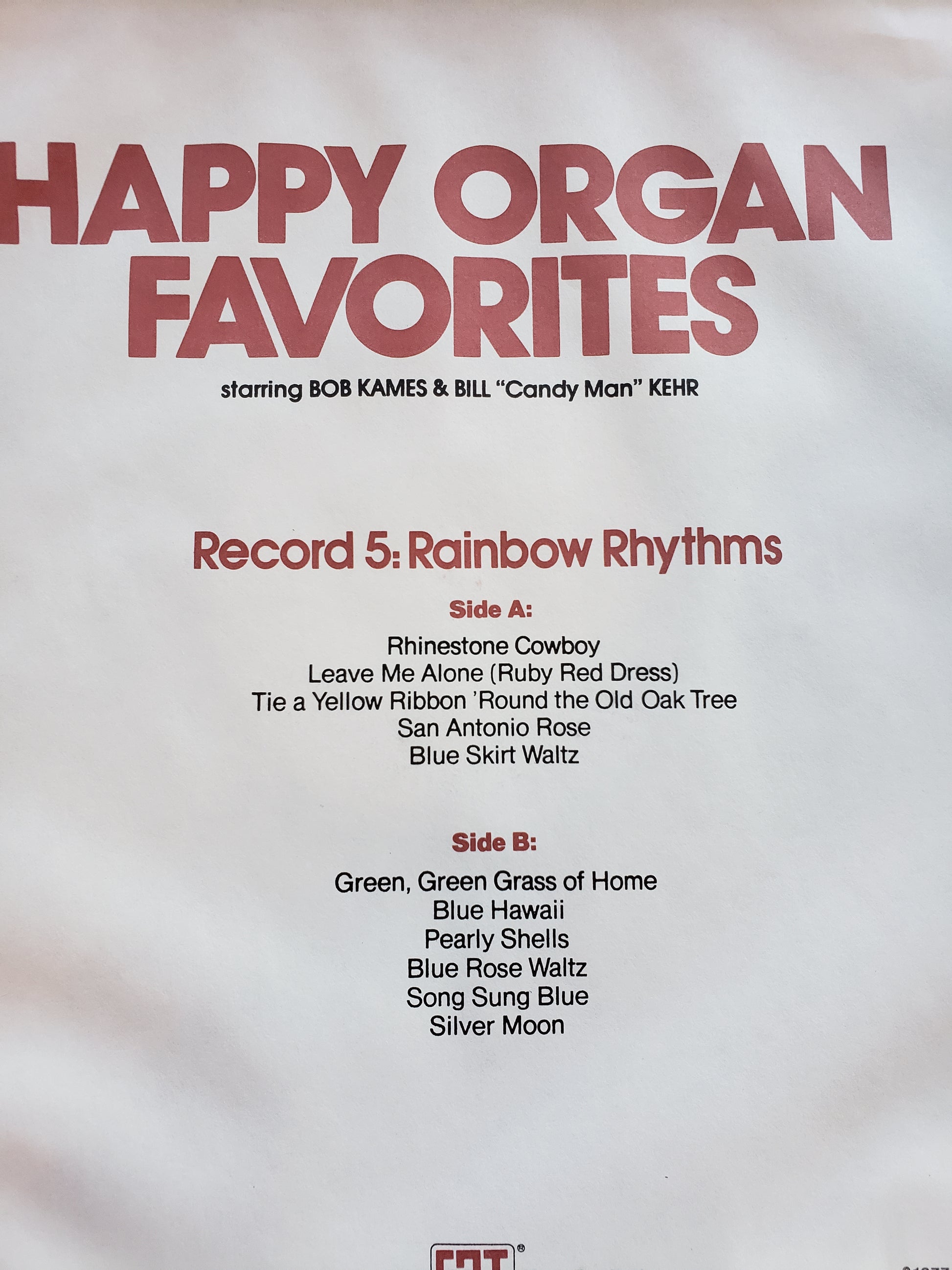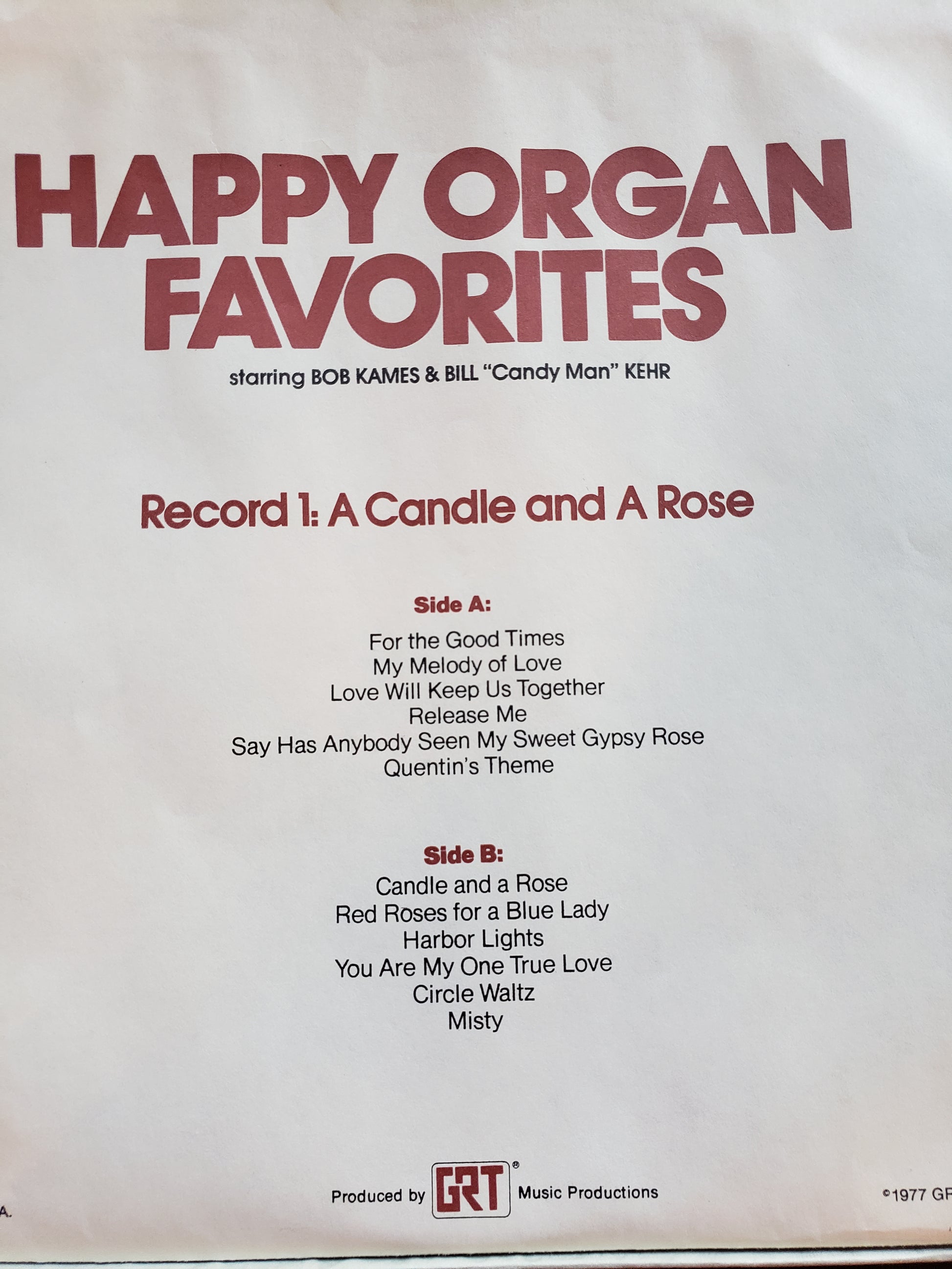Happy Organ Favorites box set featuring tunes performed by Bob kames & Bill "Candy Man" Kehr. This is a five record set, each in it's own protective sleeve, produced in 1977. They have been well taken care of, the vinyl is in great condition.
