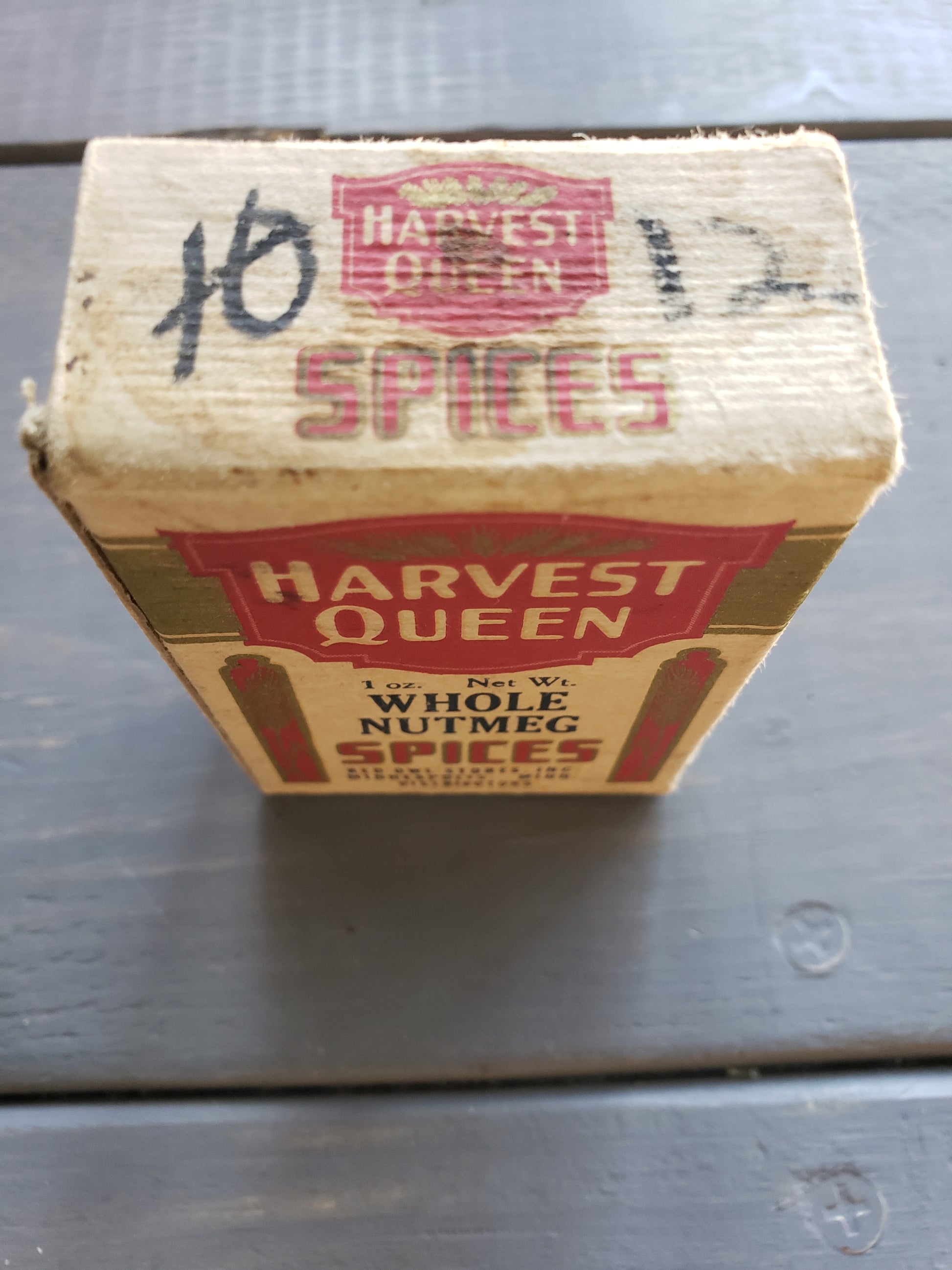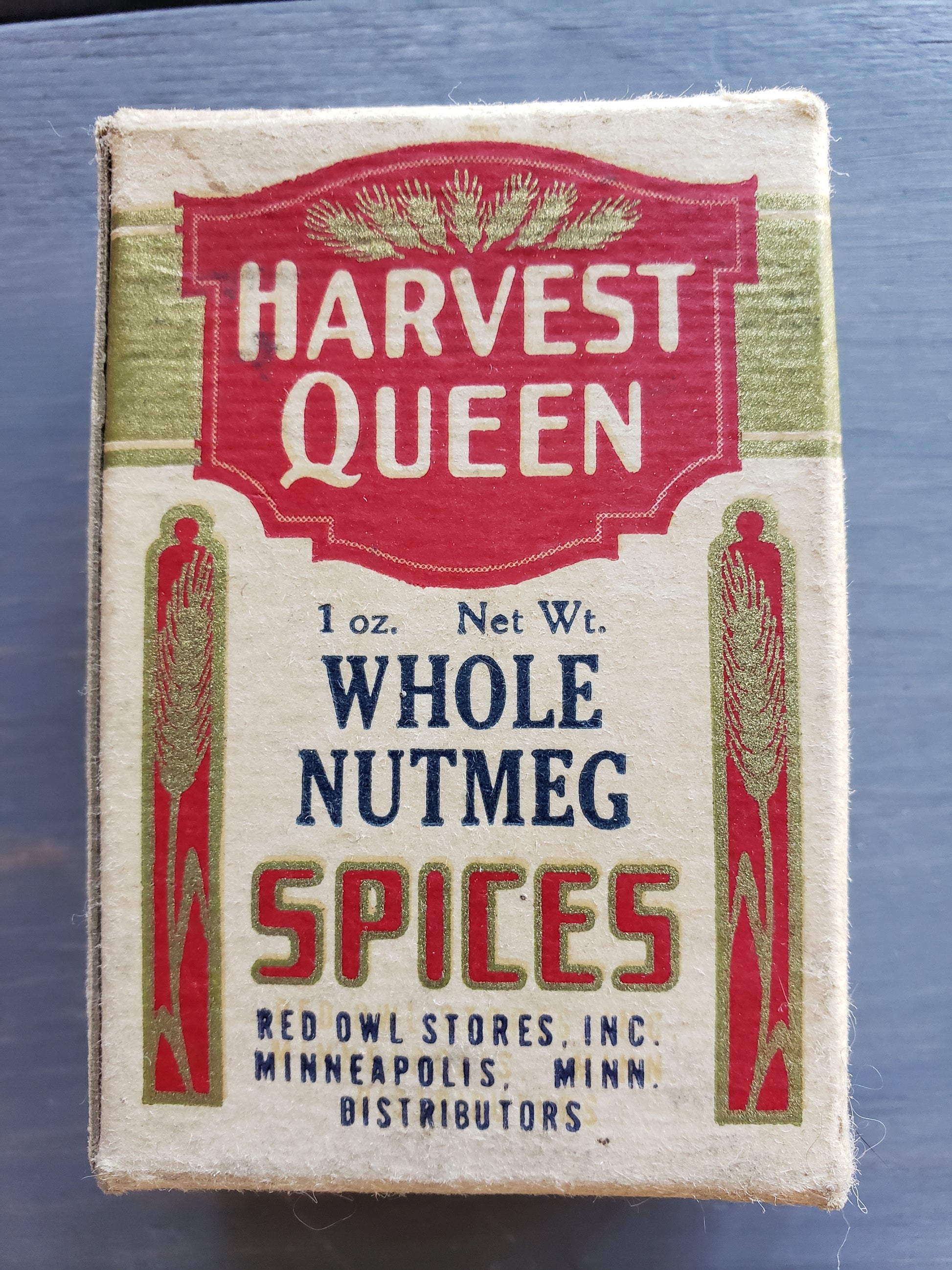 Upgrade your vintage spice box collection with the Harvest Queen Whole Nutmeg box. This colorful box from Harvest Queen Spices will add a touch of nostalgia to your kitchen. The nutmeg inside is very old, would not recommend using it! One ounce box from Minneapolis, Minnesota. Fair condition.