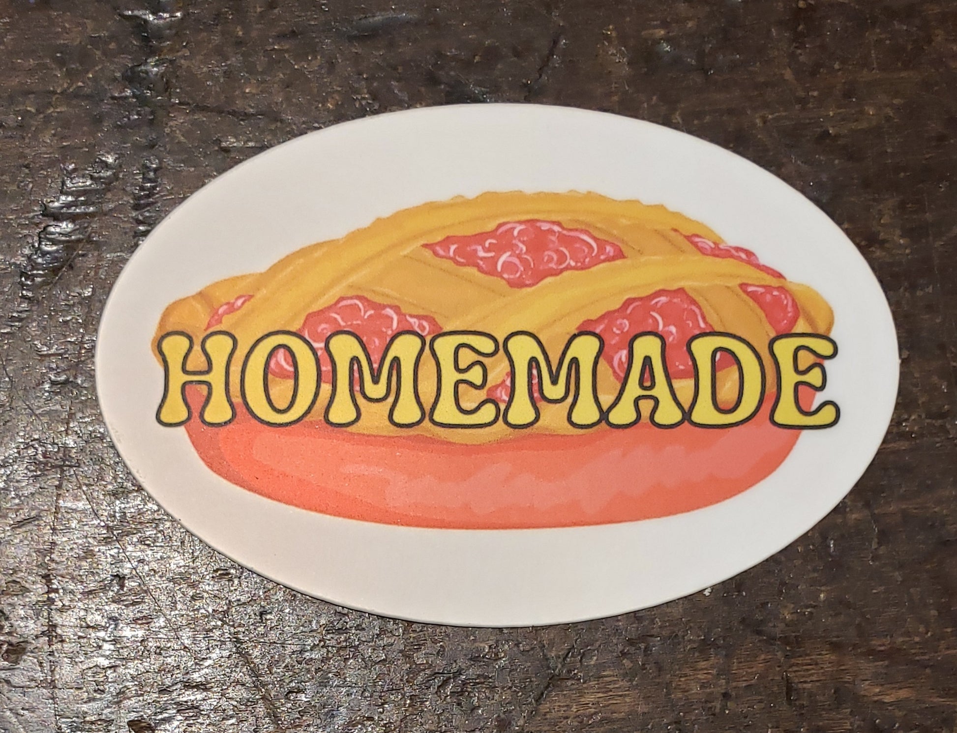 Homemade Decal features a pie in the background. Designed by Denica Shell of Wyoming. 3 inches across.