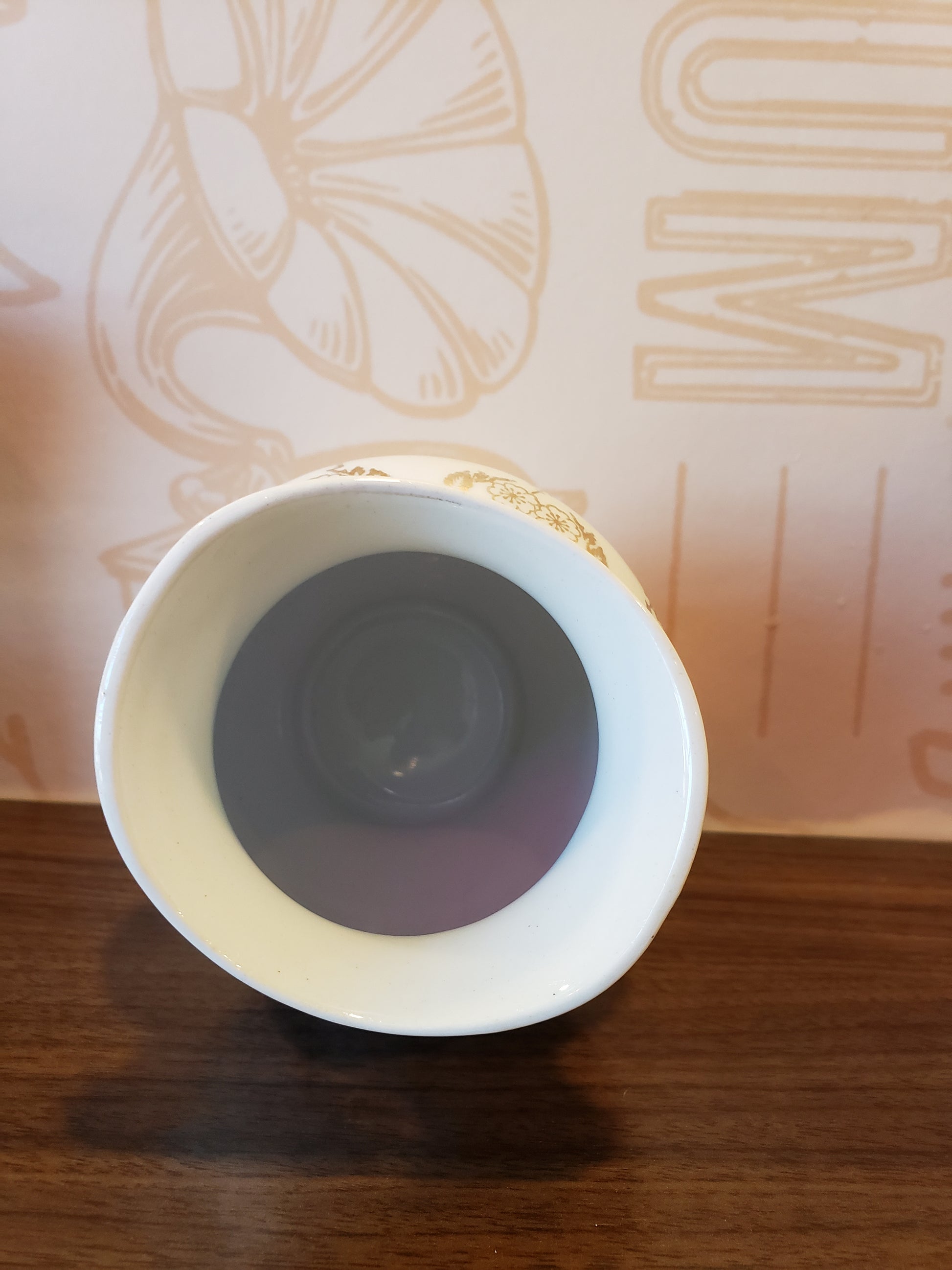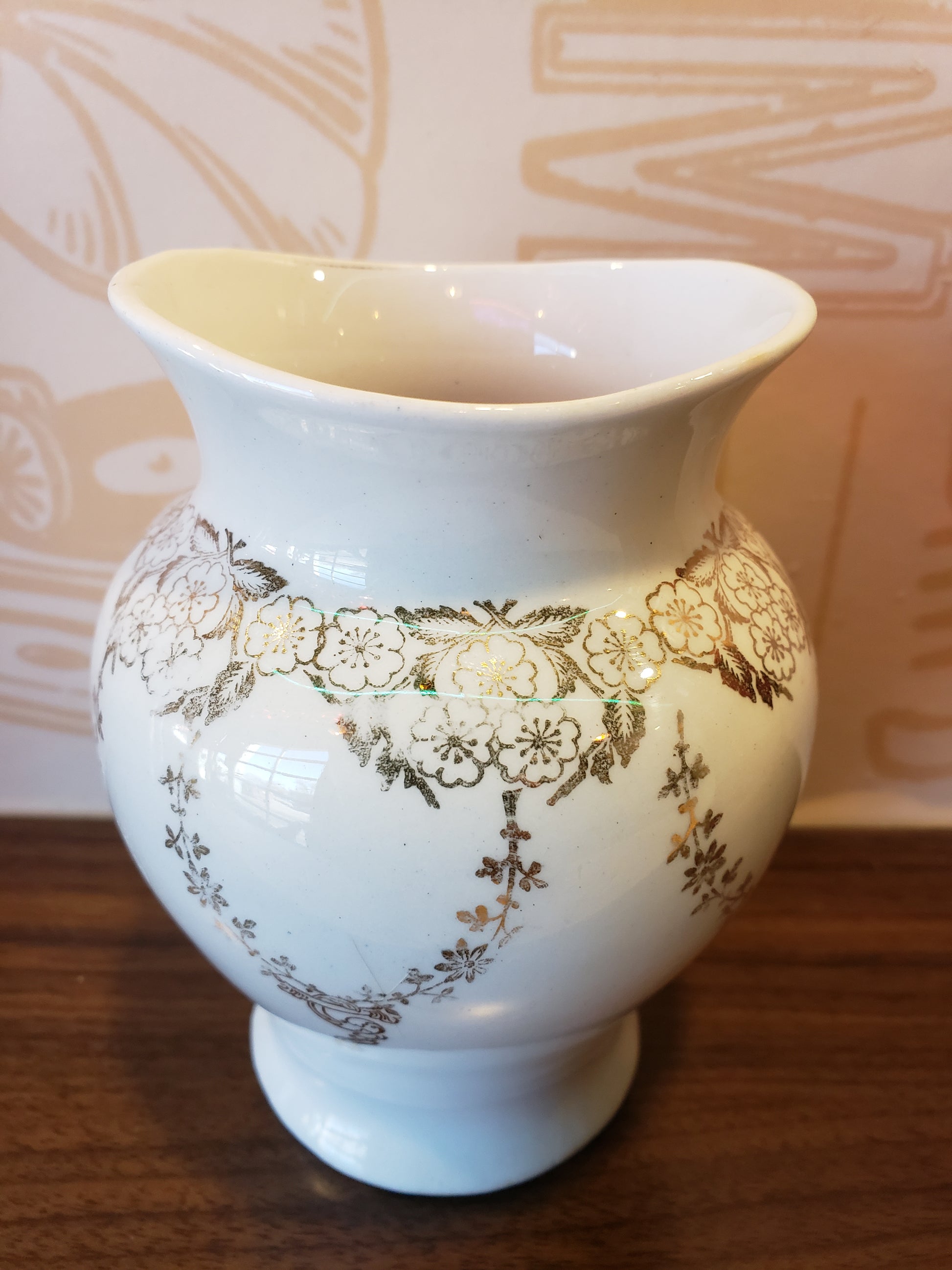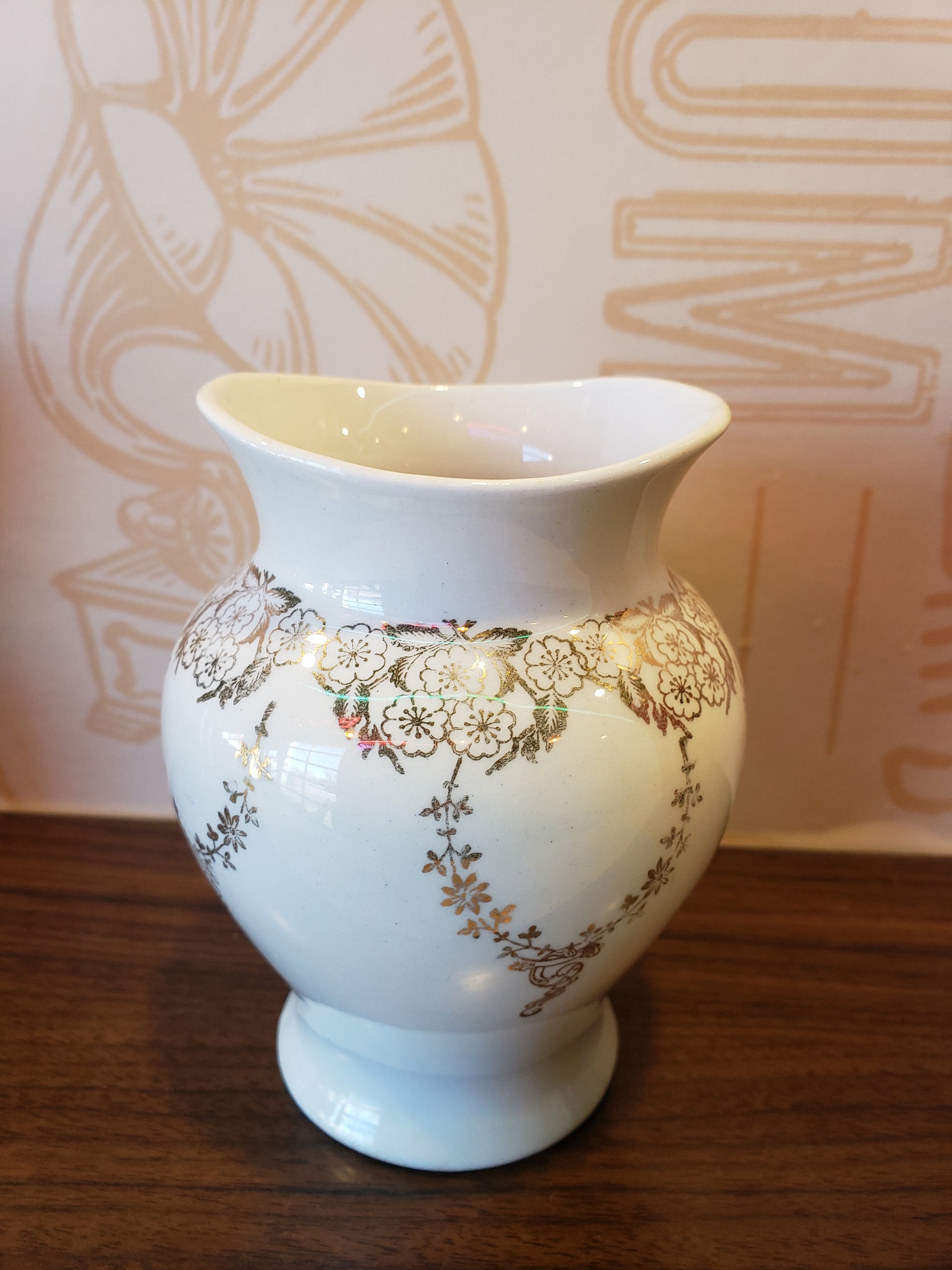 Add a touch of vintage charm to your home decor with this stunning Homer Laughlin vase. Featuring a classic white design with elegant golden floral details, this vase is sure to elevate any space. Perfect for displaying your favorite flowers or as a standalone decorative piece. It stands 4.75 inches tall and is in fair vintage condition.