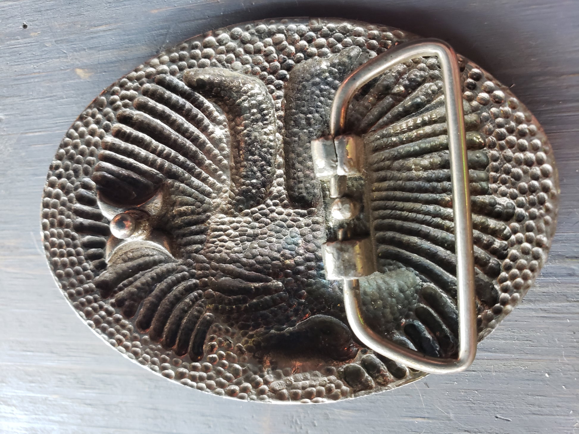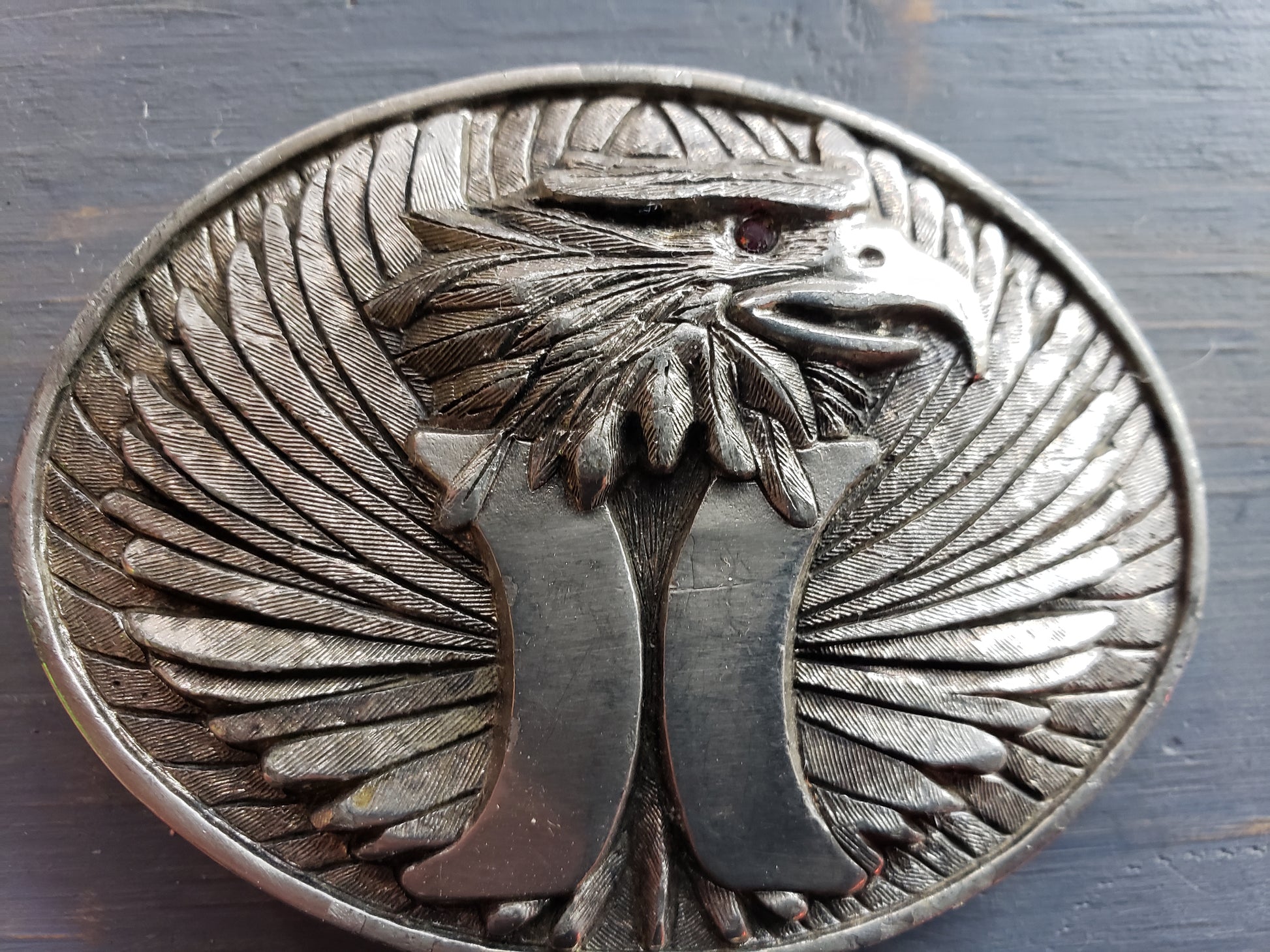 The Hurley Eagle Belt Buckle showcases a vintage design featuring an eagle with raised wings and a striking red rhinestone eye. Highlighted by the iconic Hurley logo, this buckle adds a bold, distinctive touch to your outfit. Perfect for those who want to express style and confidence with a classic yet eye-catching accessory. Fair vintage condition.