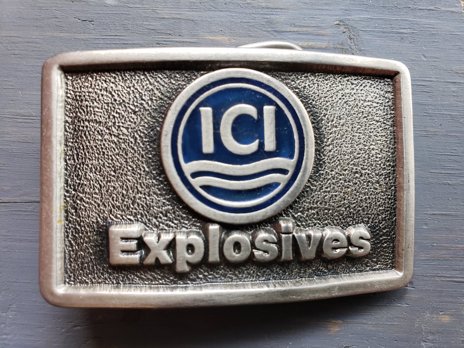Vintage belt buckle advertising ICI Explosives. This is a silver colored metal belt buckle with blue in the circle with the logo. Fair vintage condition.