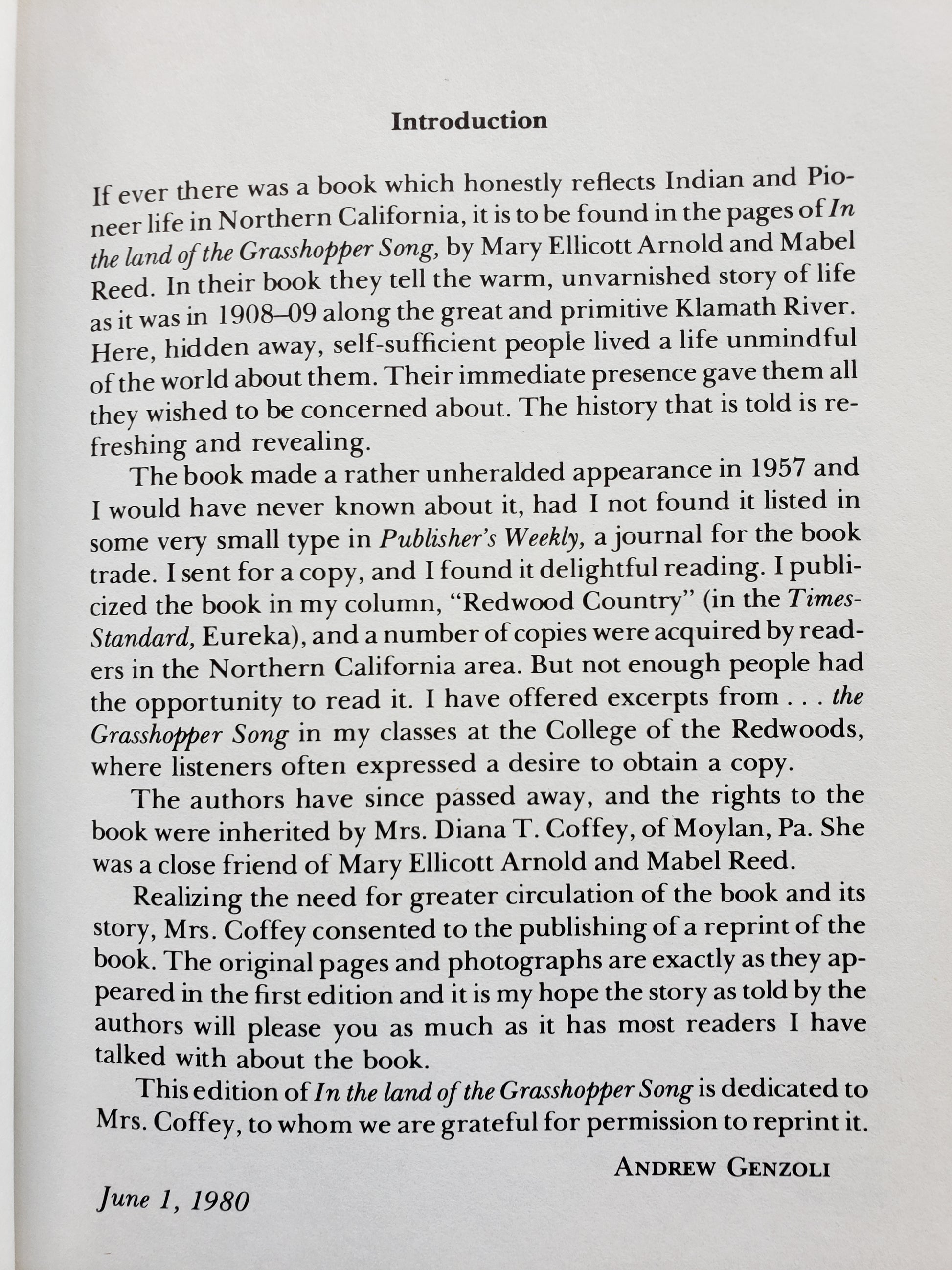 In the Land of the Grasshopper Song by Mary Arnold and Mabel Reed offers a compelling glimpse into the lives of two women navigating the Klamath River Indian Country during 1908-1909. This 1980 Bison Books first printing paperback spans 313 pages, blending historical insight with personal narrative. A nuanced exploration of culture and resilience, this volume is an essential addition for those interested in early 20th-century Native American experiences. Fair vintage condition.