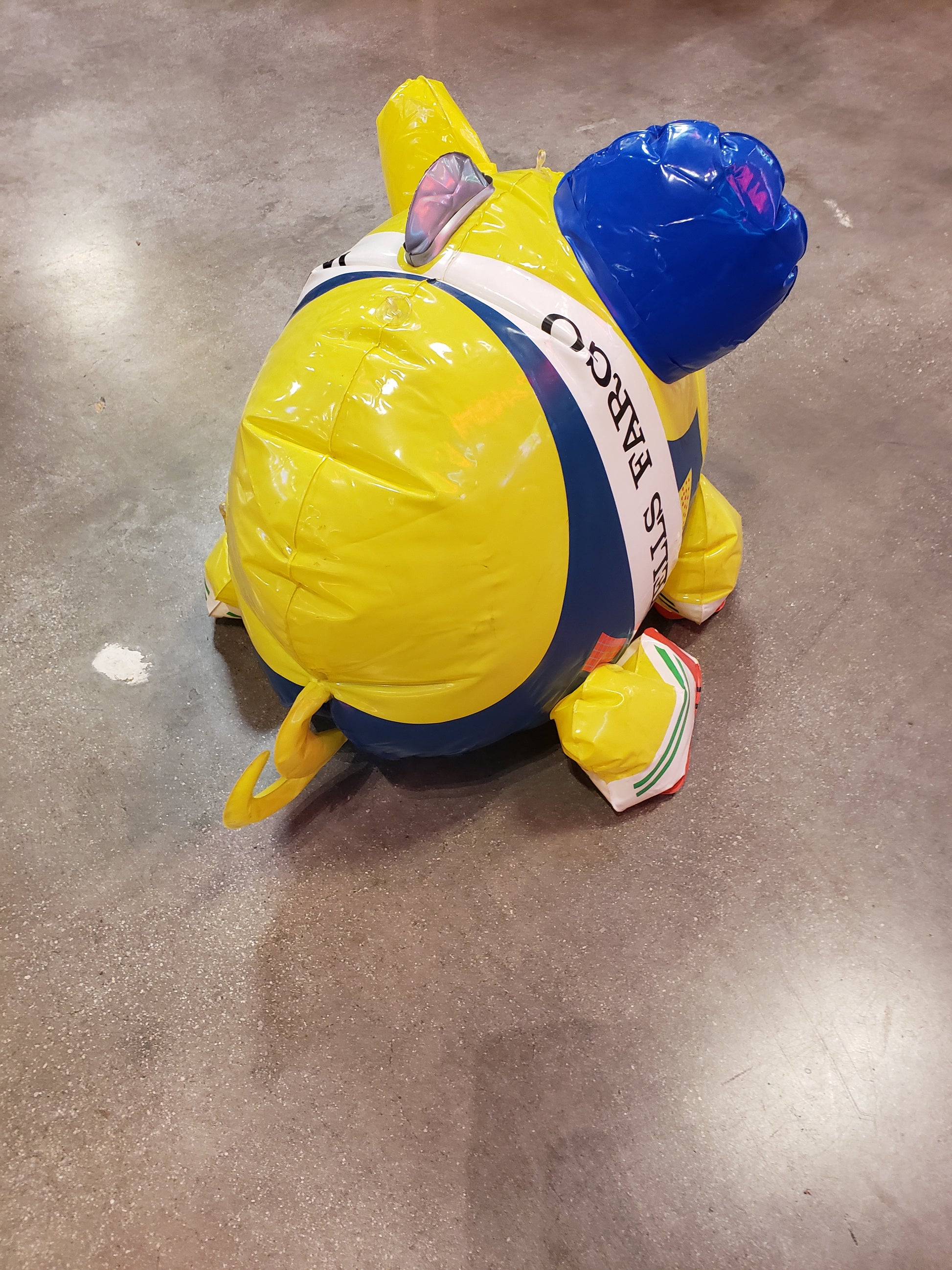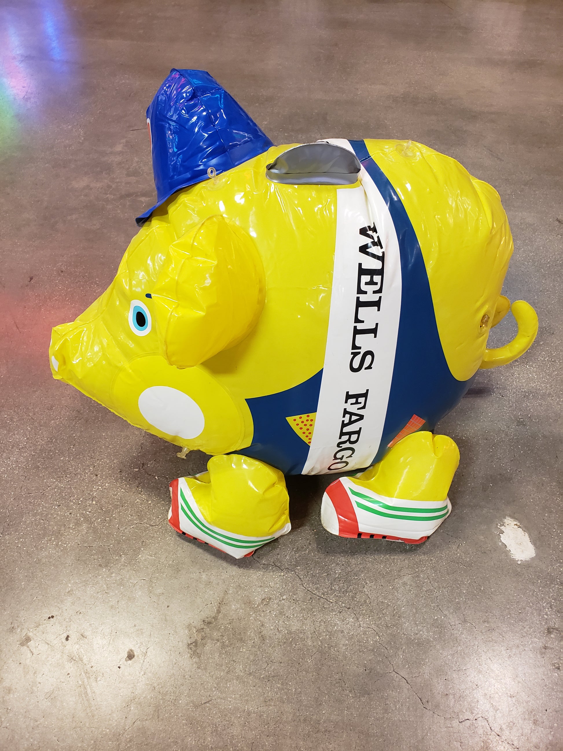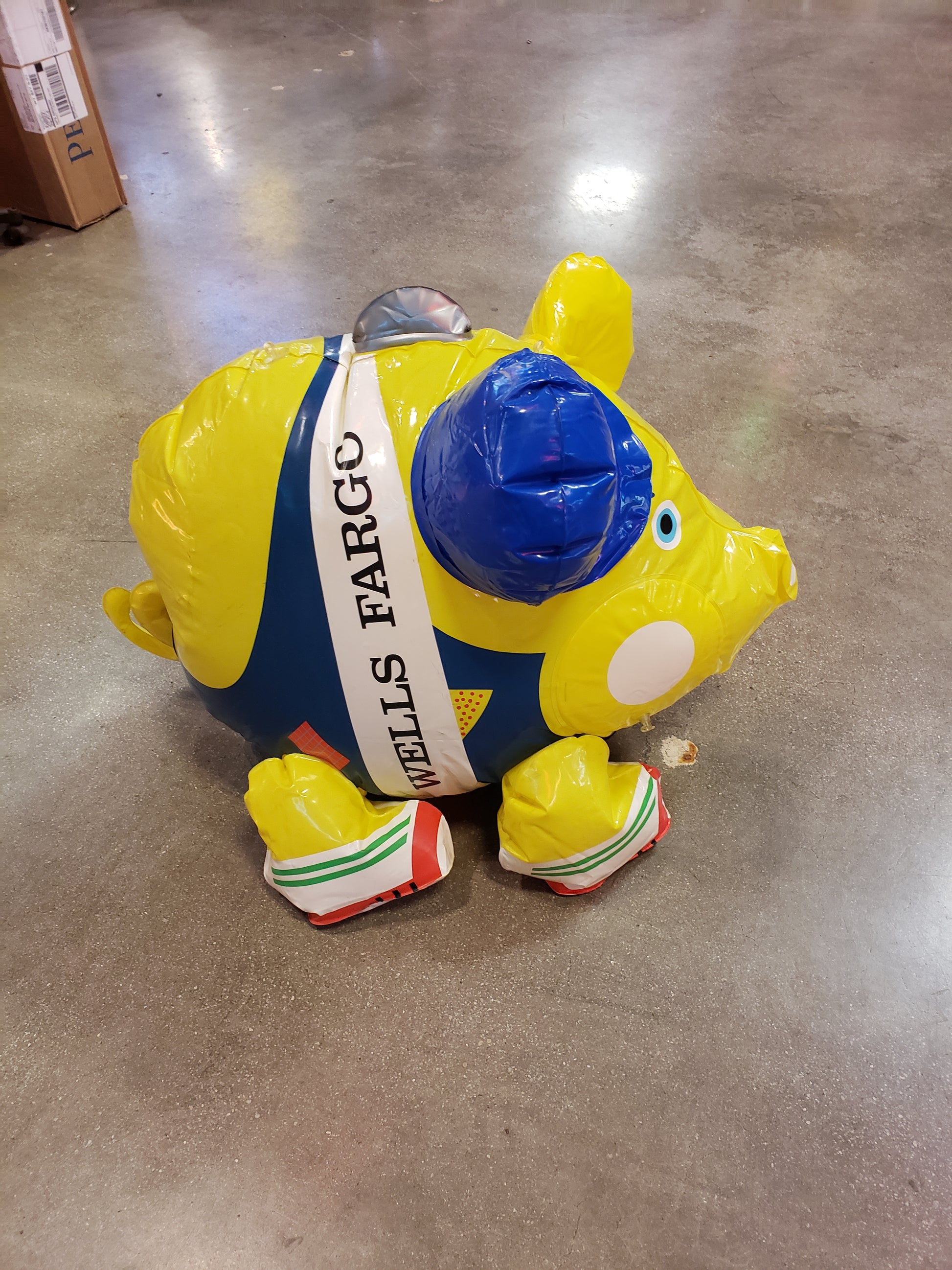 Vintage inflatable depicting a yellow piggy bank with a blue hat, with Wells Fargo around it's middle it stands 17 inches tall and 22 inches long when fully inflated. Cute advertising inflatable from the 1980's has been previously displayed. . He even has a curly tail! Fair vintage condition.