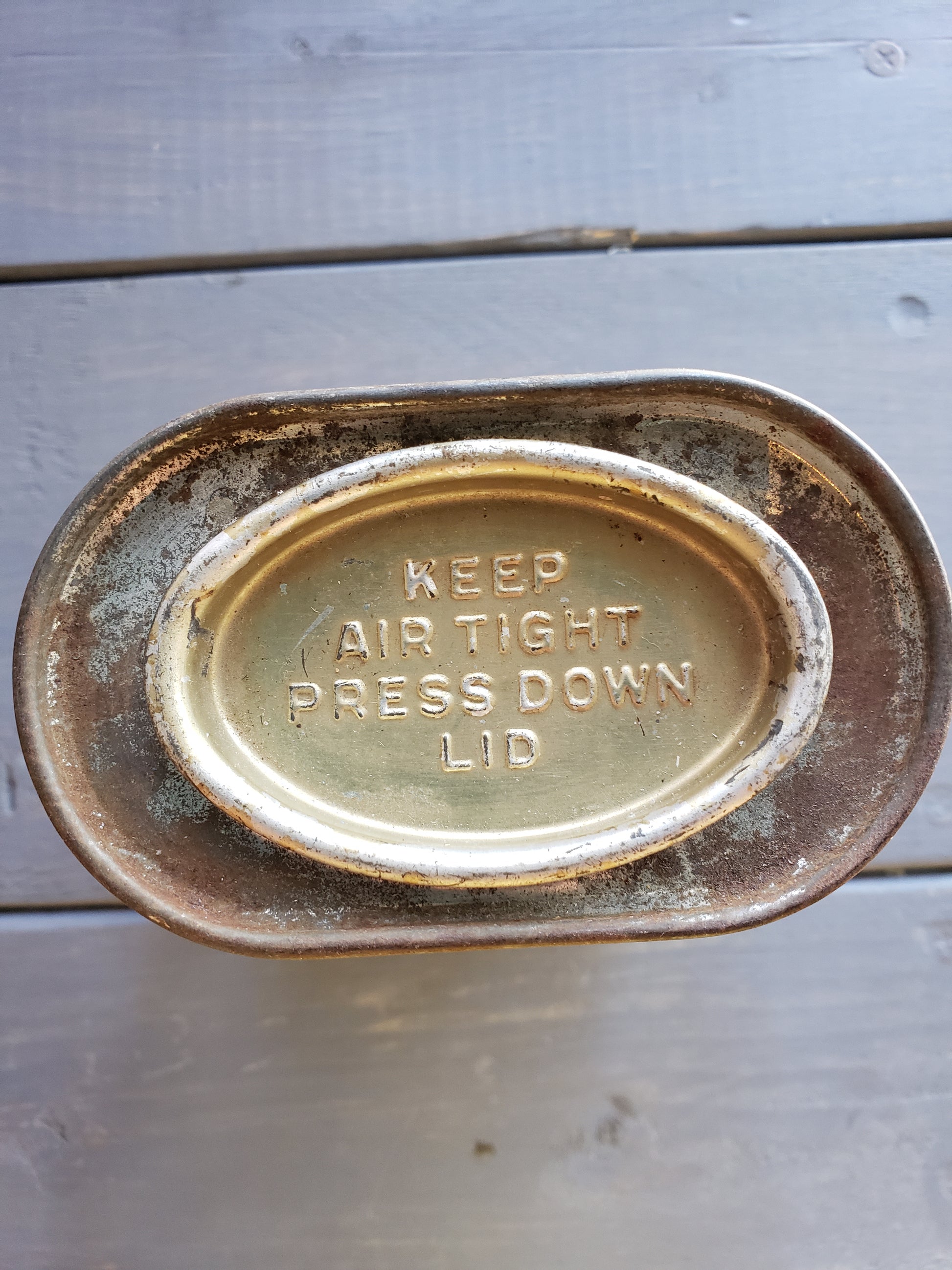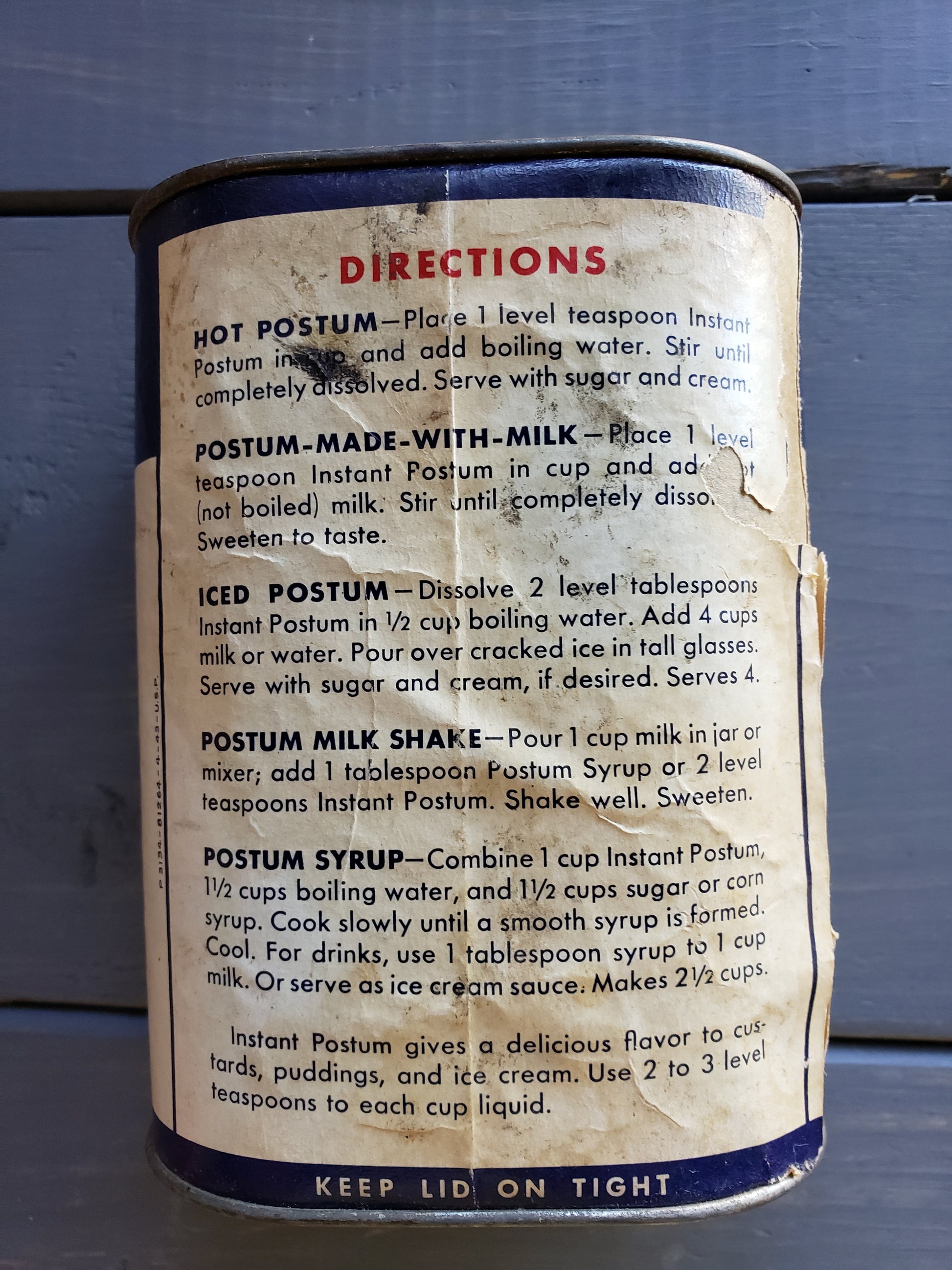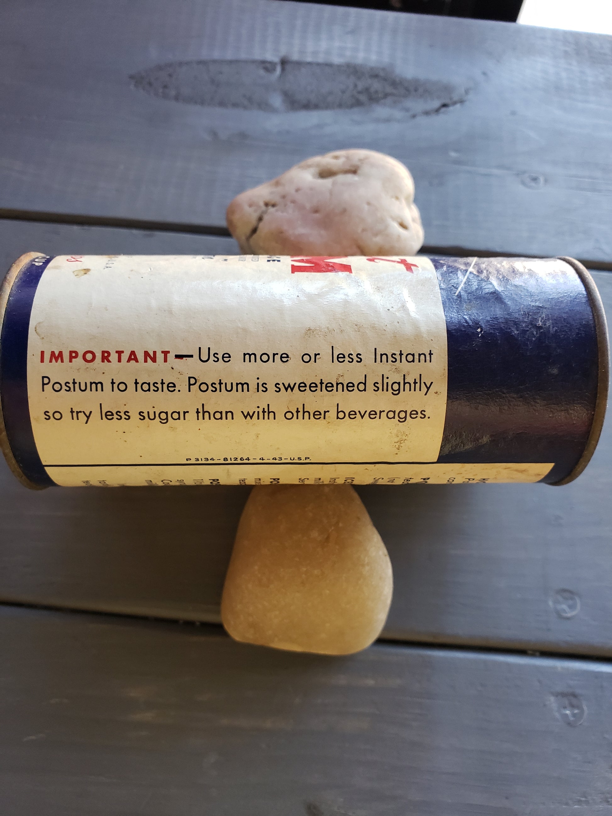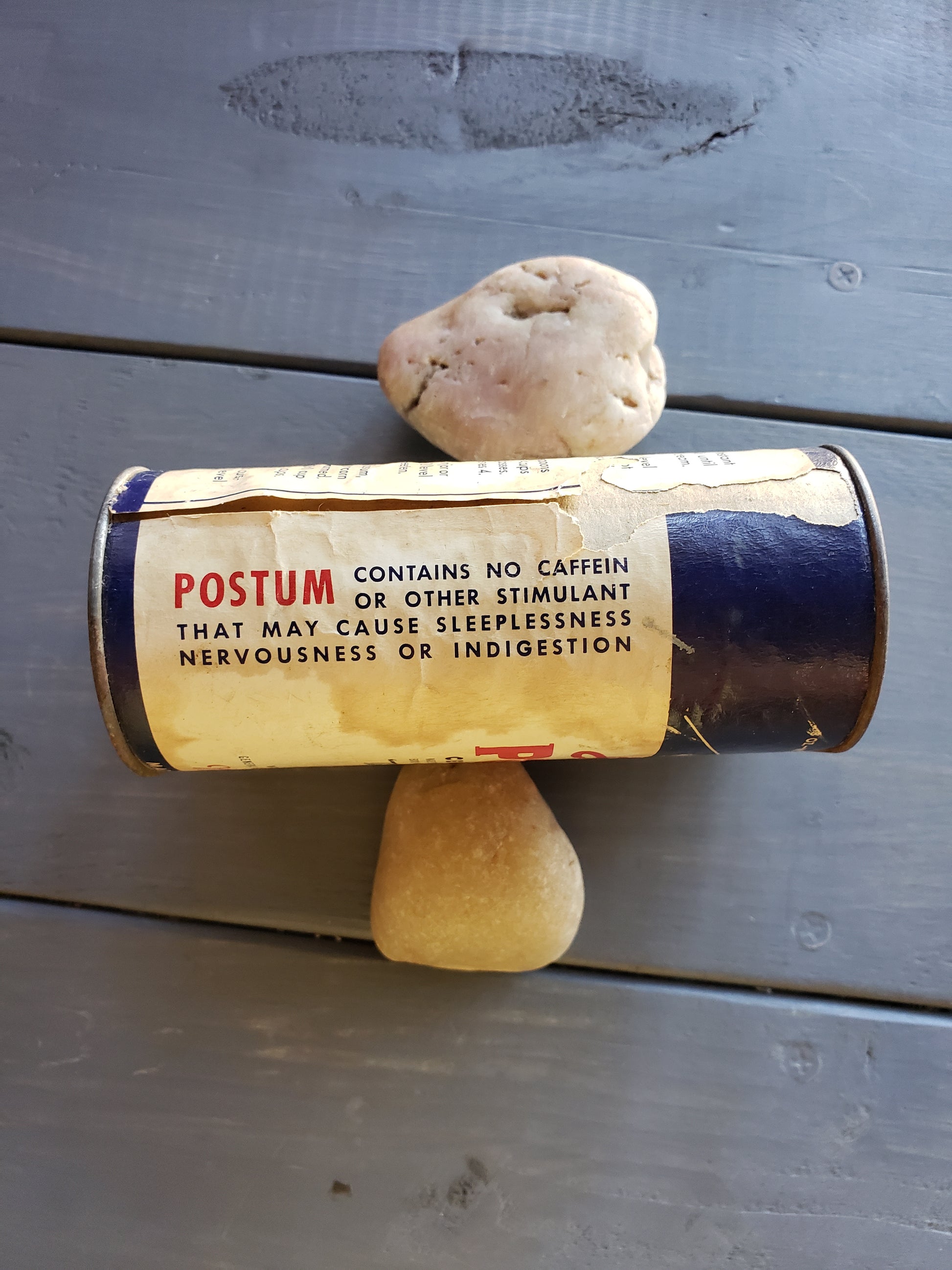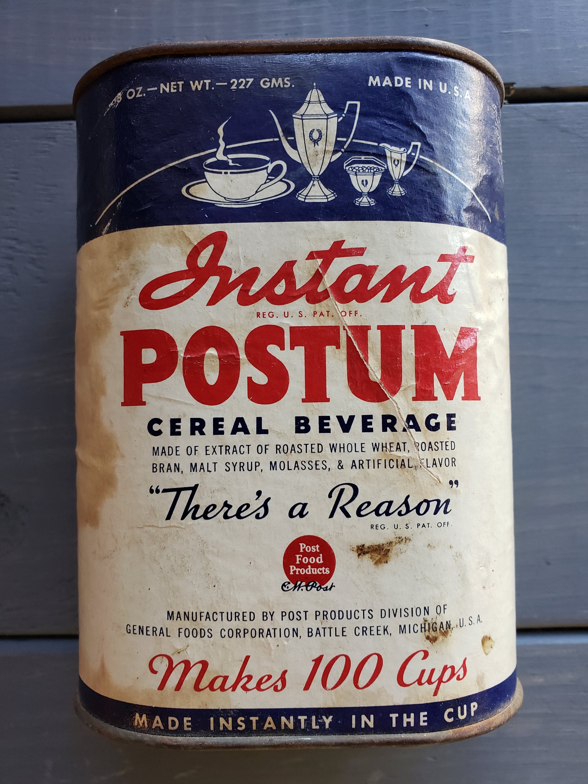 This vintage tin of Instant Postum offers a glimpse into the past with its colorful label. While it may show some signs of water damage, it still serves as a charming collectible. Perfect for those who appreciate nostalgia. Fair vintage condition. The lid is rusted shut.