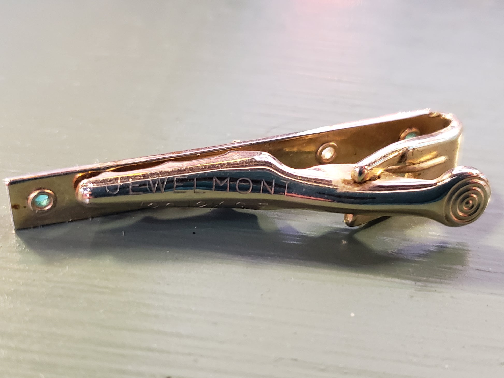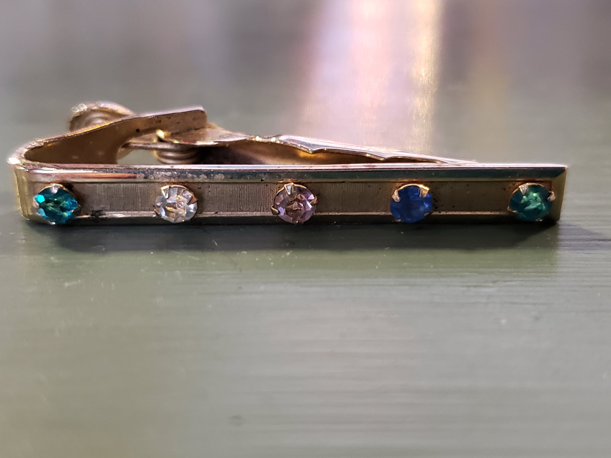 Elevate your style with the Jewelmont multi stone tie bar. This stunning piece, featuring green, blue, pink and clear stones, adds a touch of color and sophistication to any outfit. Crafted with 1/20 12K GF, it's a must-have accessory for any fashion-forward individual. Elegant tie bar in fair vintage condition. It would make a lovely scarf clip as well!