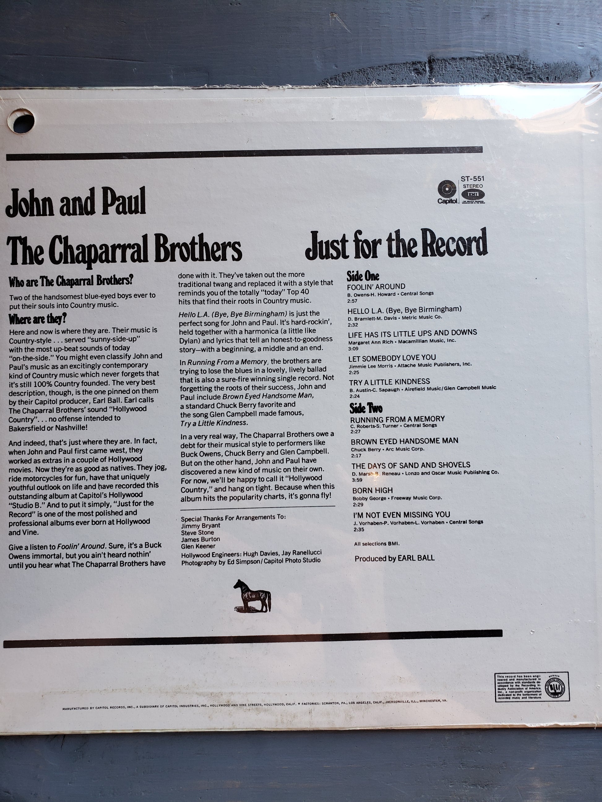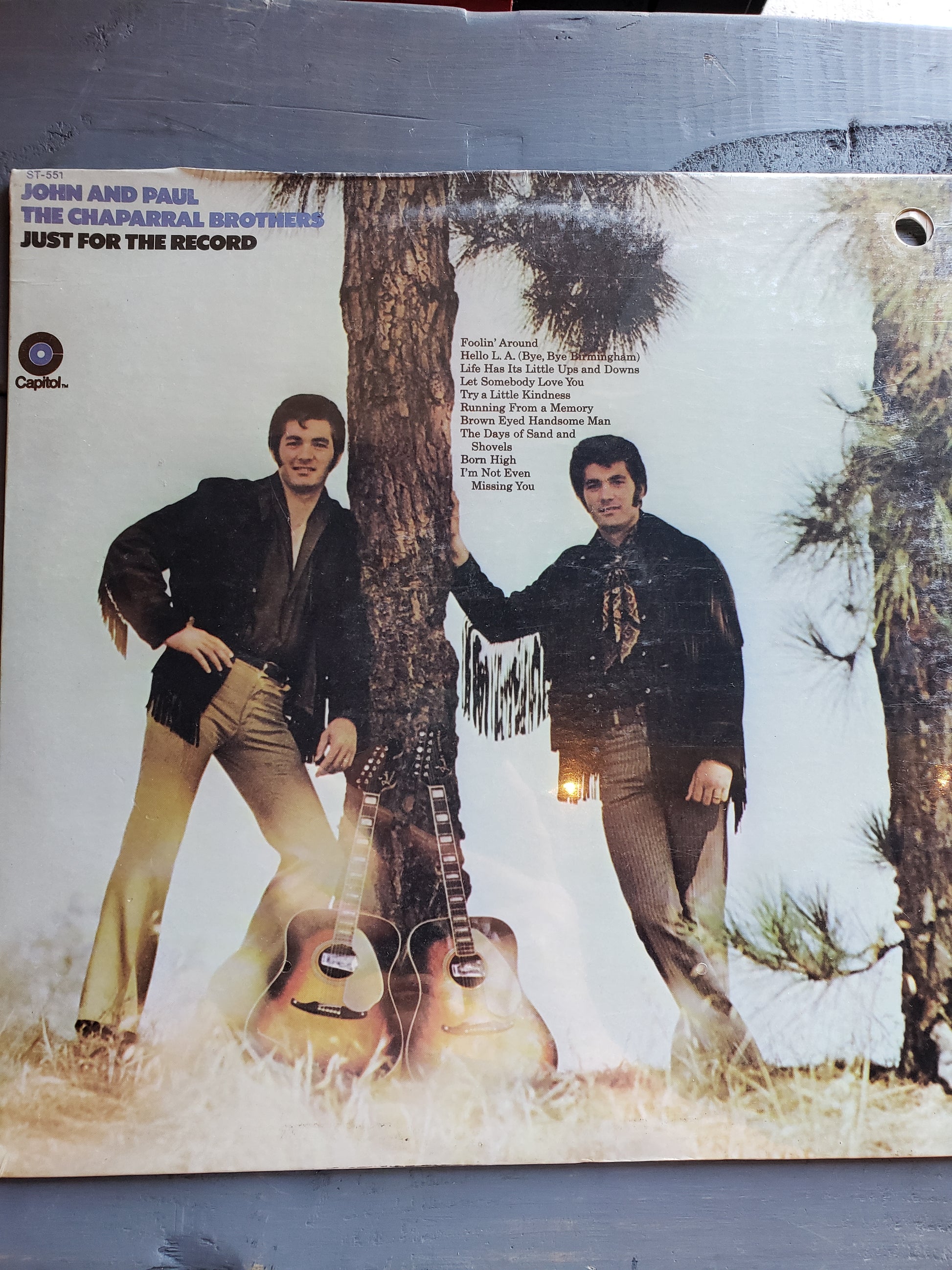 John and Paul, The Chaparral Brothers Just For the Record , a sealed record album. It does have a hole punched through the top right corner from where it was previously displayed. Capitol Records. 1970.