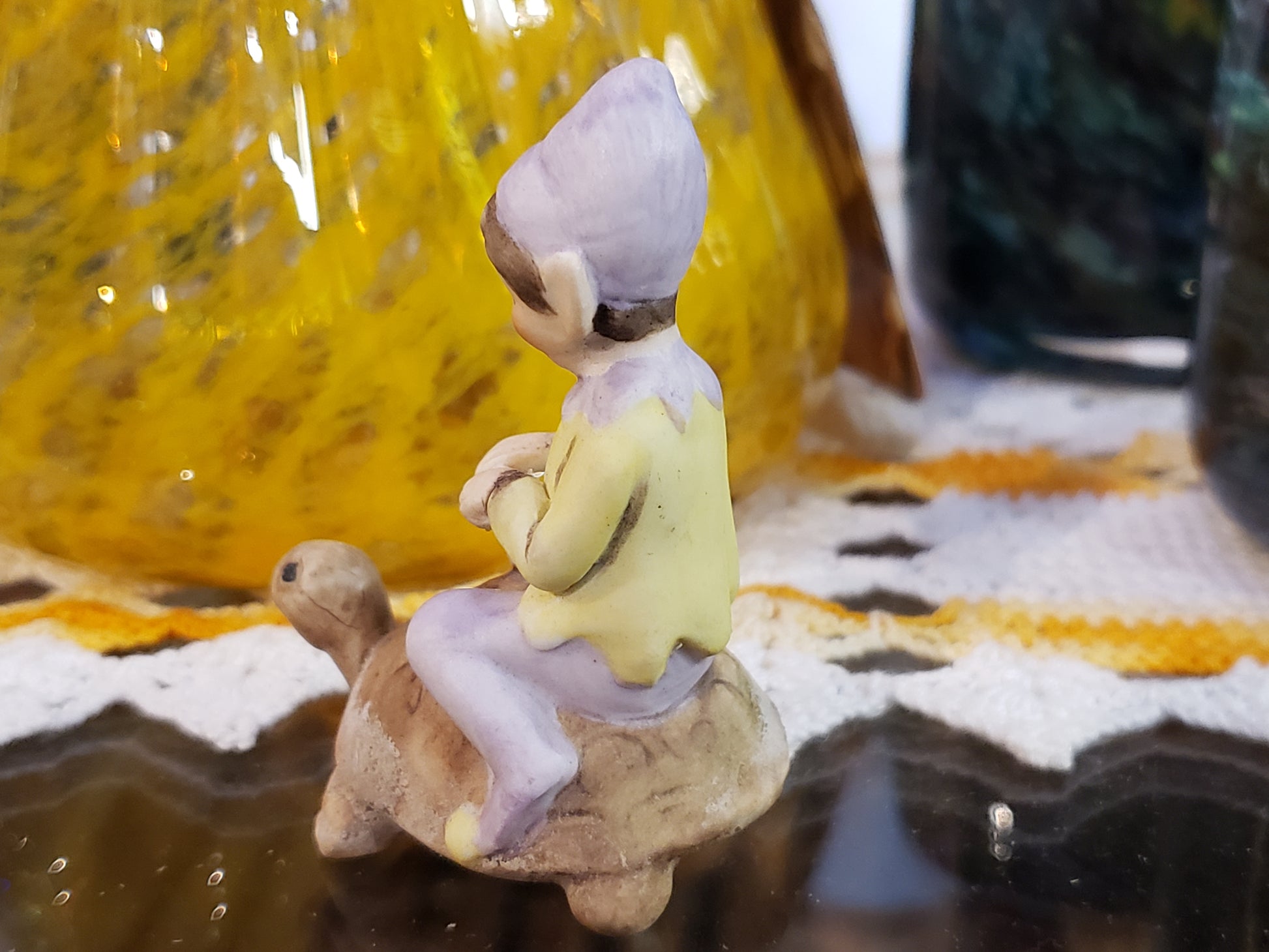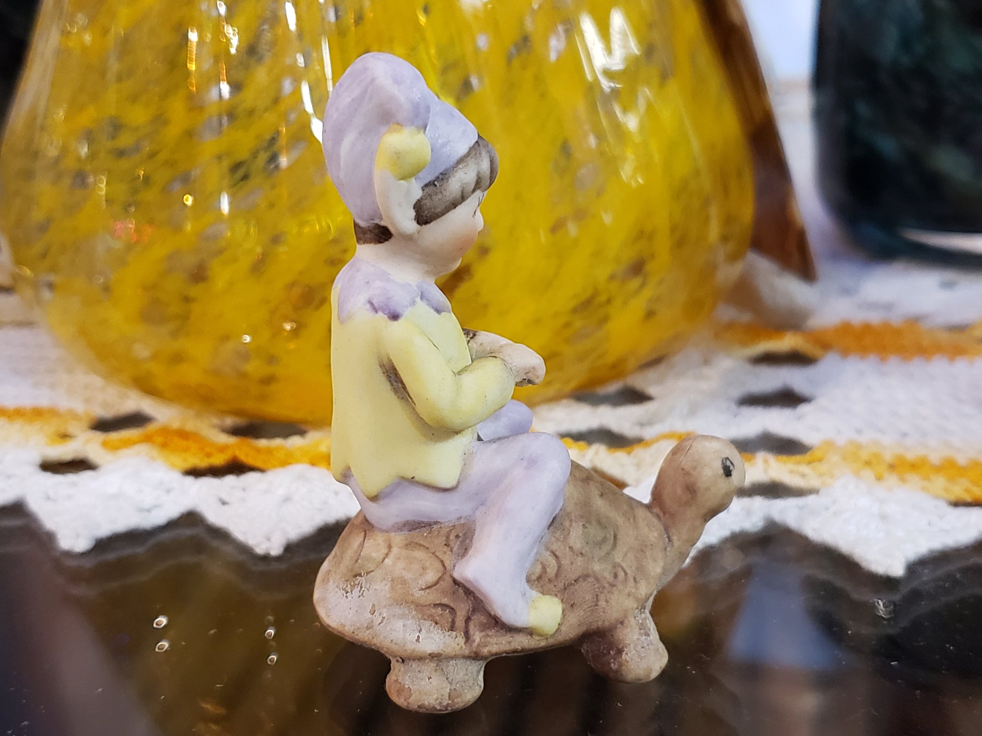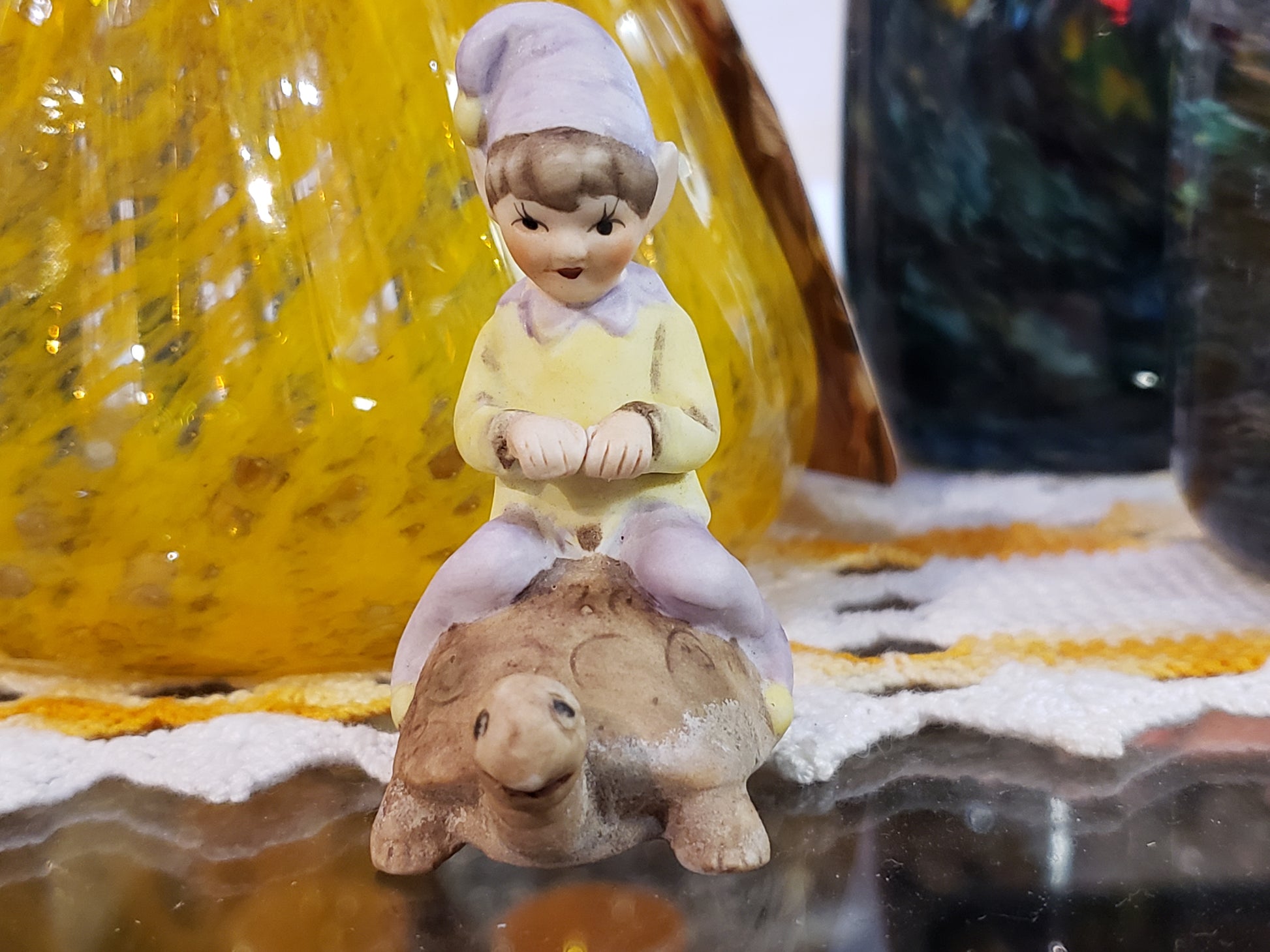 Add a touch of whimsy to your home with the Josef Originals Elf on Turtle figurine. This smiling turtle figurine will bring a smile to anyone's face. (Turtle-y awesome, right?!) Perfect for elf and turtle lovers alike! 😊🐢 Appears to be missing it's reins which were made from a piece of thread. Fair vintage condition.
