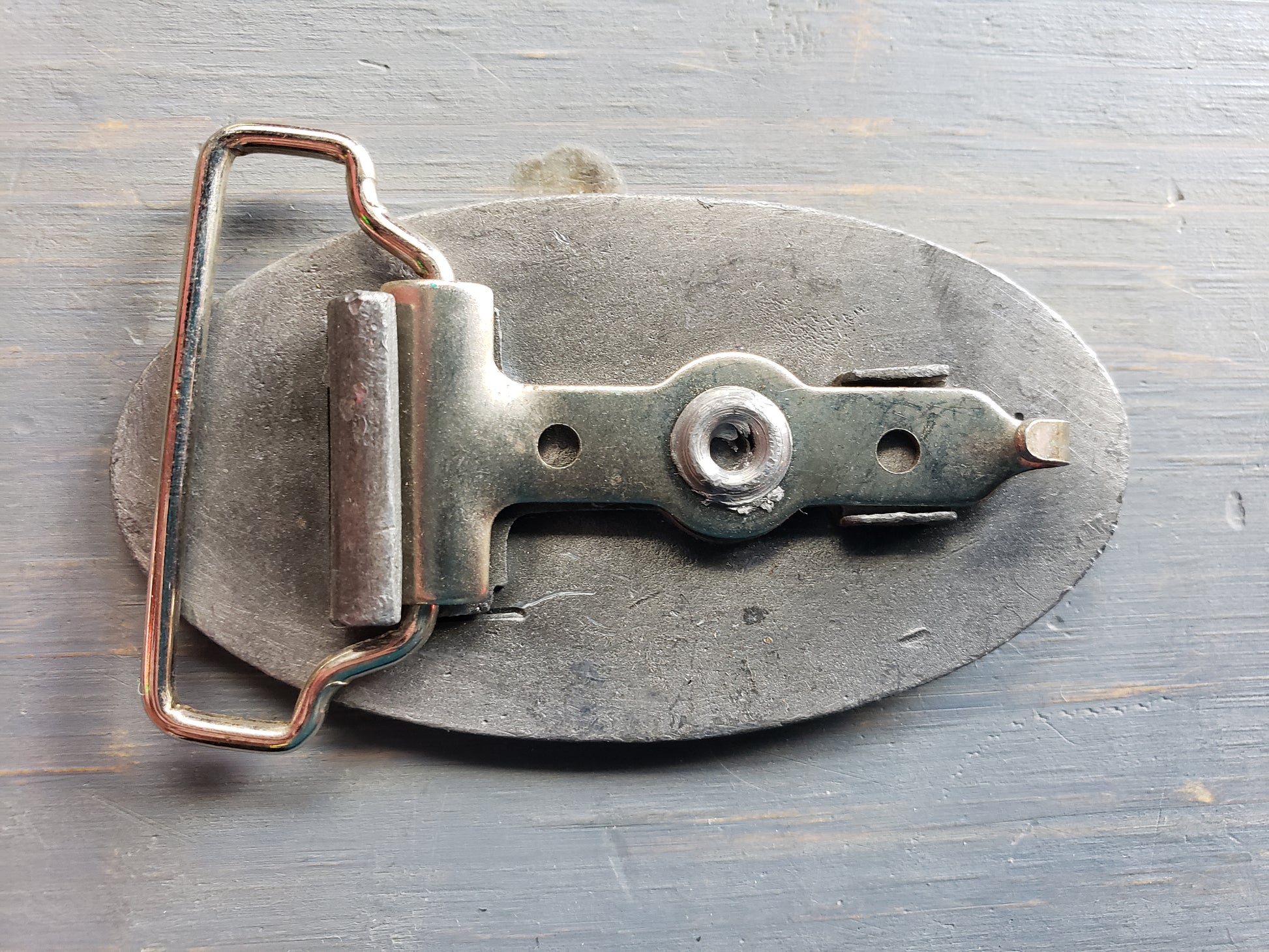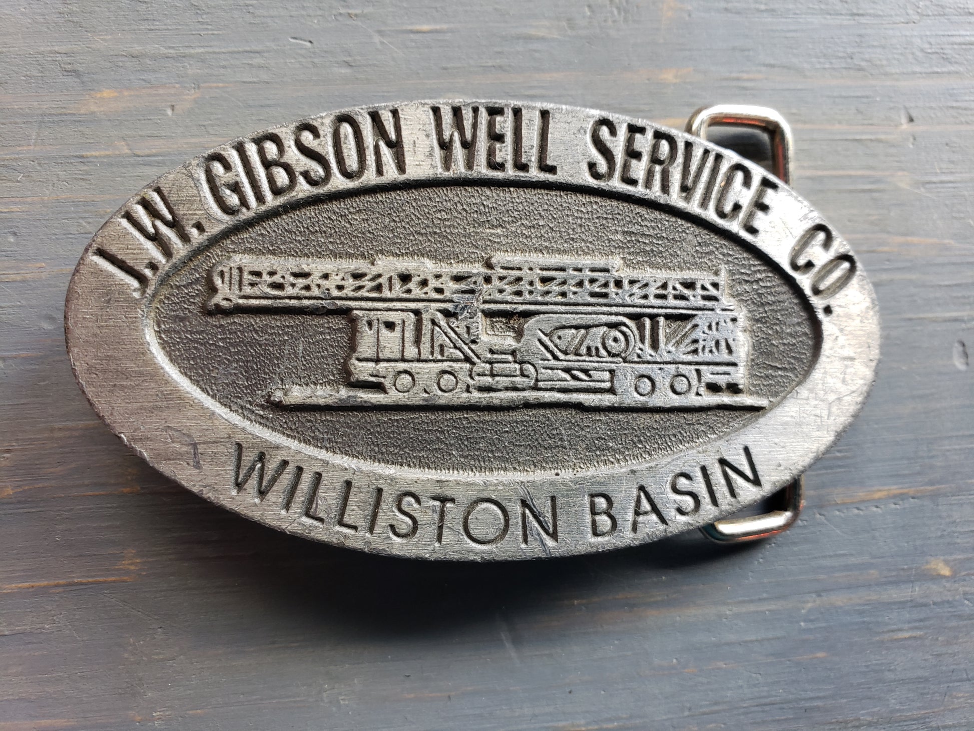 Vintage belt buckle from Williston, North Dakota advertising J.W. Gibson Well Service. Sturdy metal buckle in fair vintage condition. Features a rig truck as the logo.