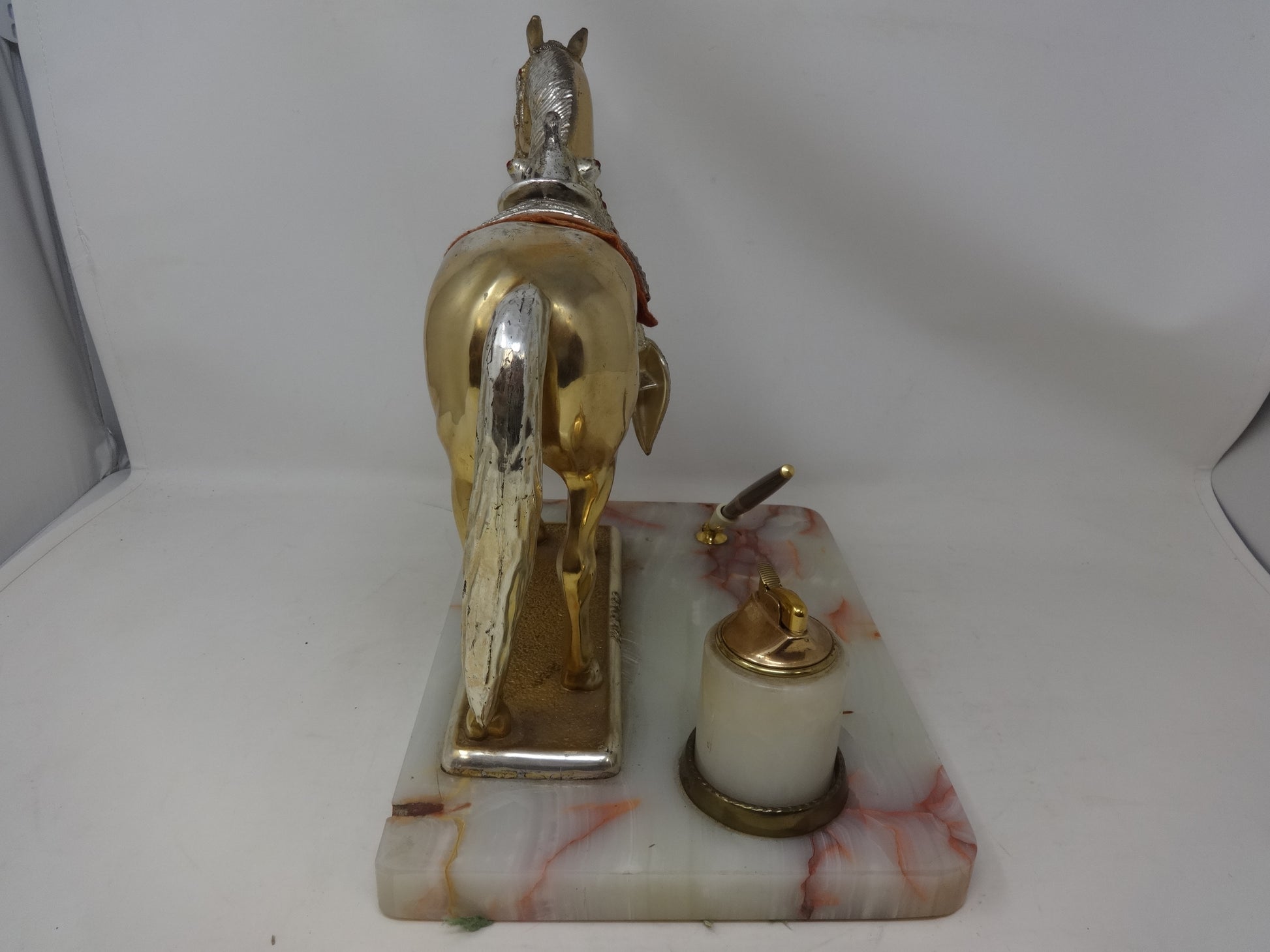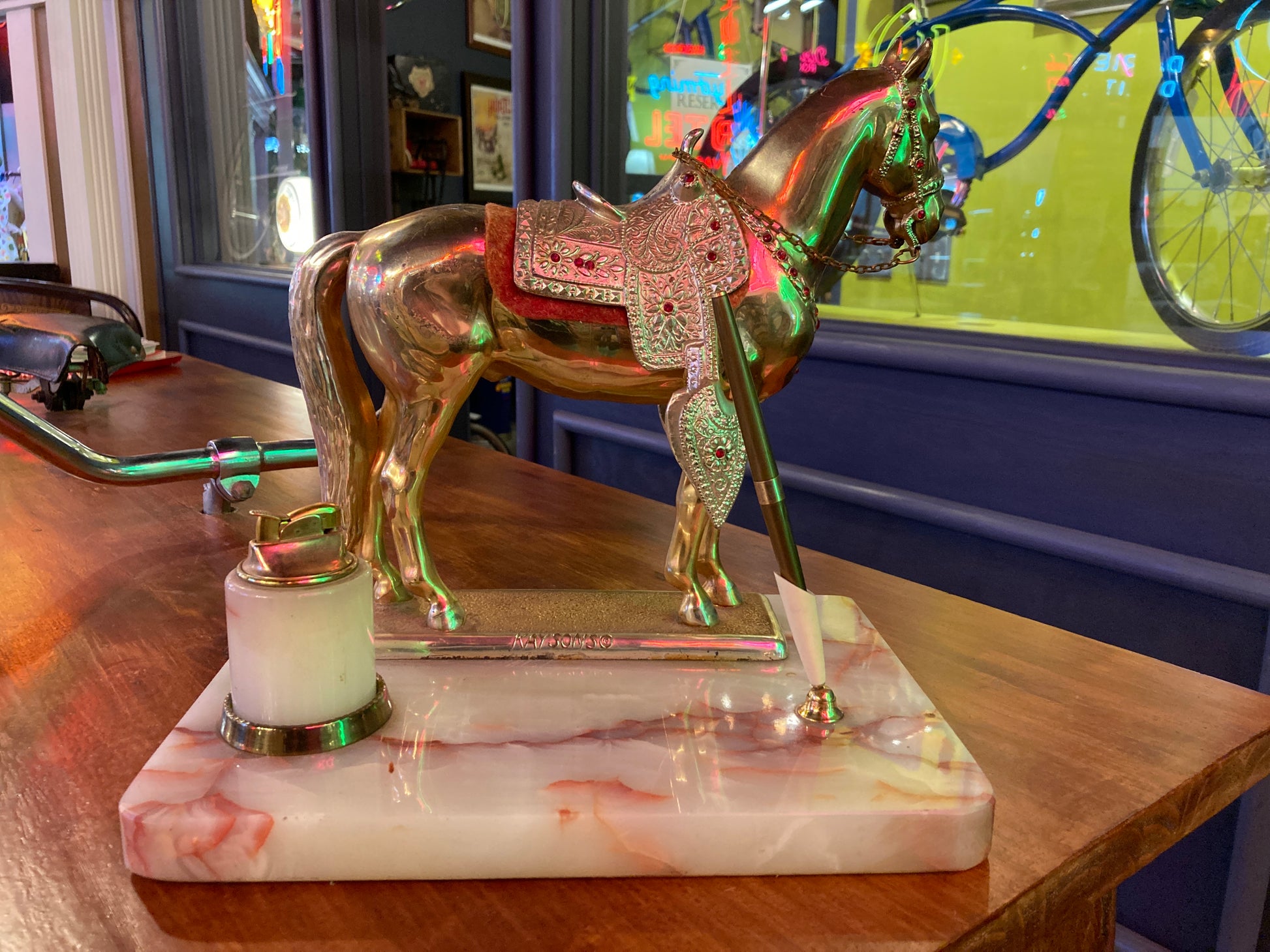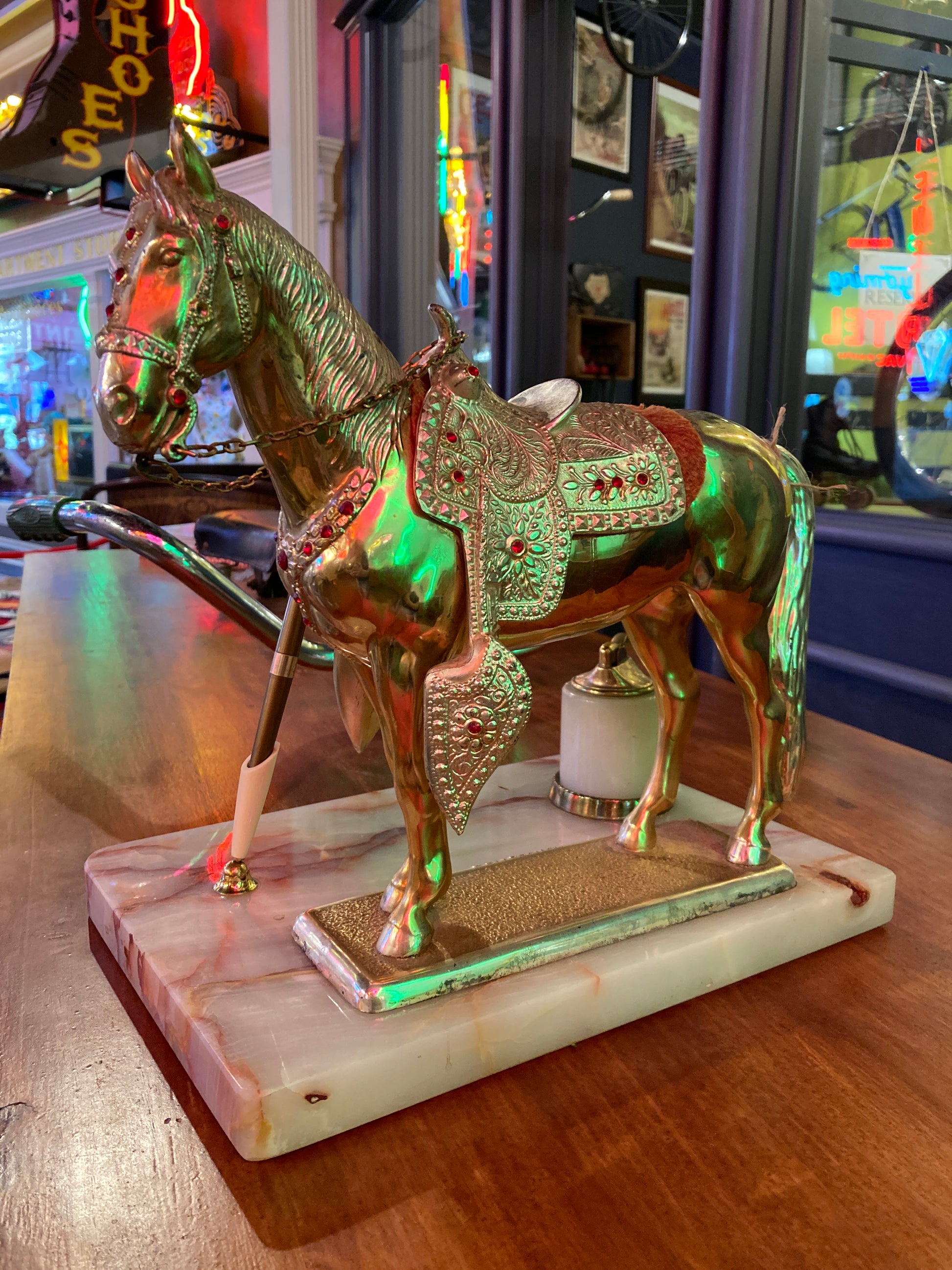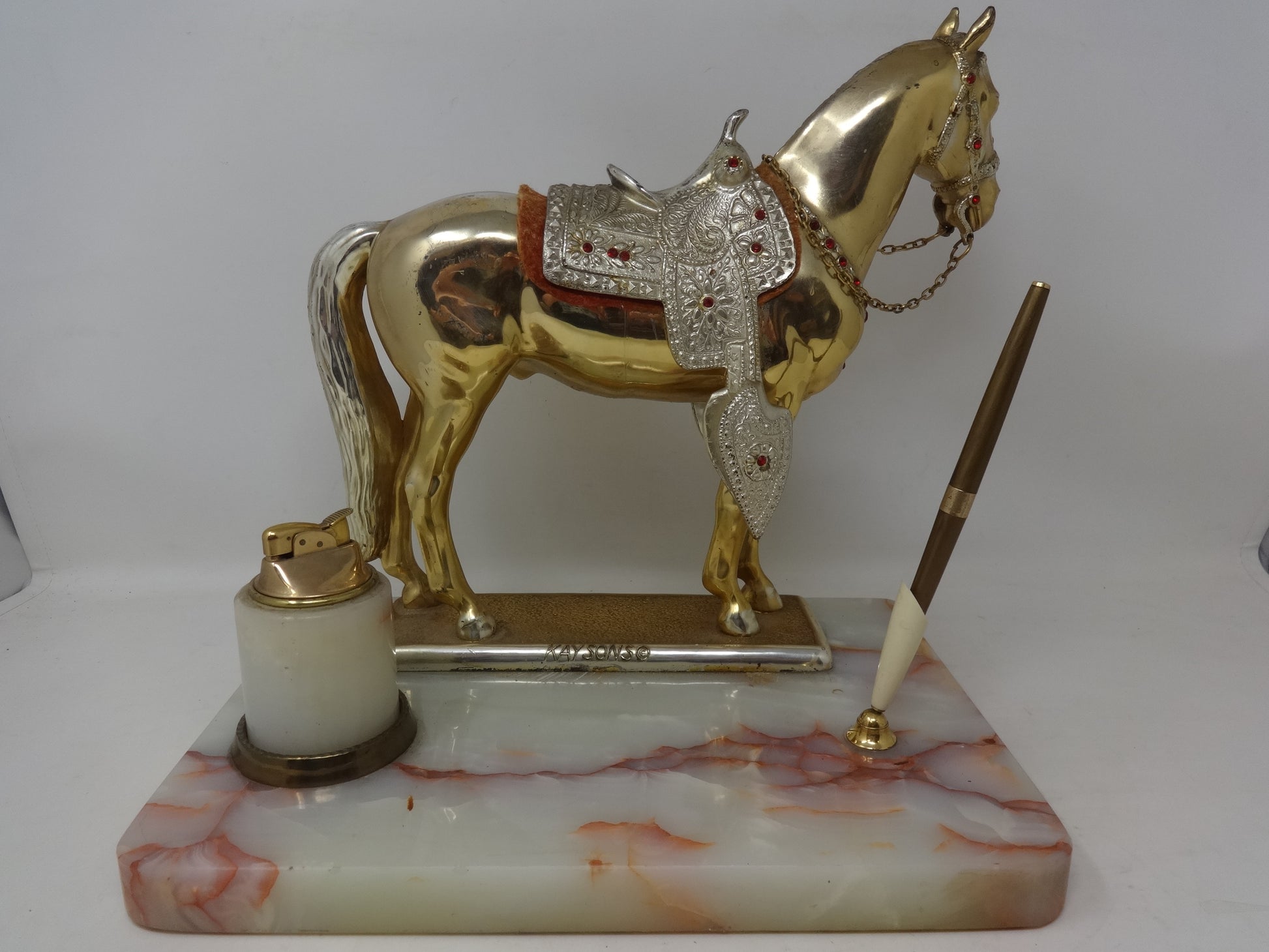 Easily imagine this sitting on a rancher's desk! Bronze bejeweled brass horse on a marble base with a marble table lighter and pen holder. The saddle is embossed Kaysons inside as well. Circa late 1930s to early 1940s. Great Western history piece in fair vintage condition. Weighs 20 pounds! Recently reduced price!