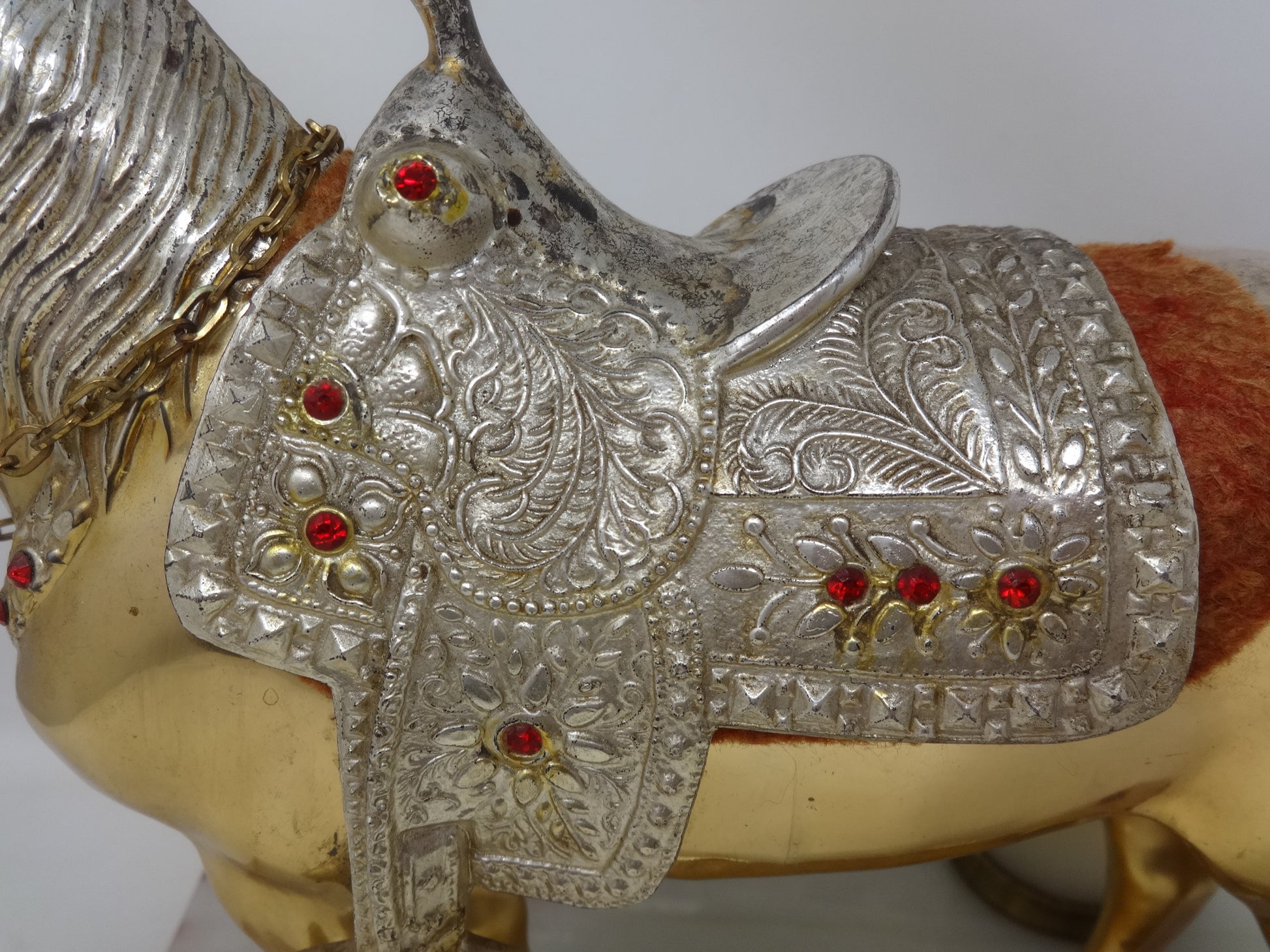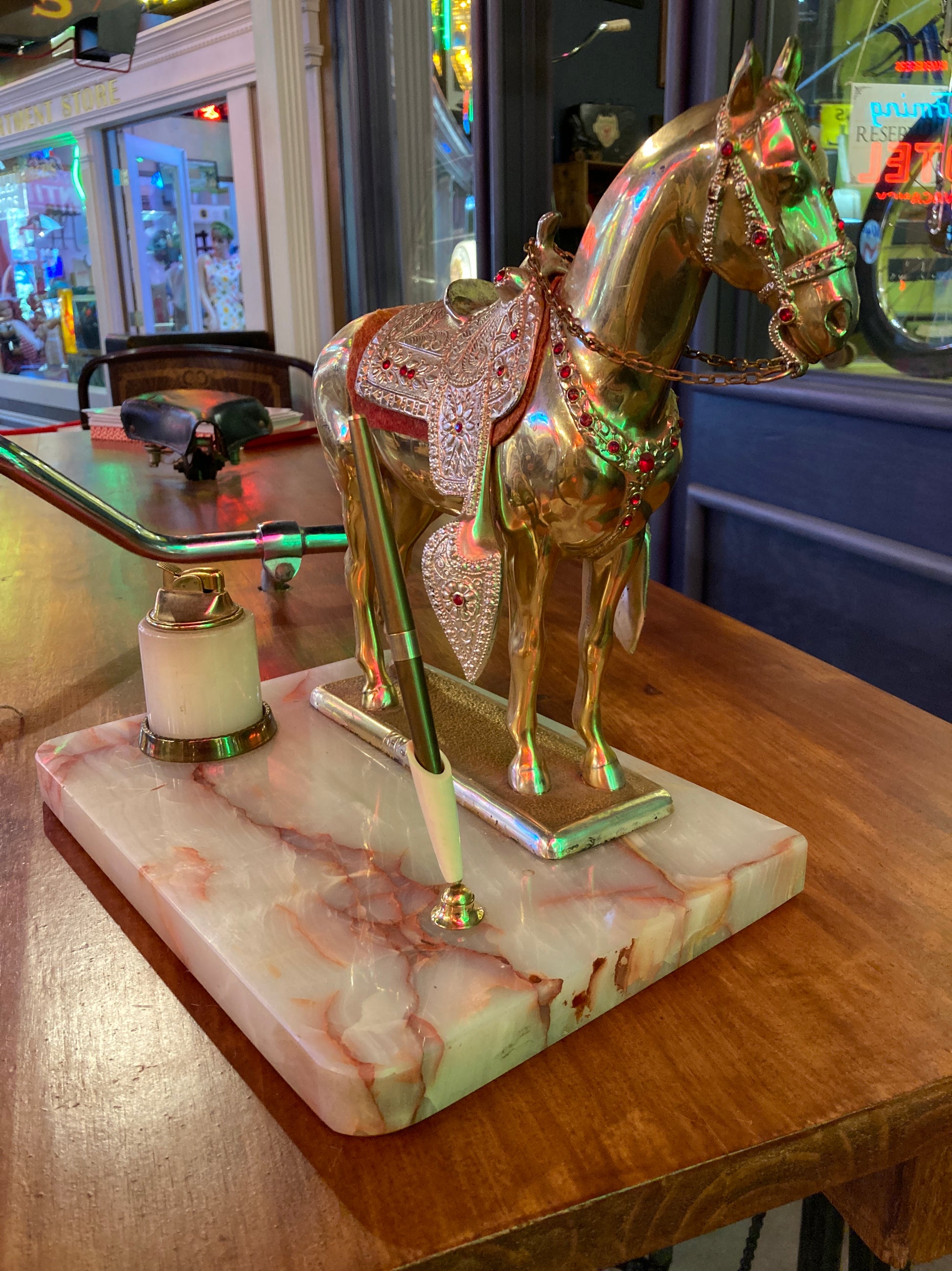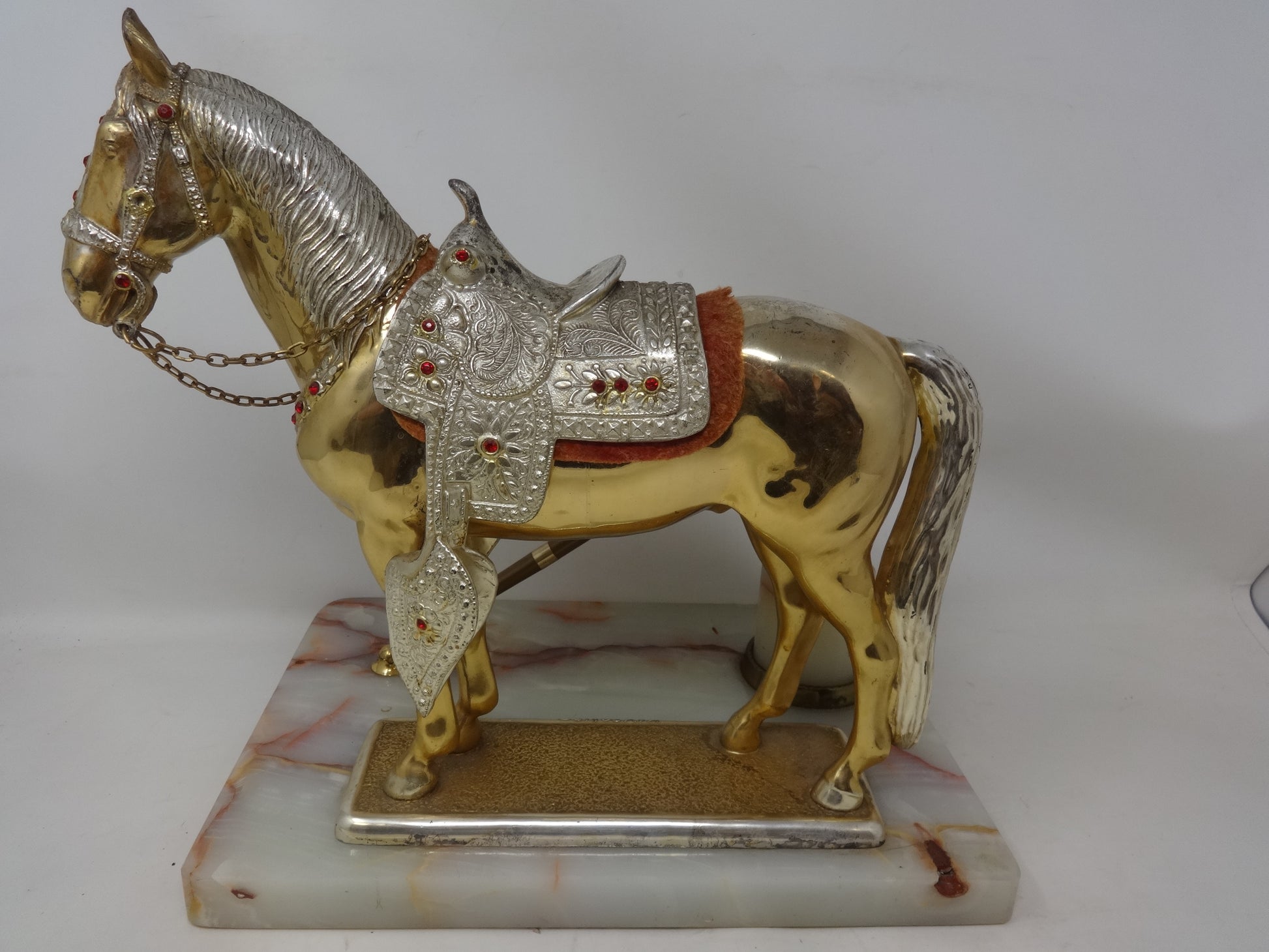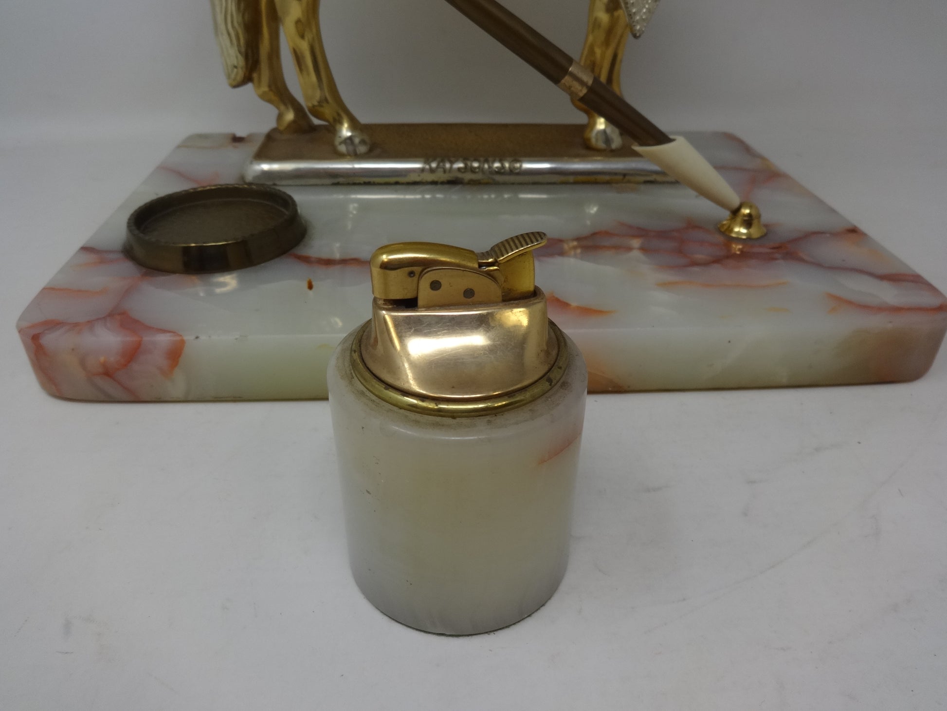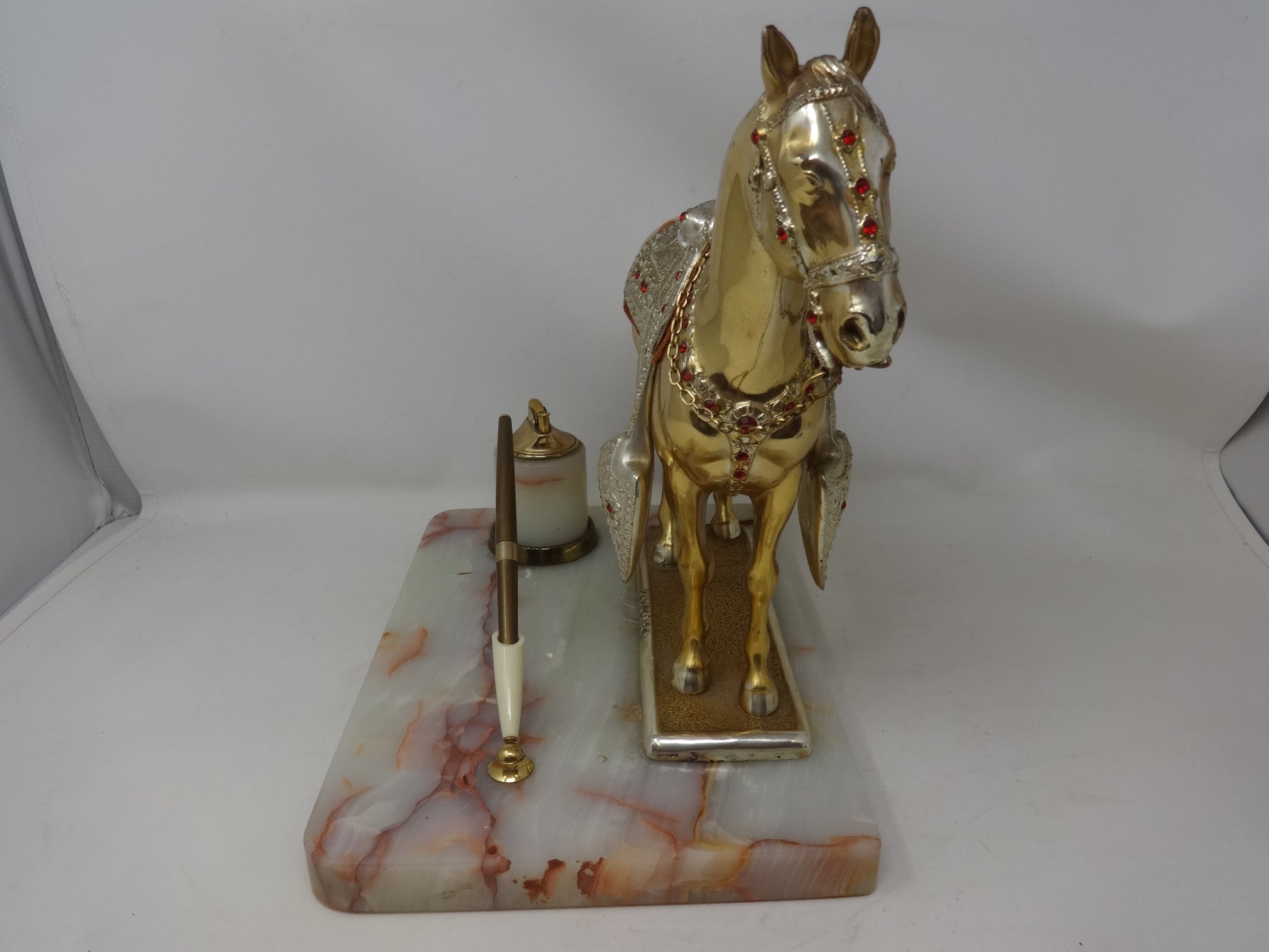 Easily imagine this sitting on a rancher's desk! Bronze bejeweled brass horse on a marble base with a marble table lighter and pen holder. The saddle is embossed Kaysons inside as well. Circa late 1930s to early 1940s. Great Western history piece in fair vintage condition. Weighs 20 pounds! Recently reduced price!