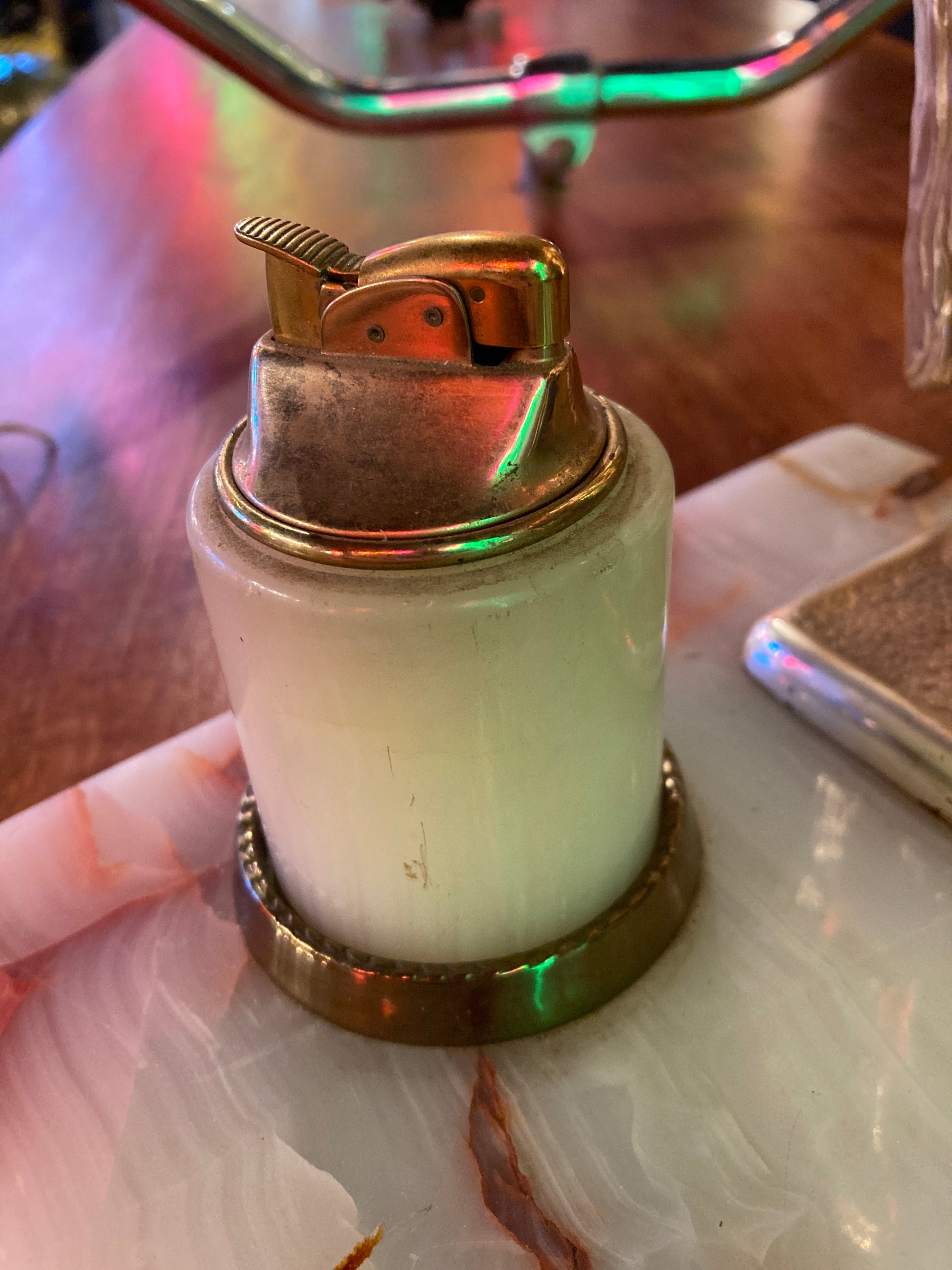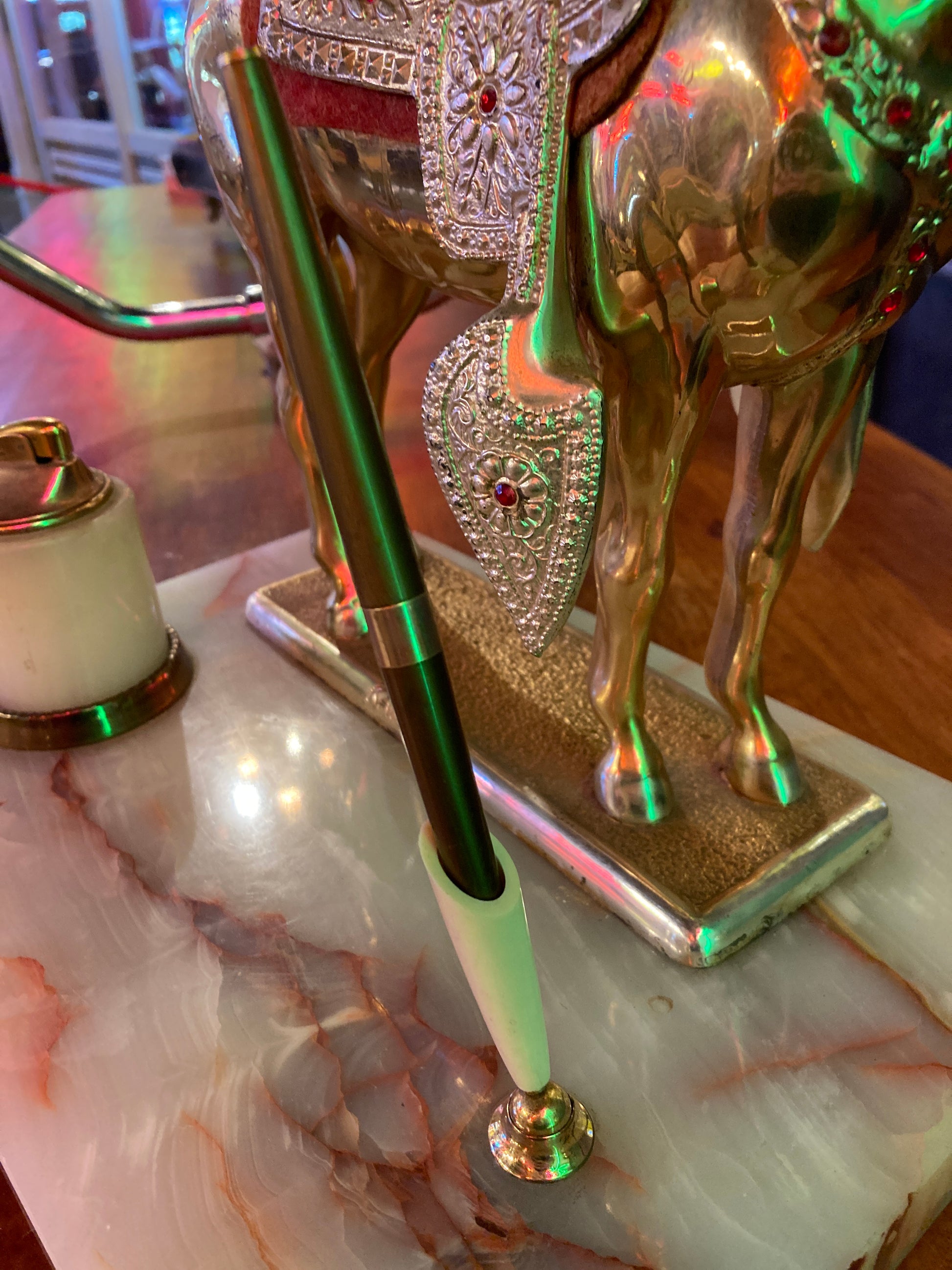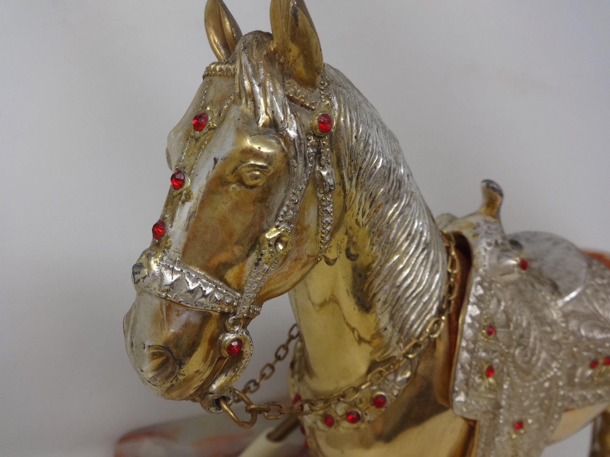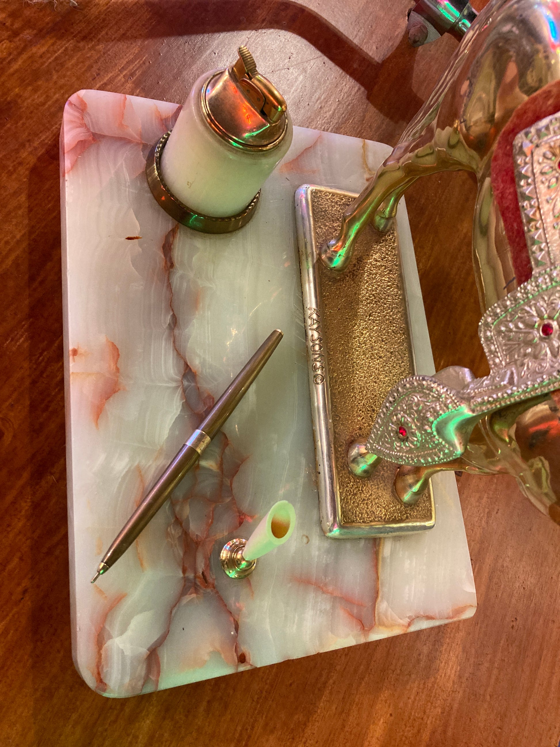 Easily imagine this sitting on a rancher's desk! Bronze bejeweled brass horse on a marble base with a marble table lighter and pen holder. The saddle is embossed Kaysons inside as well. Circa late 1930s to early 1940s. Great Western history piece in fair vintage condition. Weighs 20 pounds! Recently reduced price!