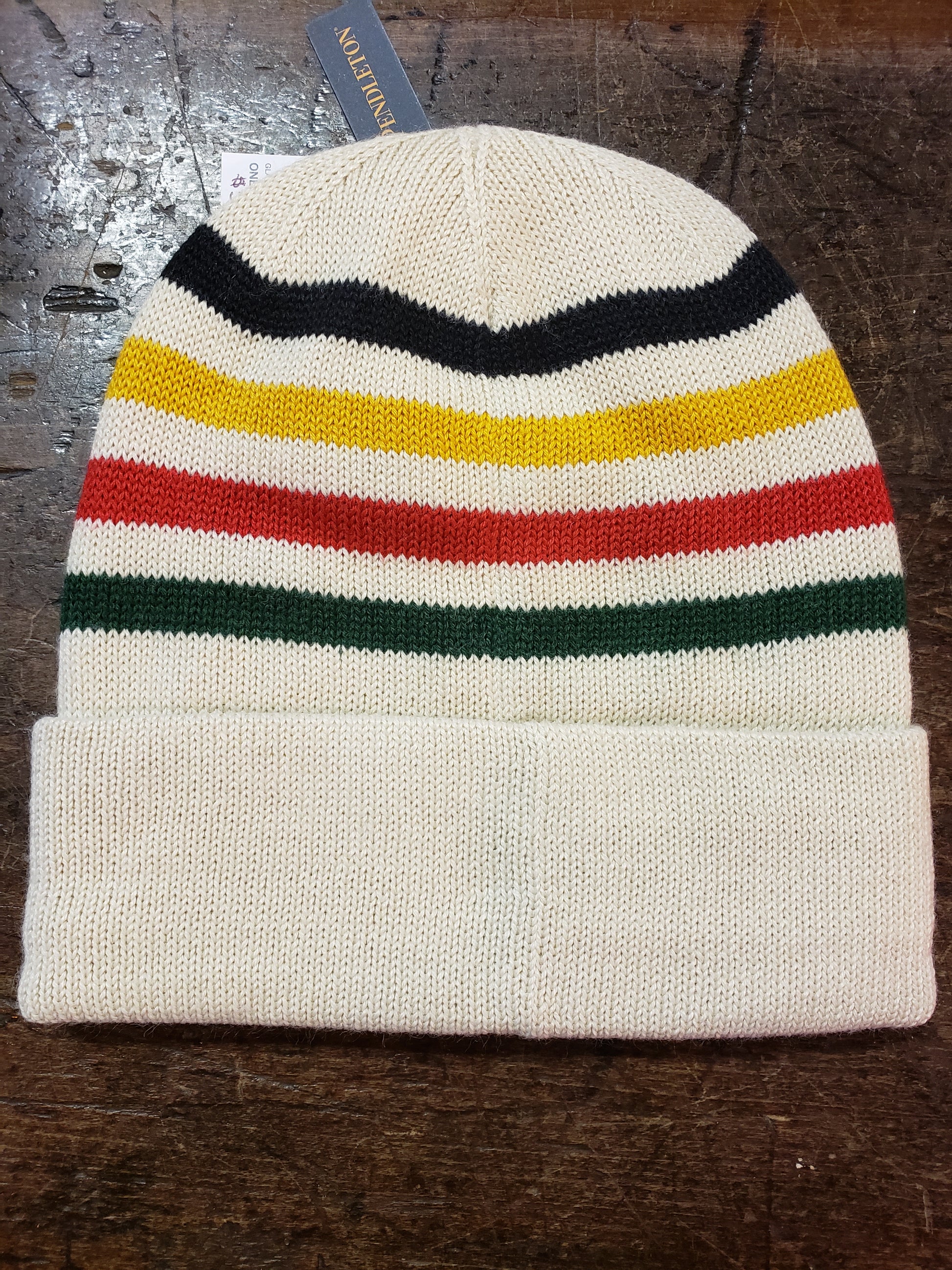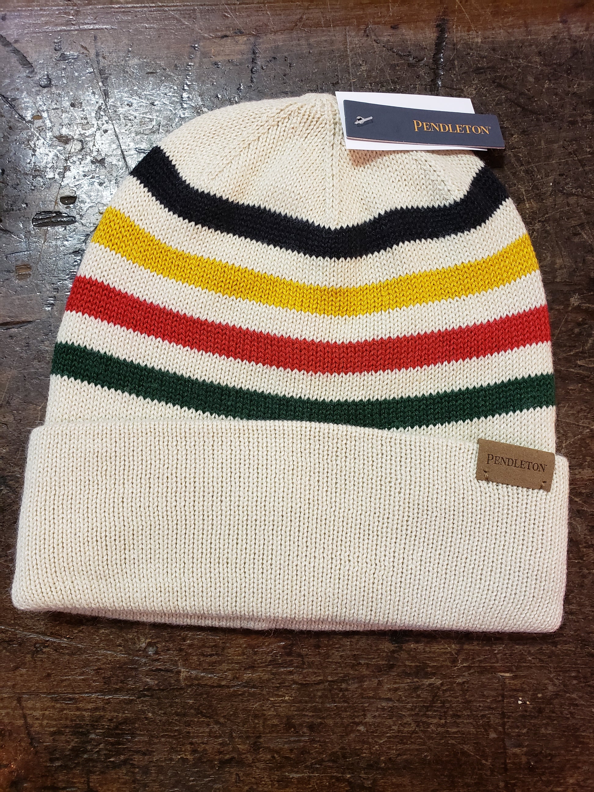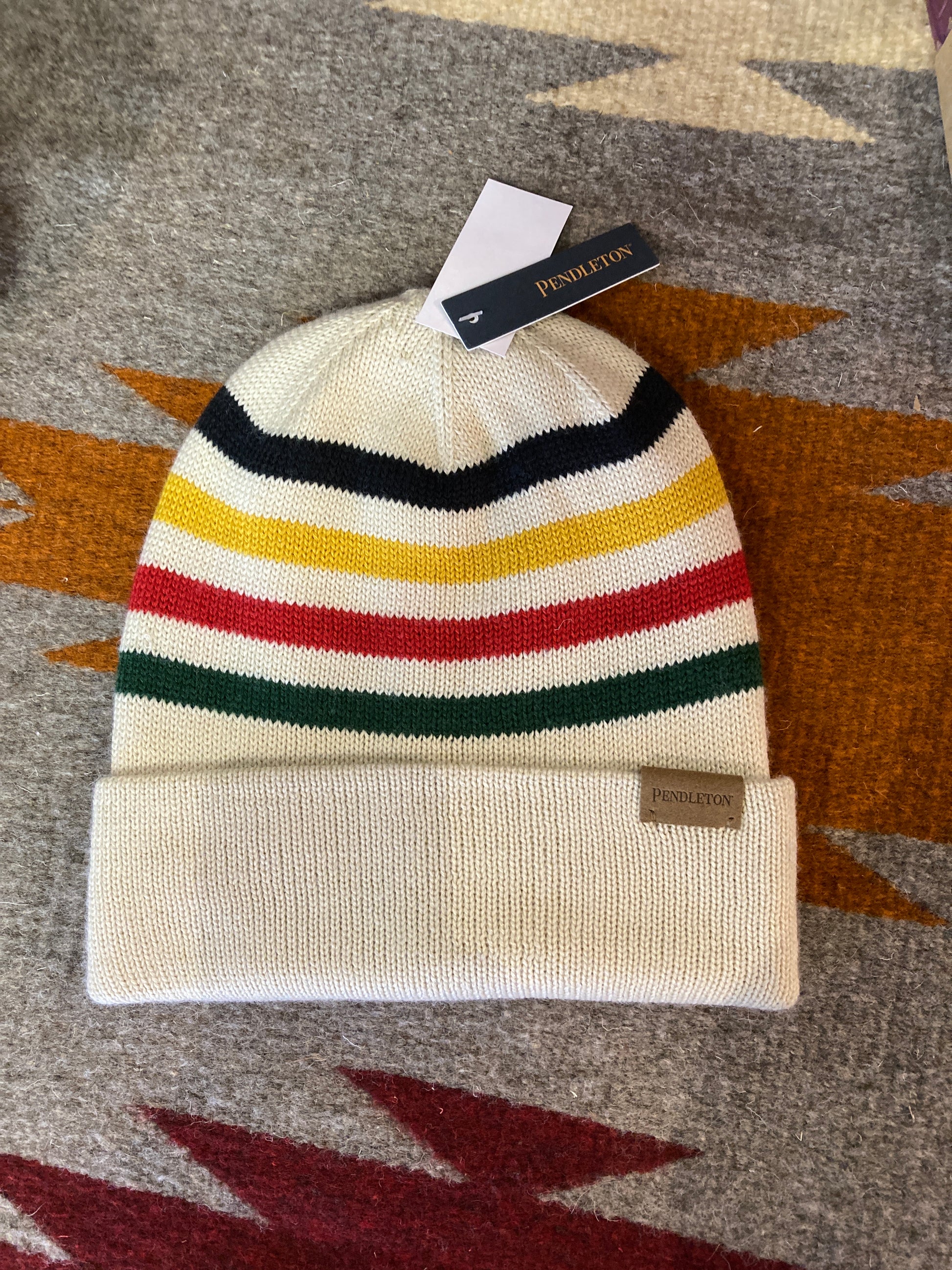 Soft and warm, this stretchy unisex ribbed knit beanie features a turn-back brim revealing a Pendleton logo patch. one size.