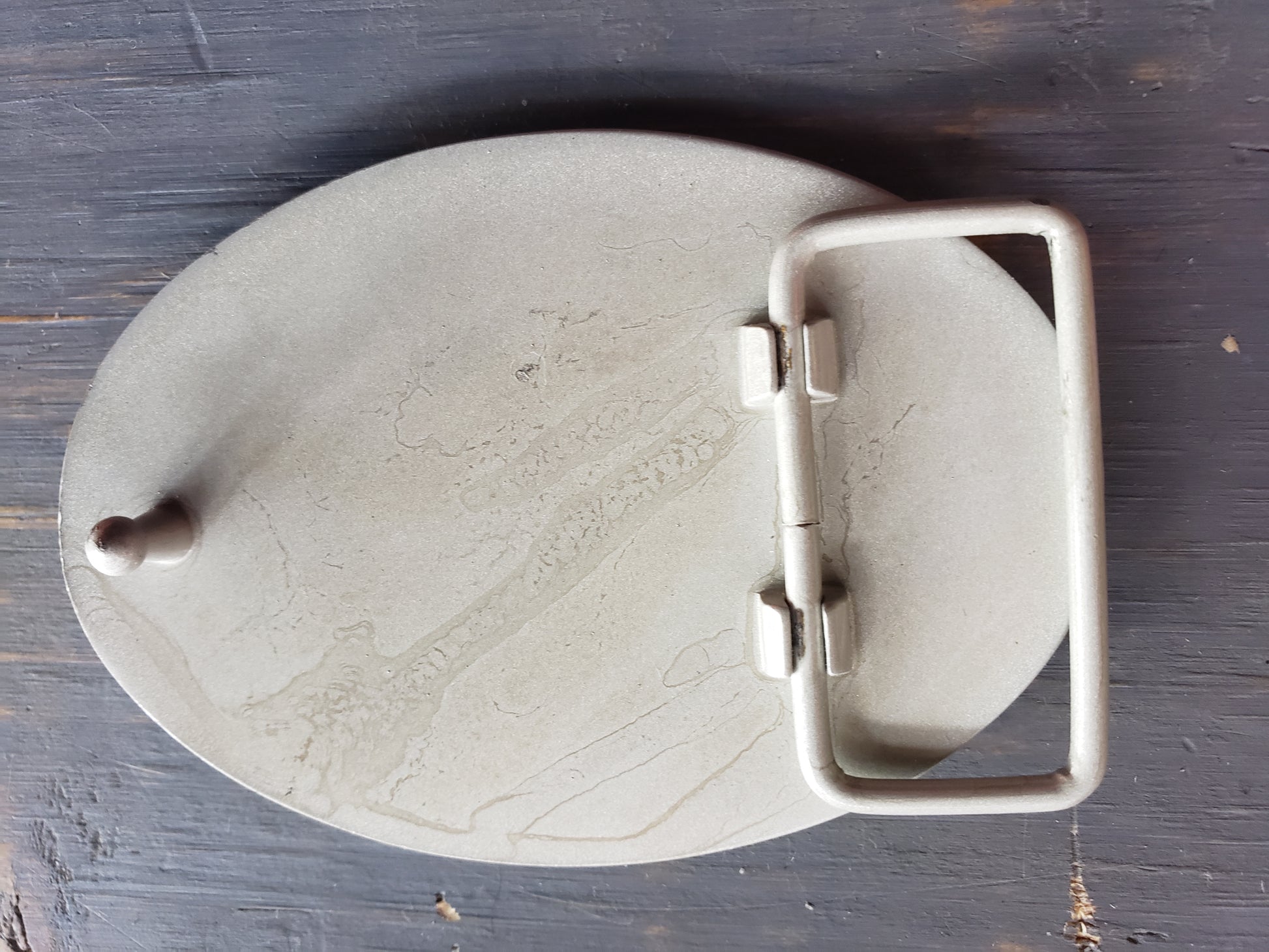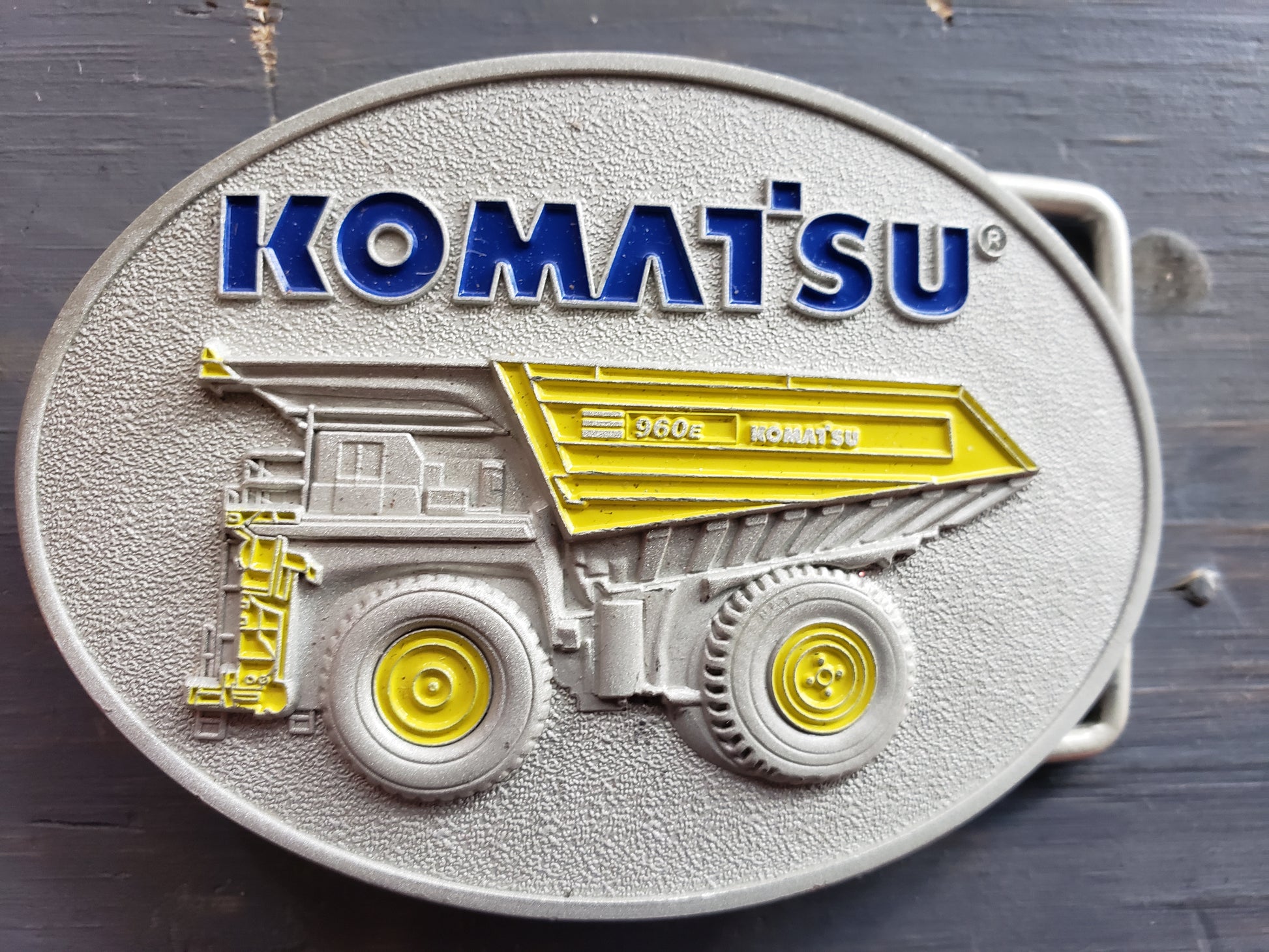 The KOMATSU Dump Truck belt buckle features a silver background accented with bold blue enamel lettering and vibrant yellow enamel details on the dump truck design. This eye-catching accessory combines rugged style with distinctive colors, making it a perfect statement piece for enthusiasts and professionals alike. Elevate your look with a buckle that stands out and celebrates heavy machinery craftsmanship. Fair vintage condition.